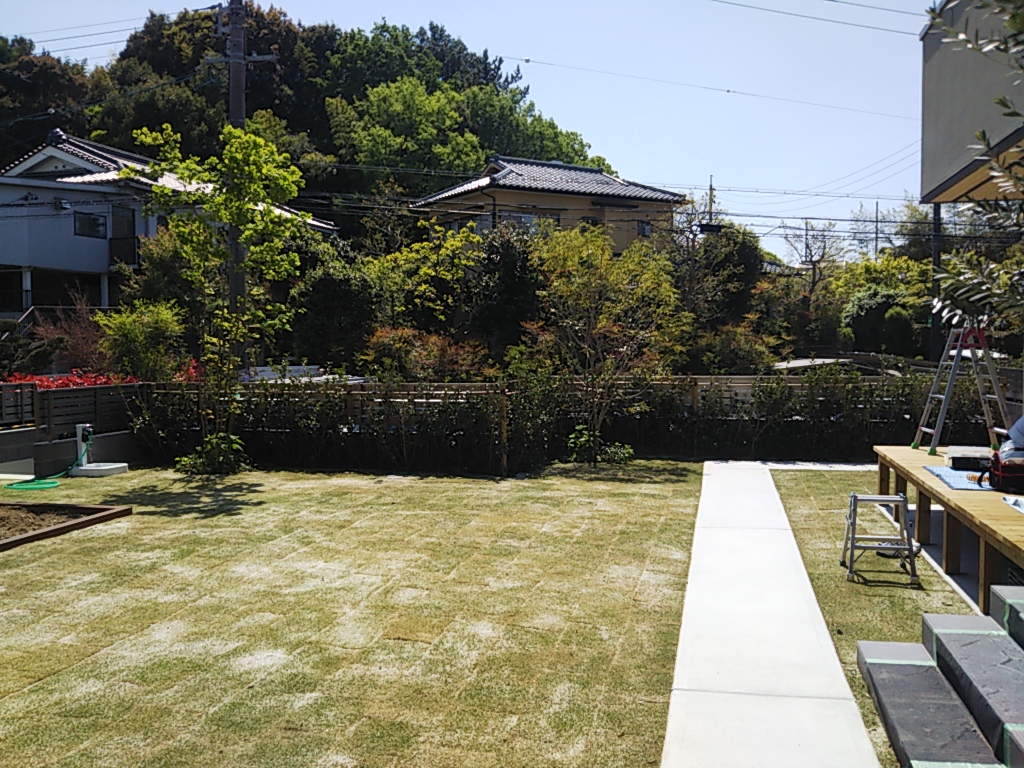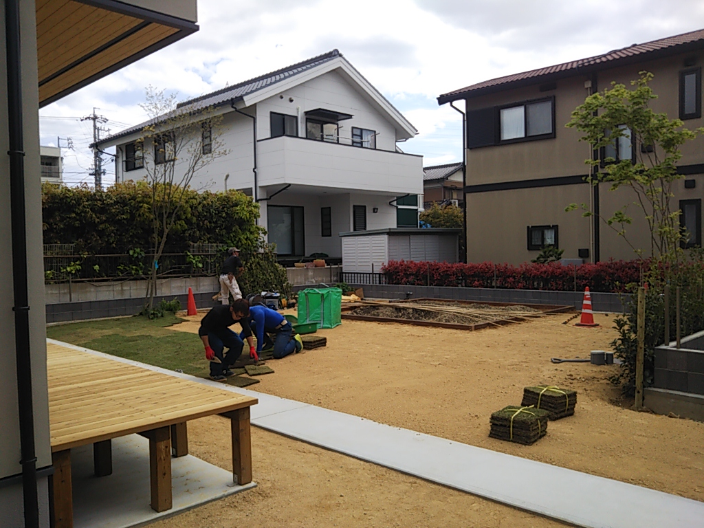 庭では植栽業者さんが最後の仕上げ、芝を敷いています。これだけの広い庭に一面の緑。うらやましいですな。
