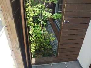 がら空きだった坪庭の囲いにも扉が付きました。格子で目隠しする傍ら、庭木の手入れはここから出入りします。
