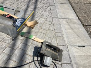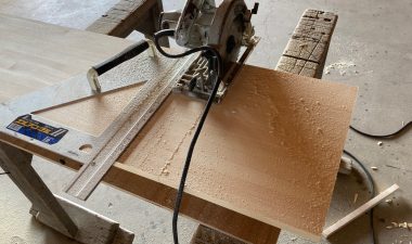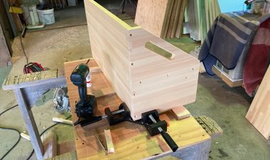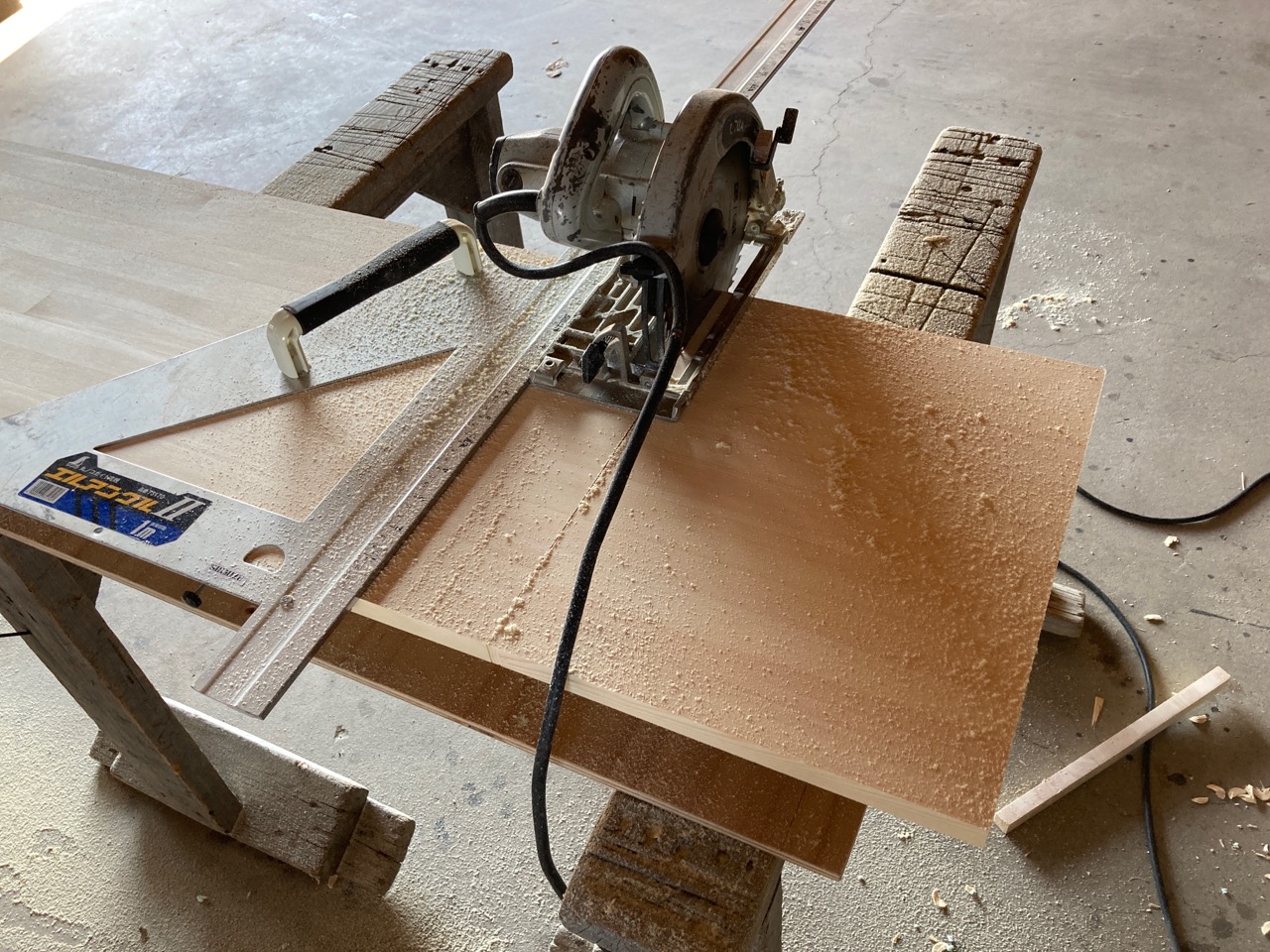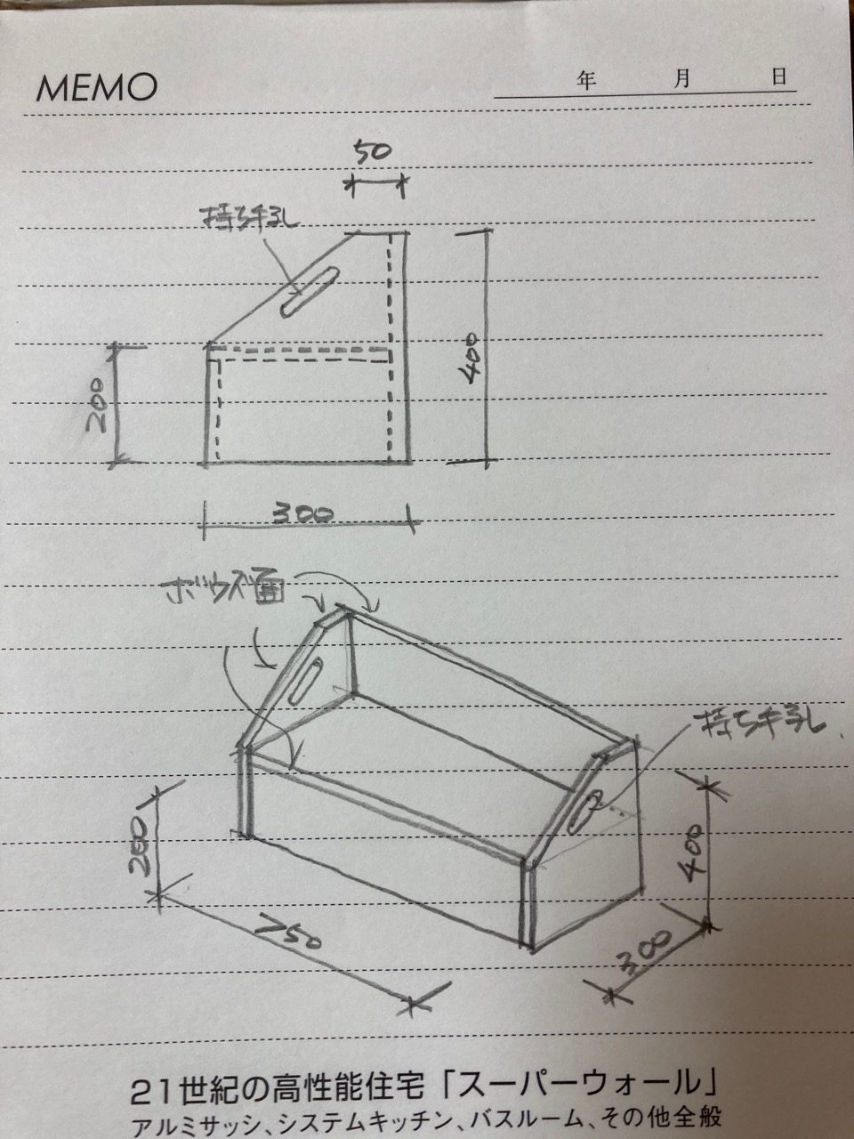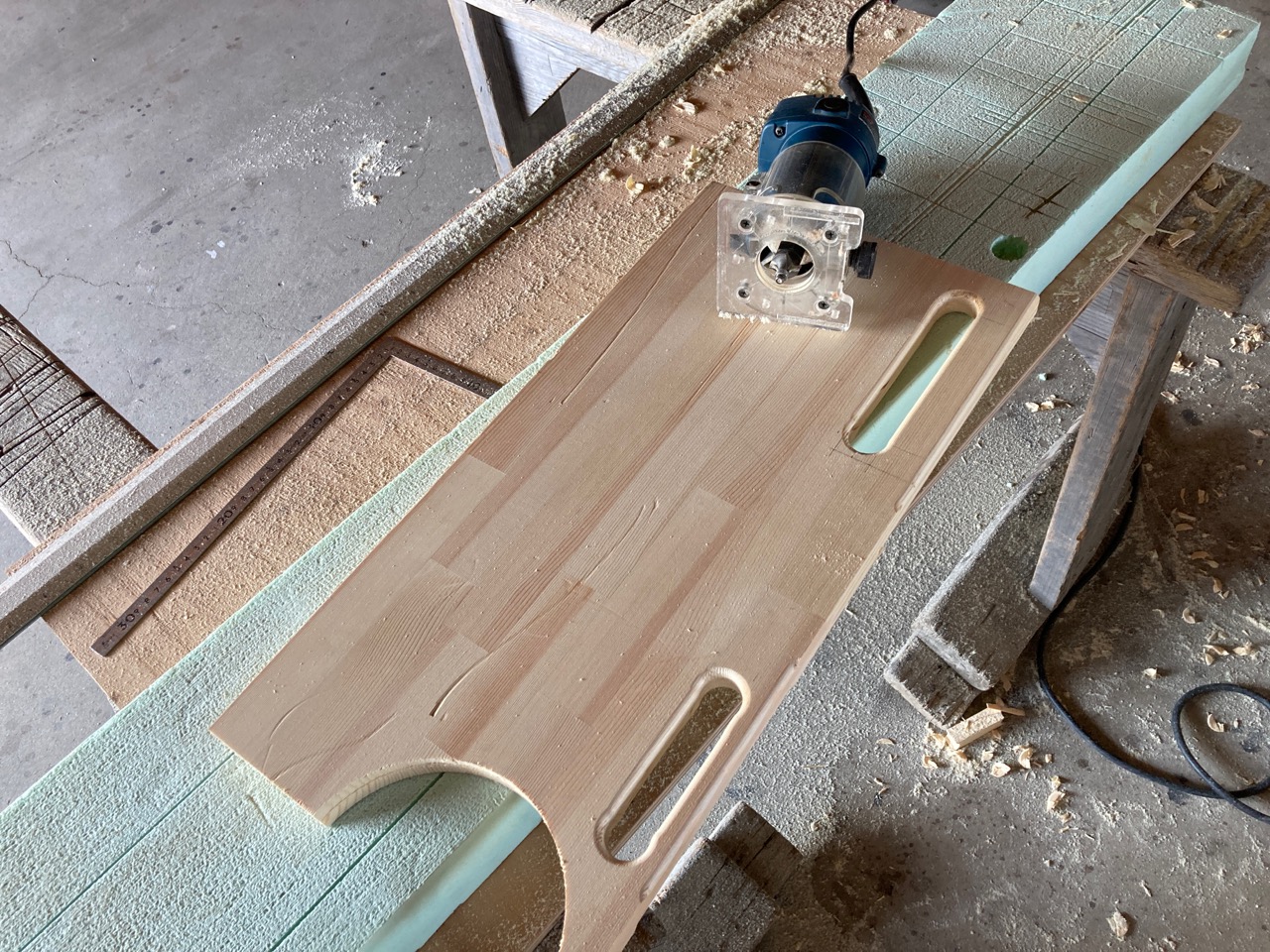 材料を切り出します。常時置いておく台ではなく、部屋の隅にしまったりするので簡単に移動する必要があり、その際に持ち手となる穴を開けておきます。持ちやすい開口と残りの寸法はどのくらいか、面の落し方は・・・など余った材料で少し練習します。