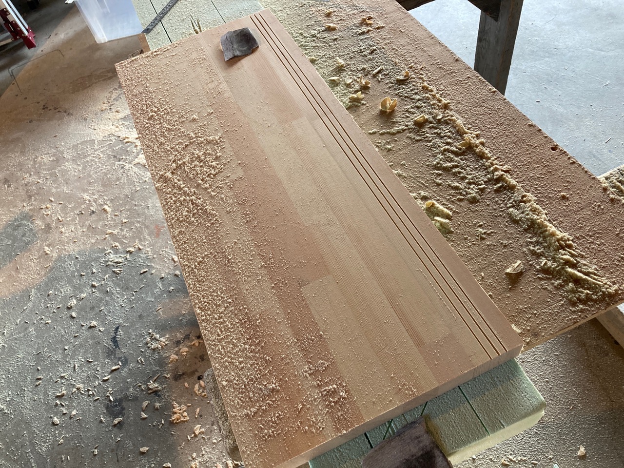 ステップ台なので階段のノンスリップ代わりに深さ1㎜ほどの溝を突いておきます。特に冬場など靴下で乗った際には滑る事も考えられます。