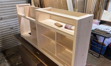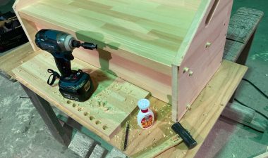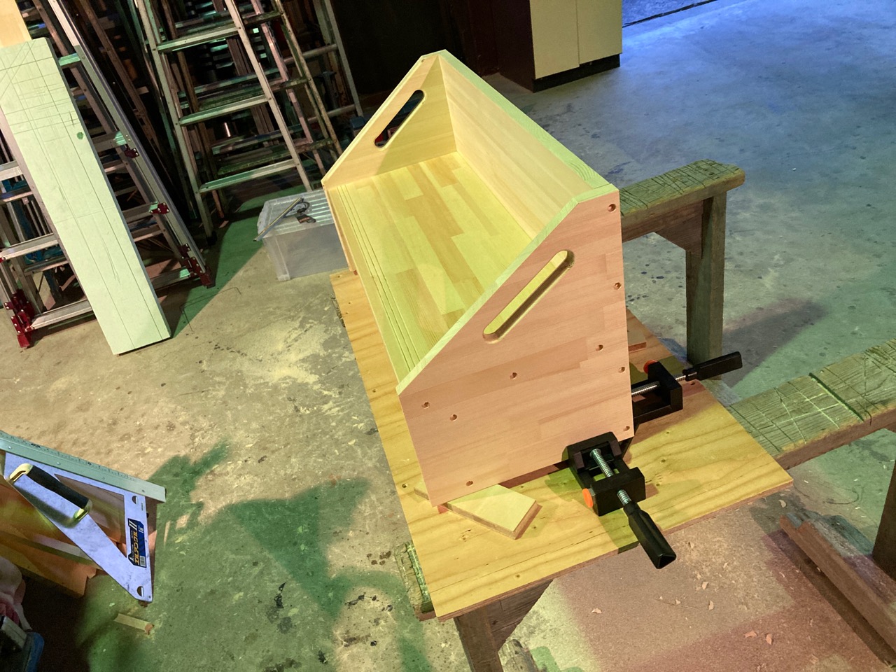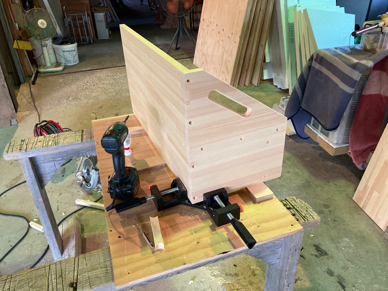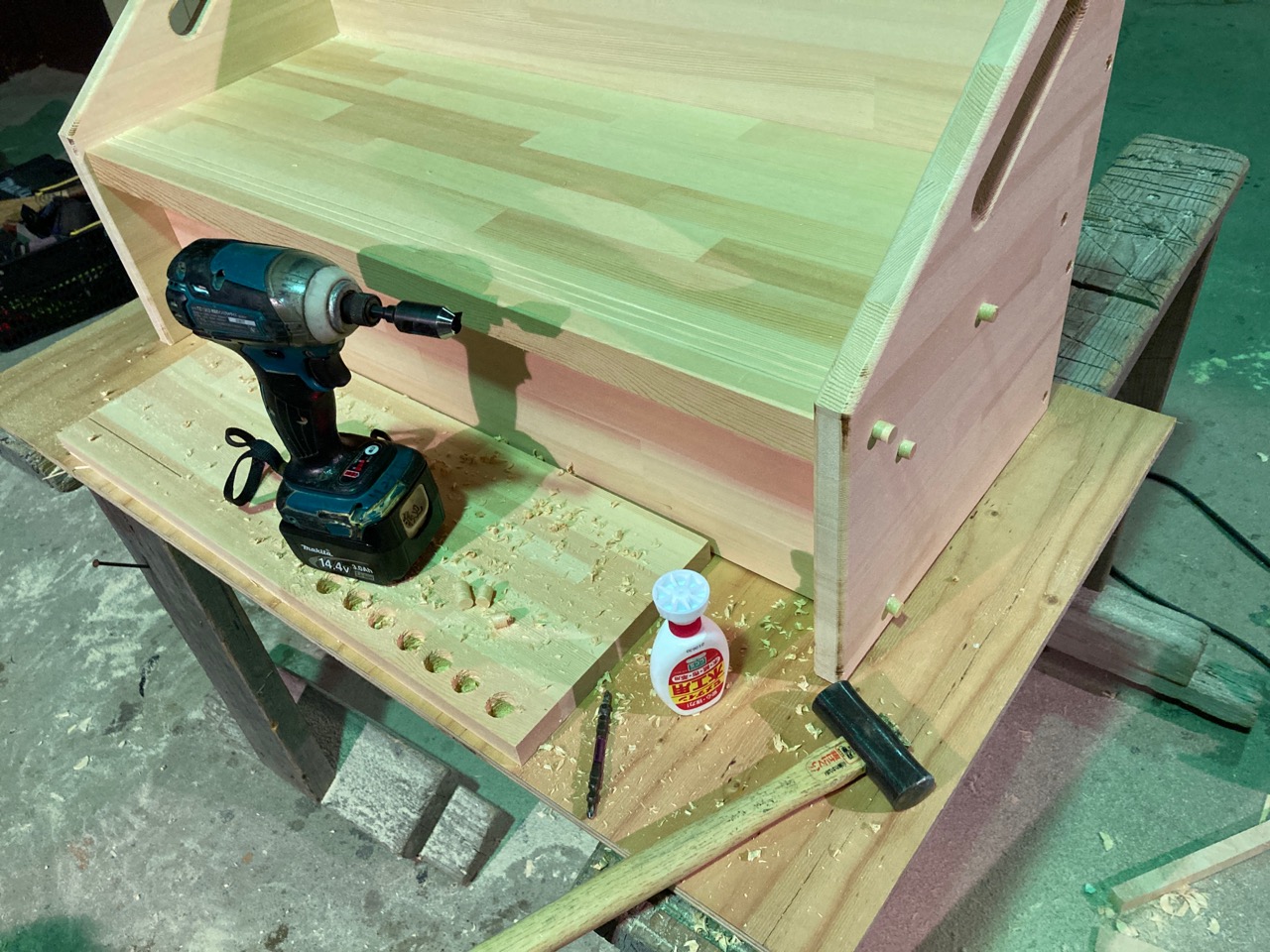だいたいを組み立て終えて、先ほどの10㎜下穴の部分には接着剤を塗った樽栓を打ち込んでおきます。と、ここで本日はタイムアップ。明日は切断面や角面をキレイに整えるための紙やすり掛け、『サンドペーパー祭り』です。