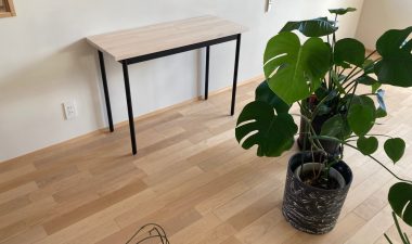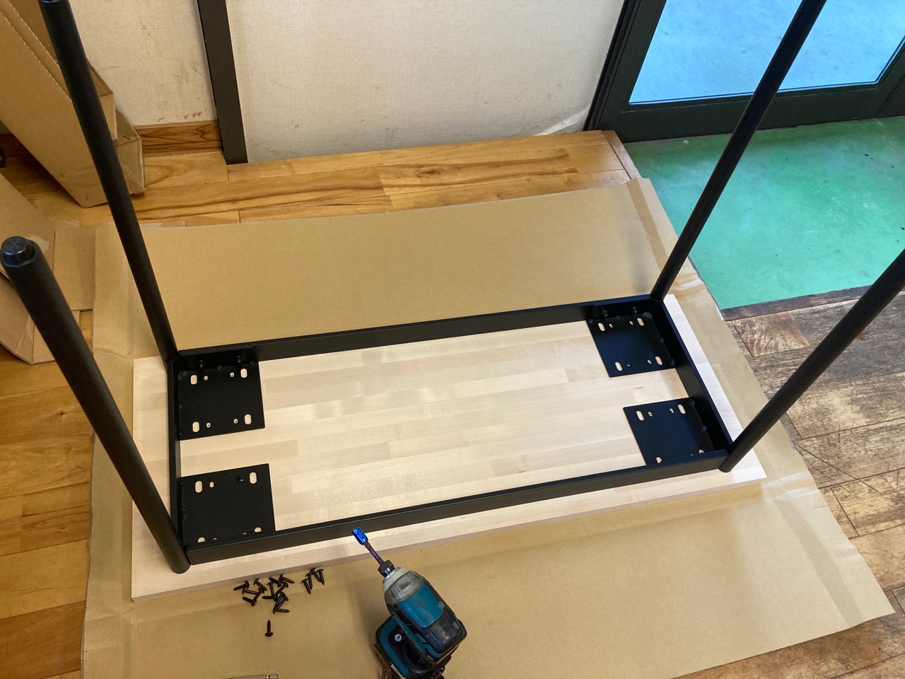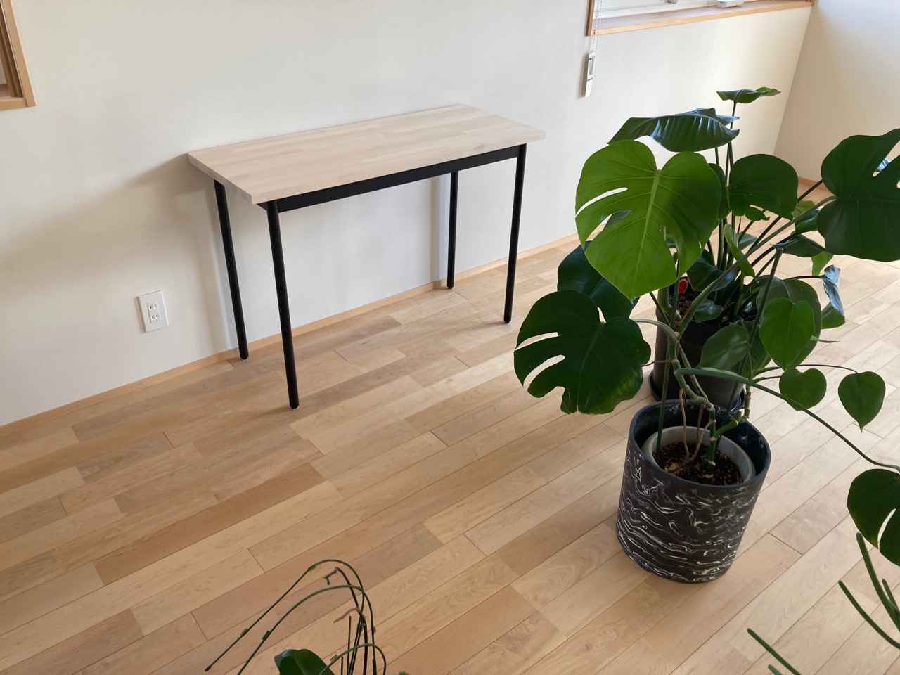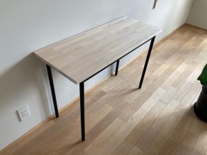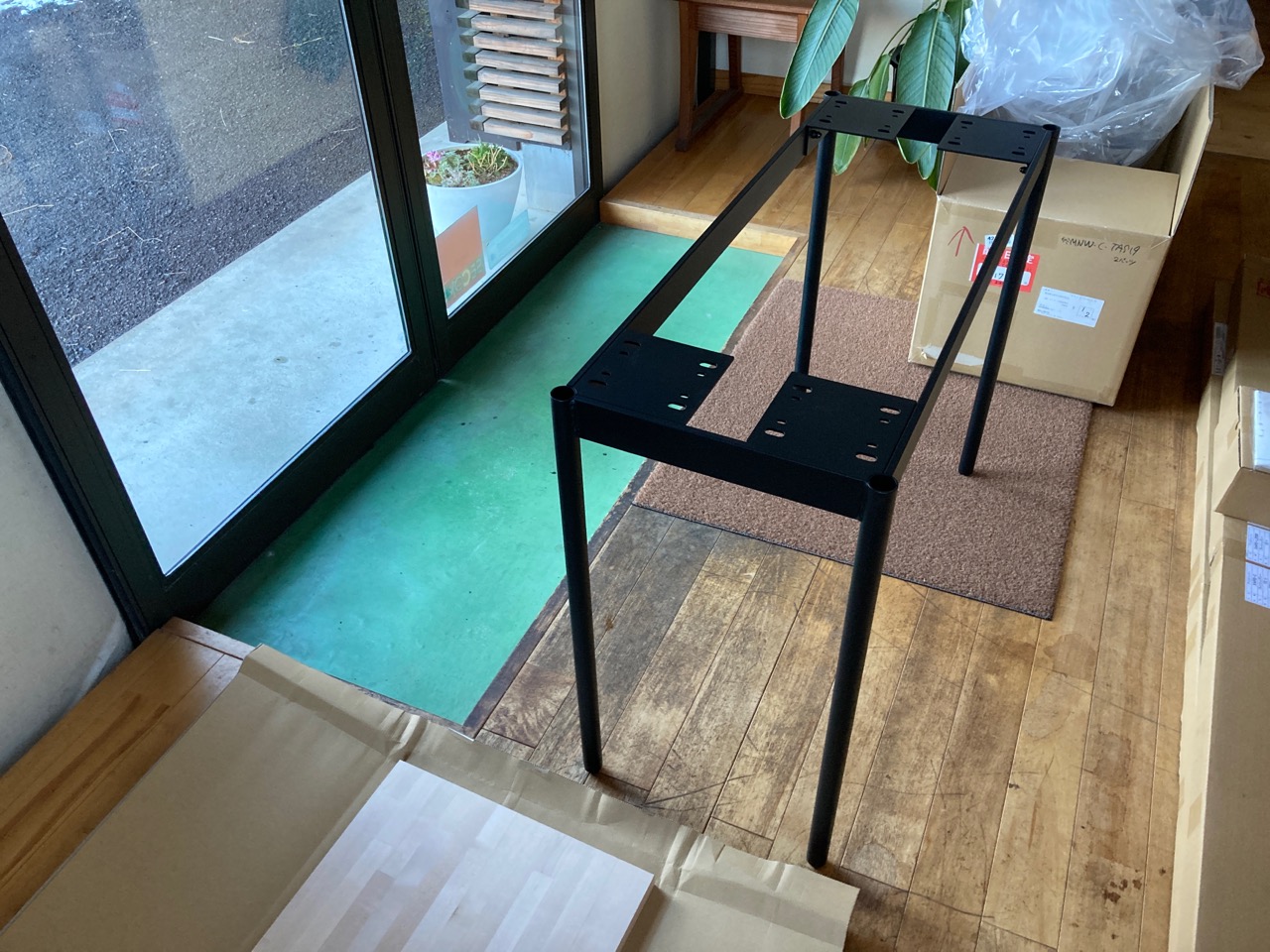『観葉植物などを飾る小テーブルが欲しい』との事でテーブルを造る事にしました。と言っても、鉄工所に依頼しておいた鉄脚と積層材の板を留め付けるだけの簡単な作業です。脚の方はこのサイズでも鉄でできているので重いのなんの。