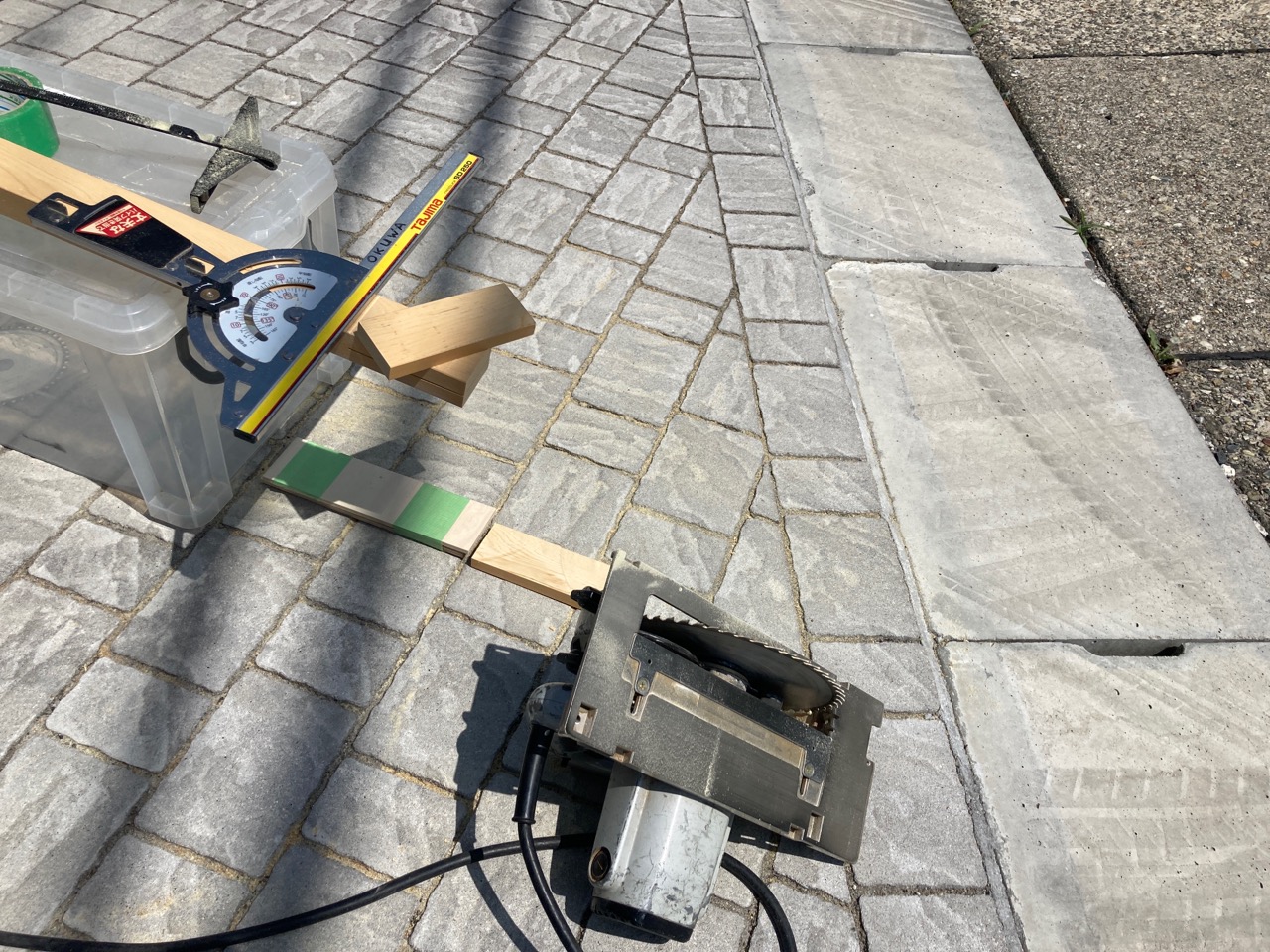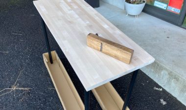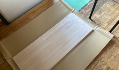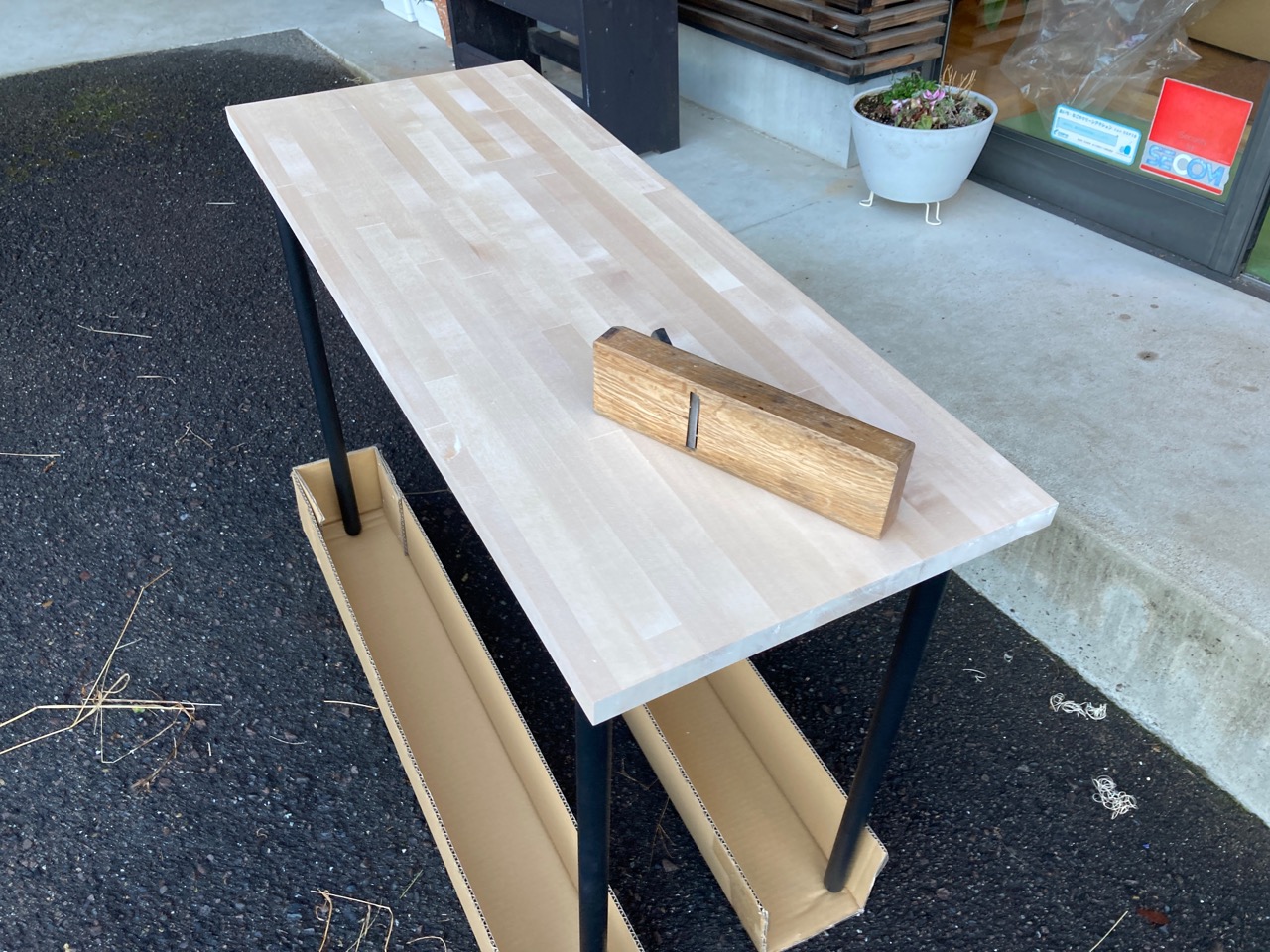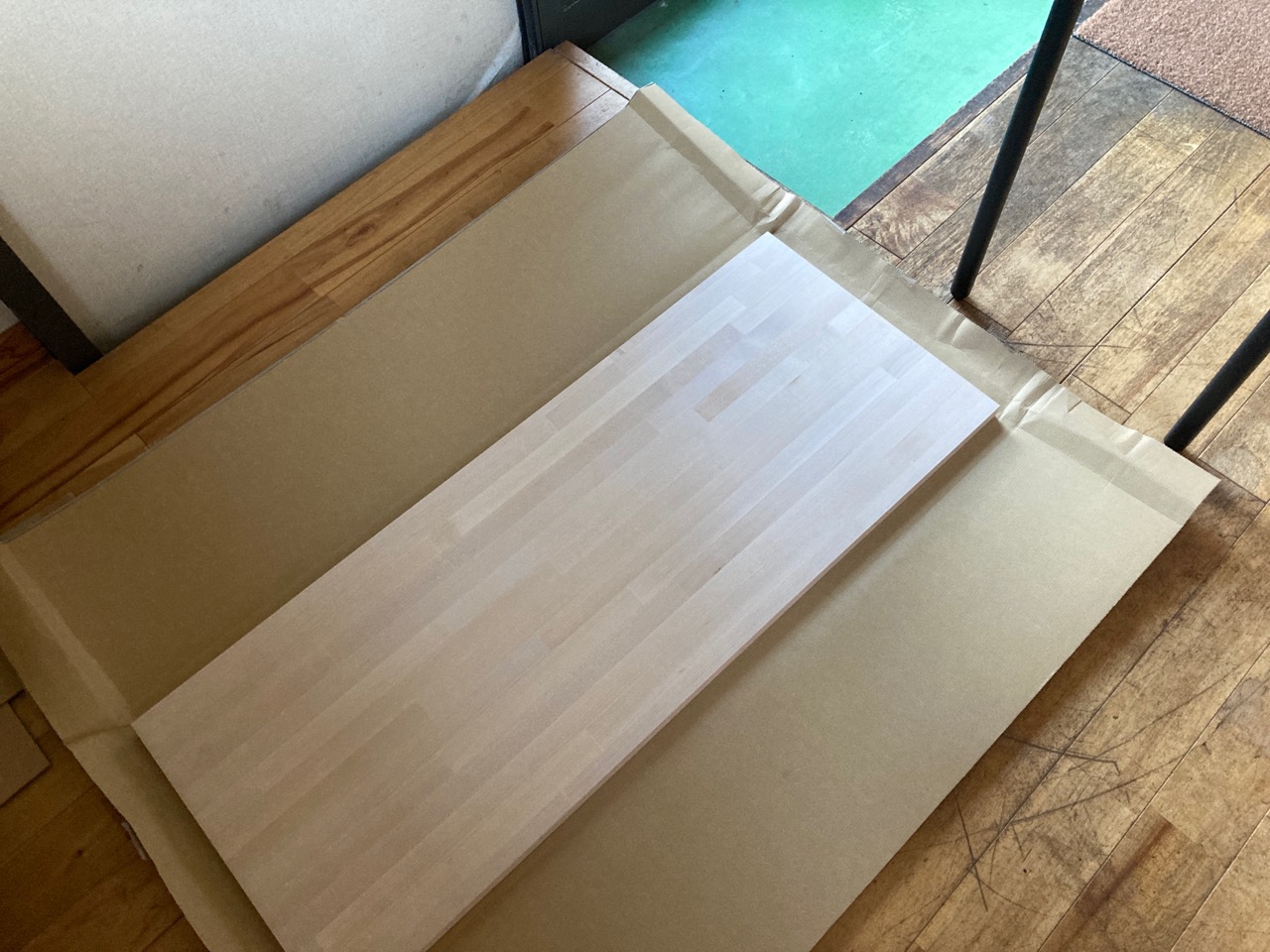 キズが付かないよう養生しながらビスで留め付け。テーブルの角はまだ切り放しですのでカンナで糸面をとって出来上がりです。筆者のカンナは大工さんの見よう見まねでかけているのみですので、切れ味なく糸面を取るのがせいぜいです。木口面はサンドペーパーで糸面をとります。