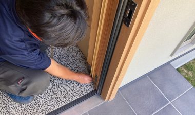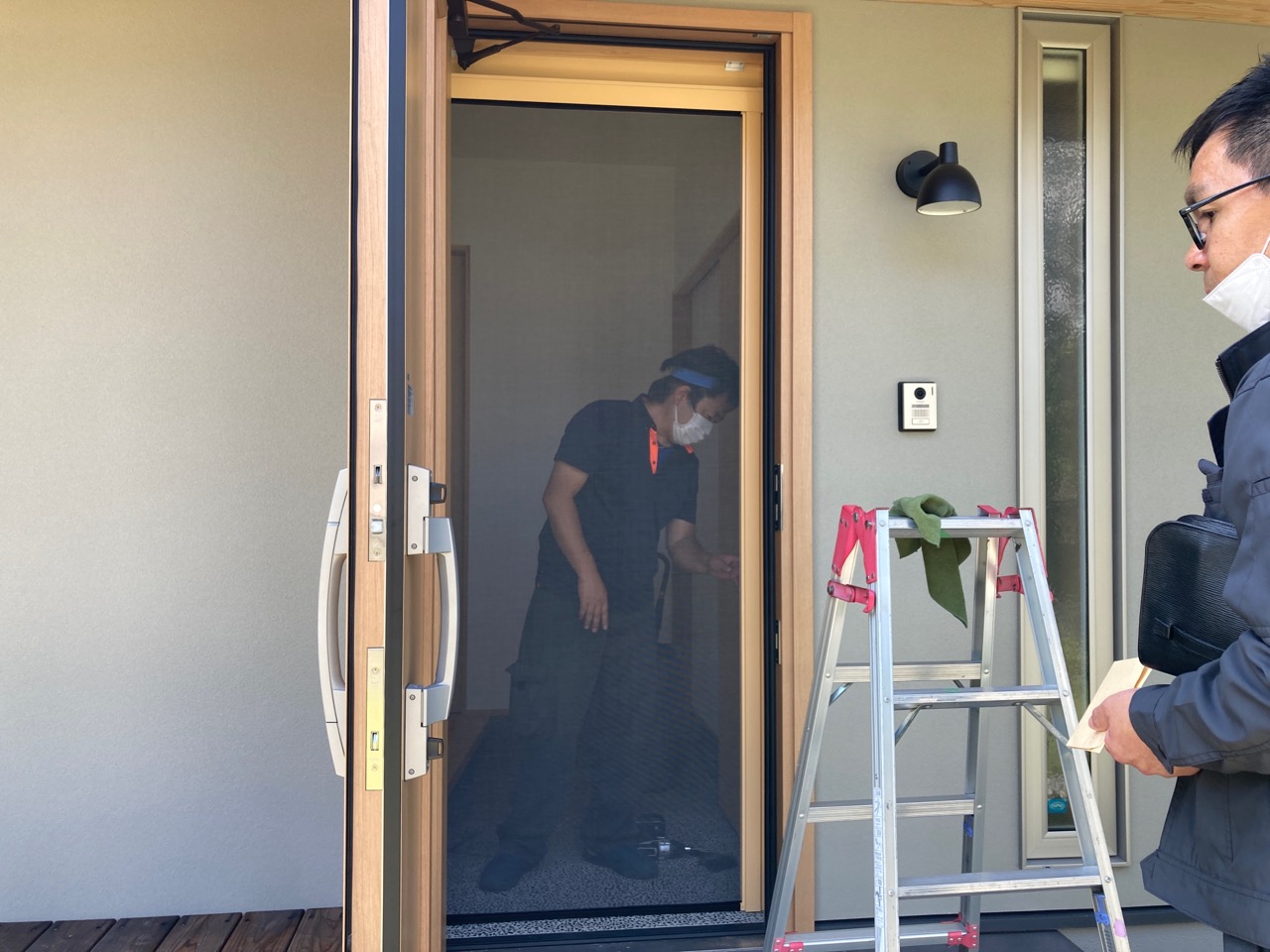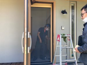 東の玄関にスライド式の網戸取付にうかがいました。今回選択している玄関ドアに付属している網戸ではないのですが、こういったドア部分に取付ける専用の網戸がありますのでメーカーにはピッタリサイズの商品があります。
