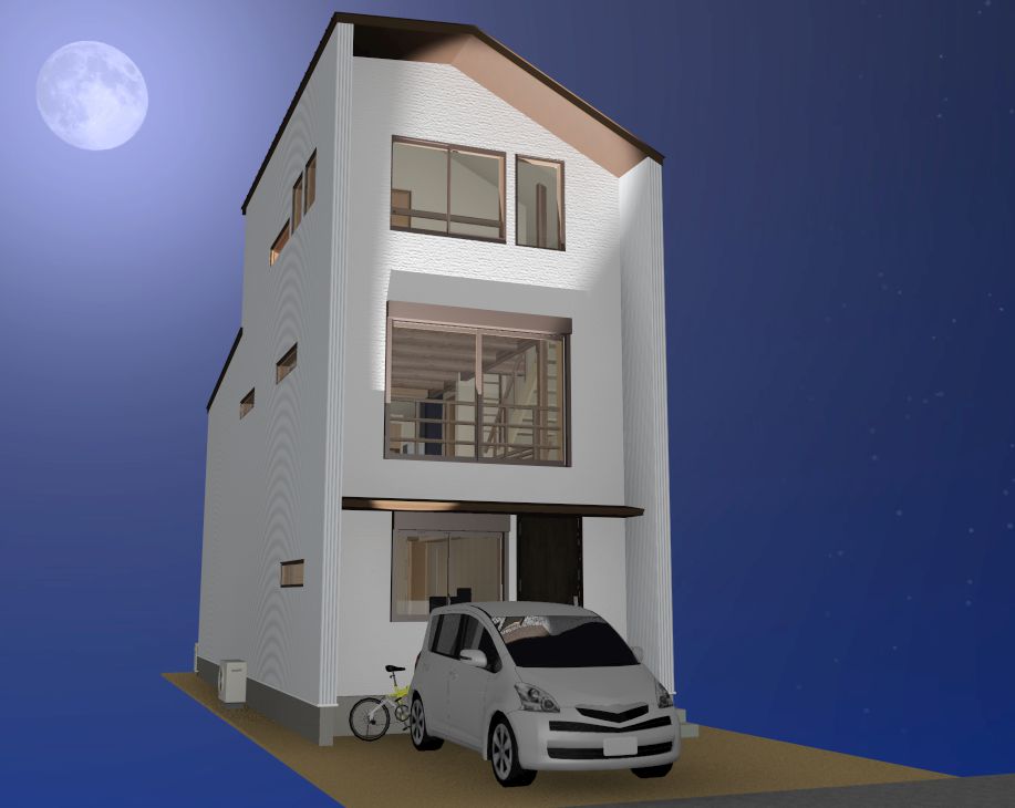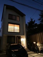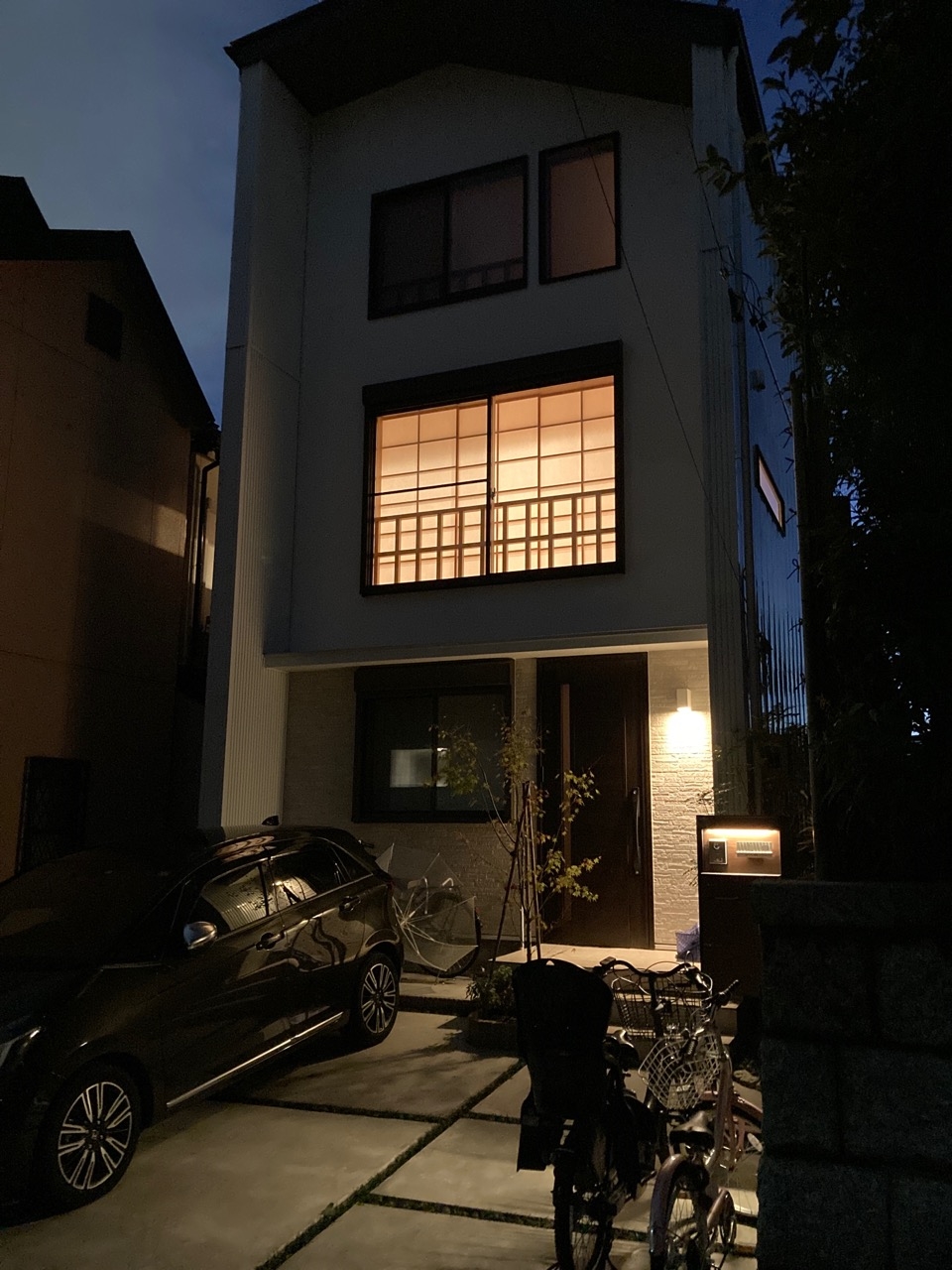 別件の現場での作業が遅くなった帰りにふと思いついて夜景を拝見しに訪れました。まだ少し残光のある夕闇をバックに照明器具の灯りとのコントラストが映えています。2階は掃き出し窓に設置した内障子越しに見える電球色の灯りが何とも温かみを感じさせ、印象的なシルエットを作り出しています。