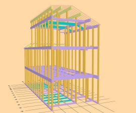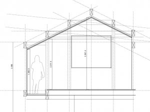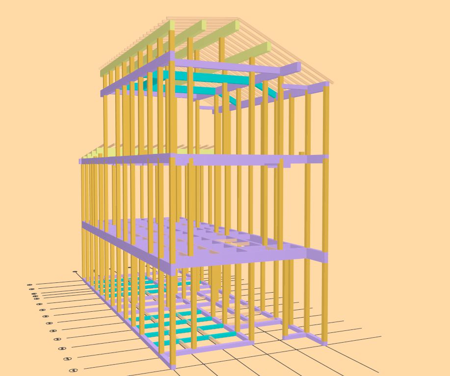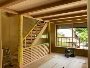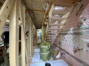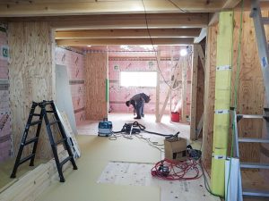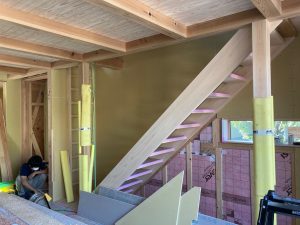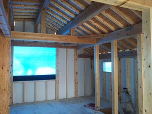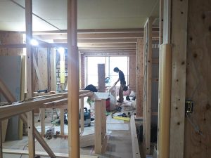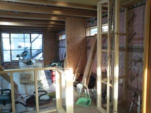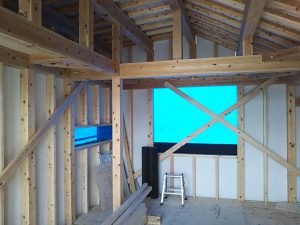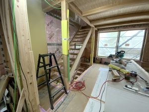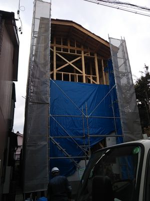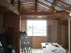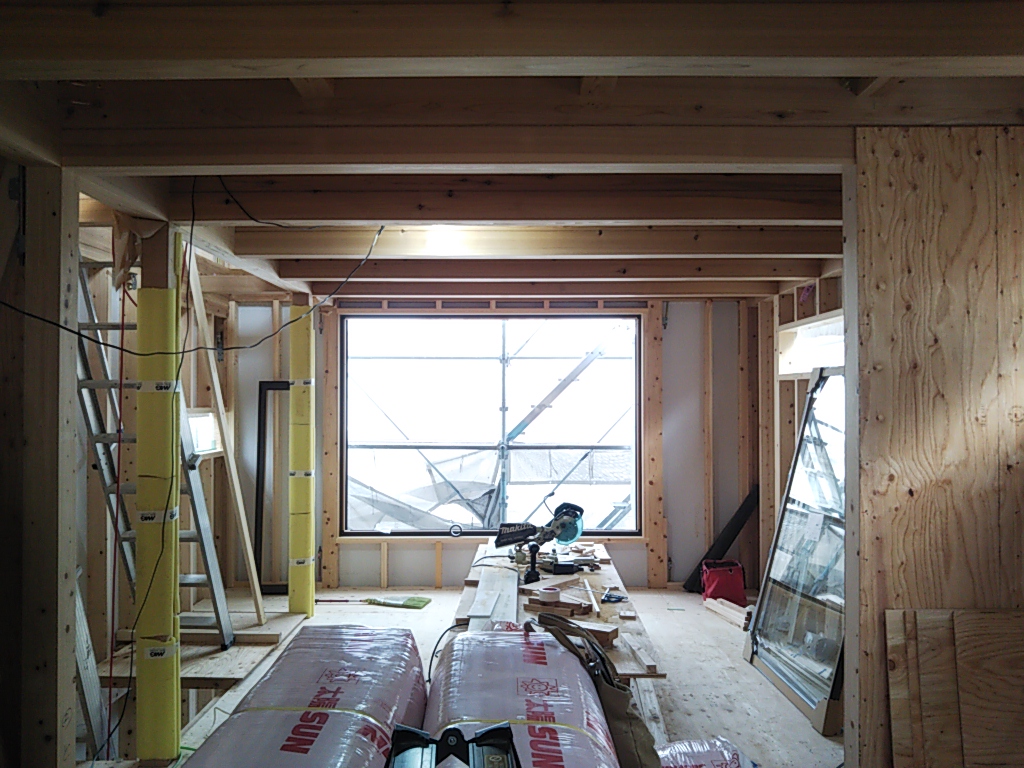 3階の架構がほぼ完了しました。道路に面した東面には結構大きな窓が取り付けられる予定です。3階なのに大きすぎでは? と思われるかもしれません。木造でも3階建て以上の建築物になると、火災の際に消防隊が突入するため、所定の寸法以上の非常用進入口の設置が義務付けられます。間取りを考えるさに非常に重要になってくる要素です。