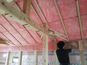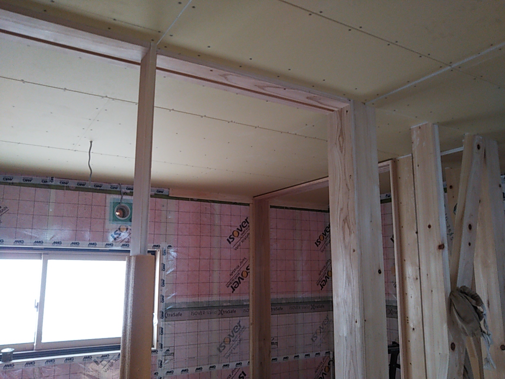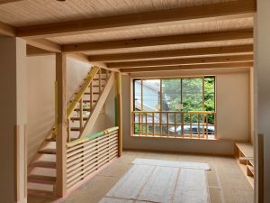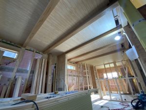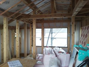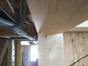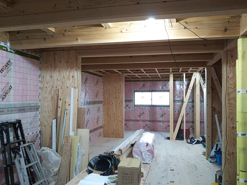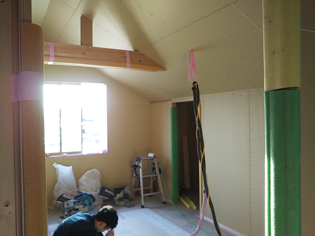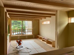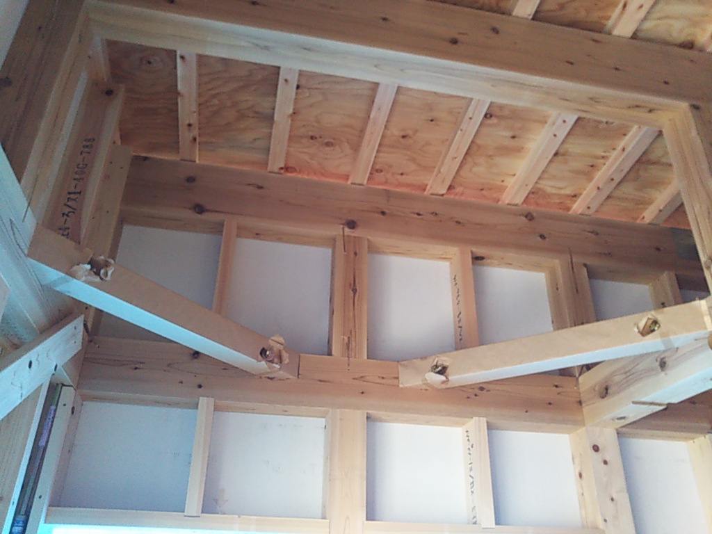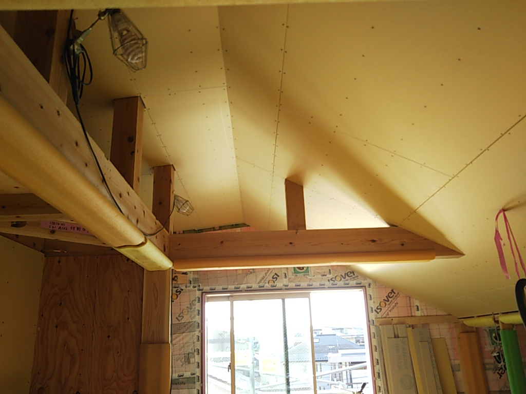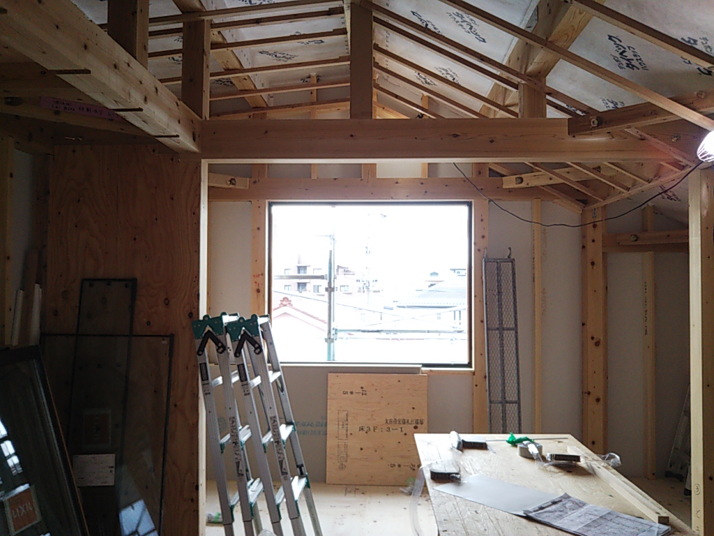 小屋組みは上棟と同時に半分でき上っているようなもので、今回は高度地区の北側斜線制限目いっぱい建てたため、3階の北側の天井の一番低い部分は筆者(身長175㎝)が歩くとかなりぎりぎりの高さとなります。3階は子供室(eriちゃんの部屋)となるため向こう10年は頭を打つ恐れはないと思いますが・・。
