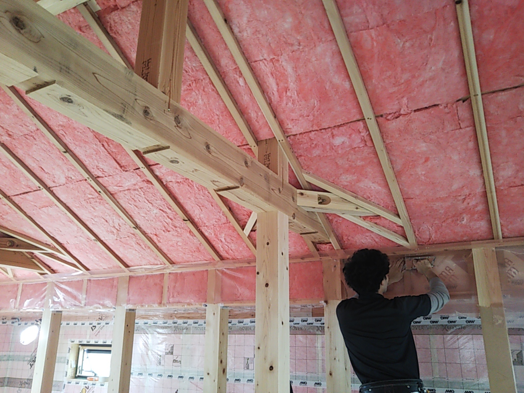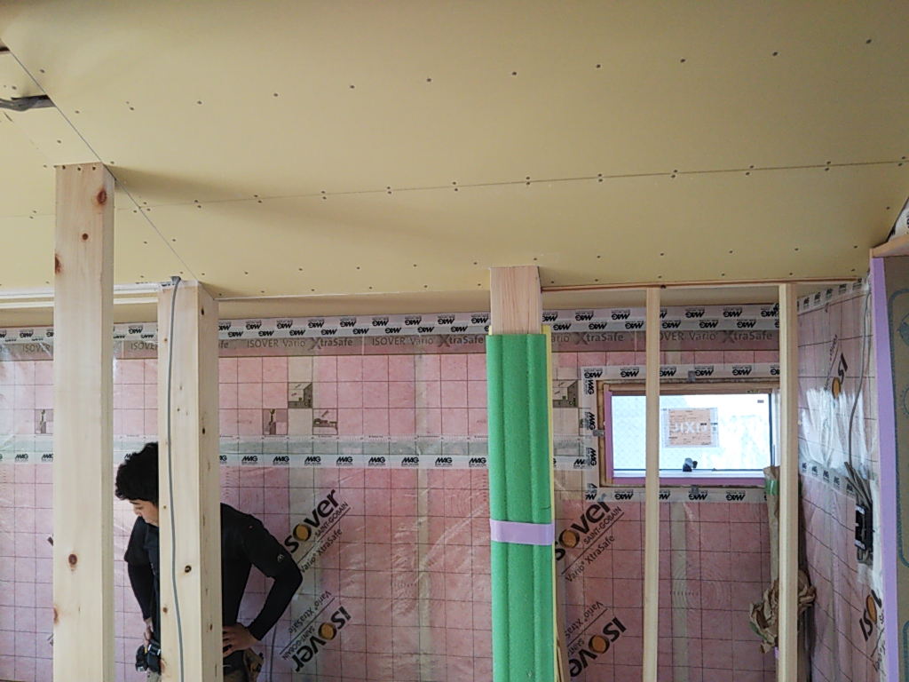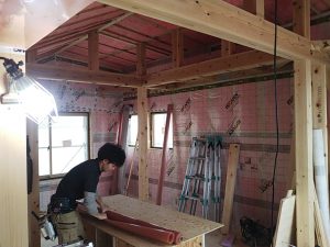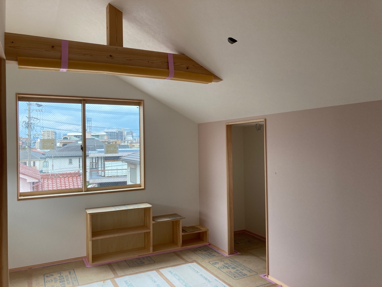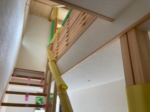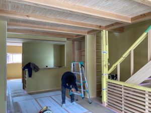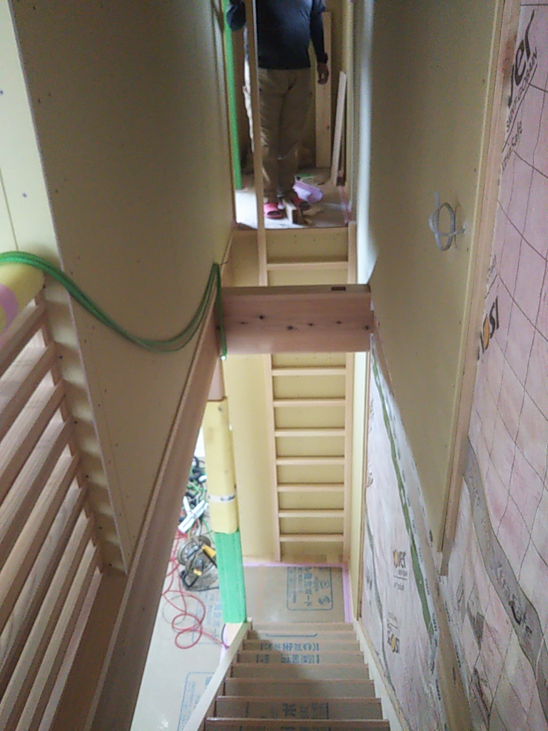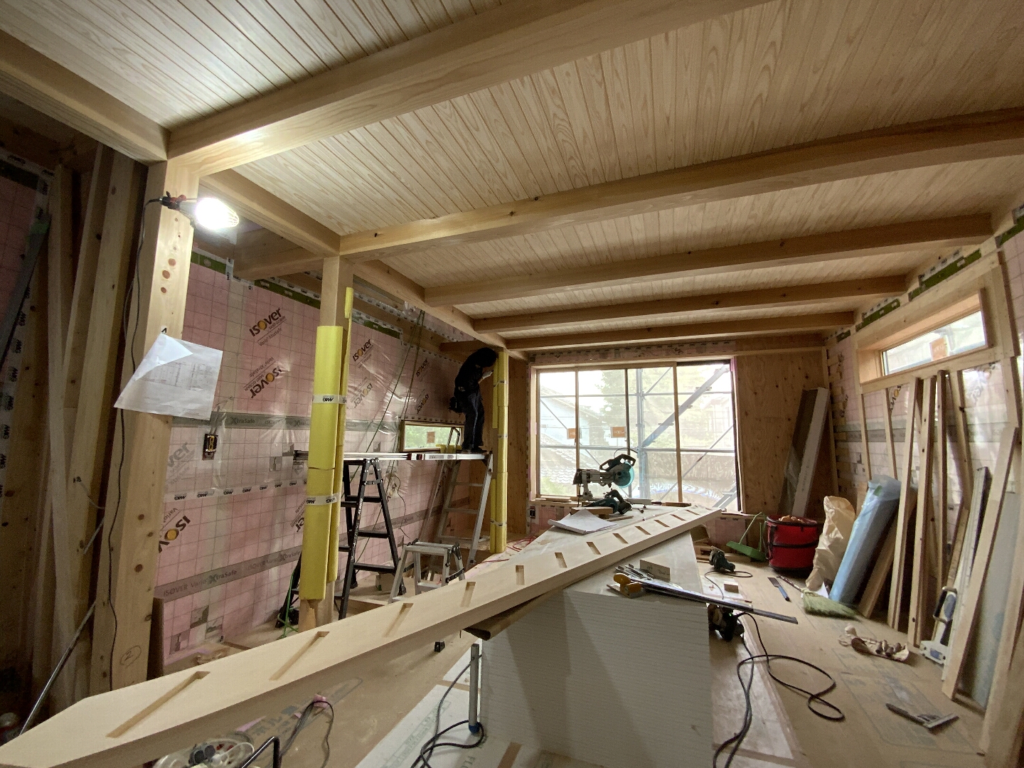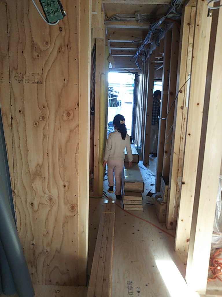 小屋組みは上棟と同時に半分でき上っているようなもので、今回は高度地区の北側斜線制限目いっぱい建てたため、3階の北側の天井の一番低い部分は筆者(身長175㎝)が歩くとかなりぎりぎりの高さとなります。3階は子供室(eriちゃんの部屋)となるため向こう10年は頭を打つ恐れはないと思いますが・・。