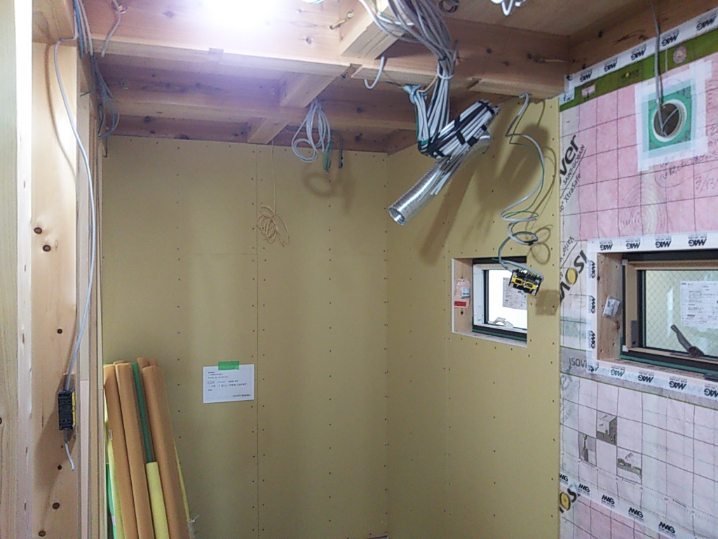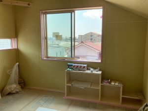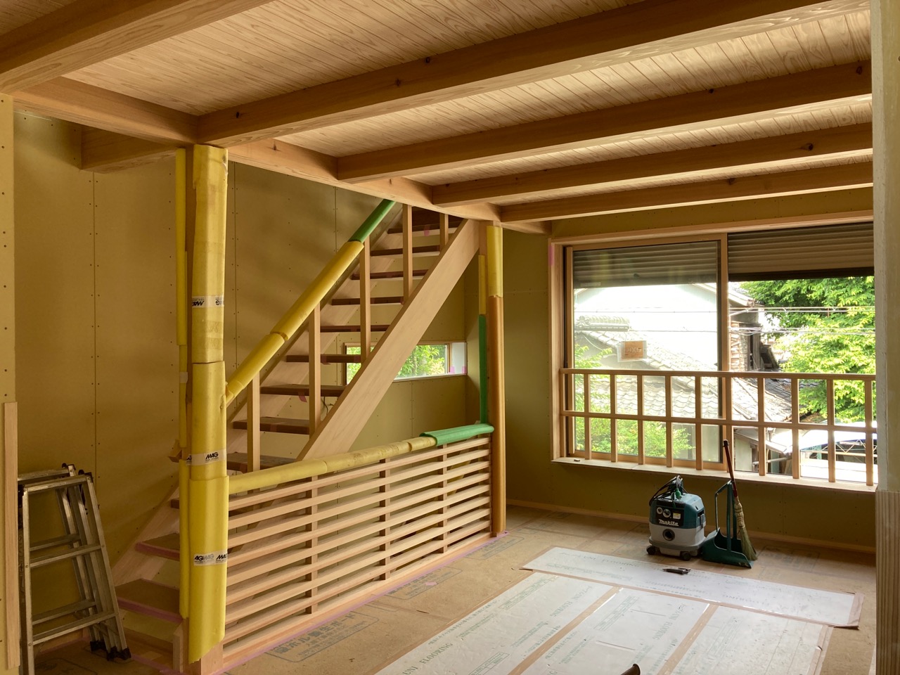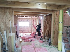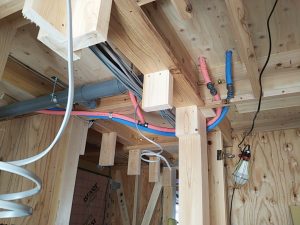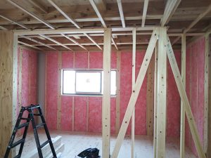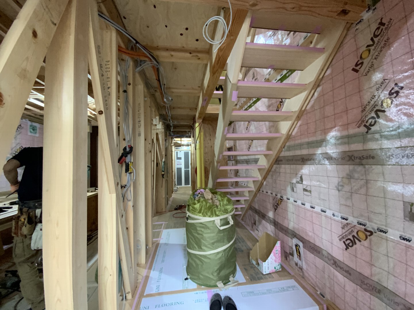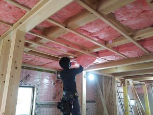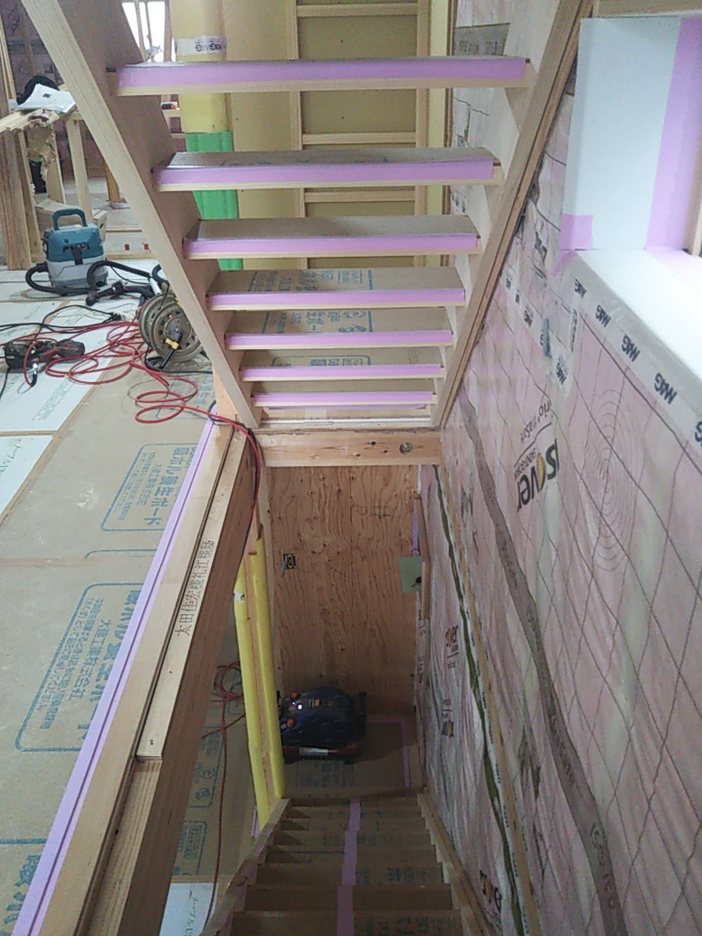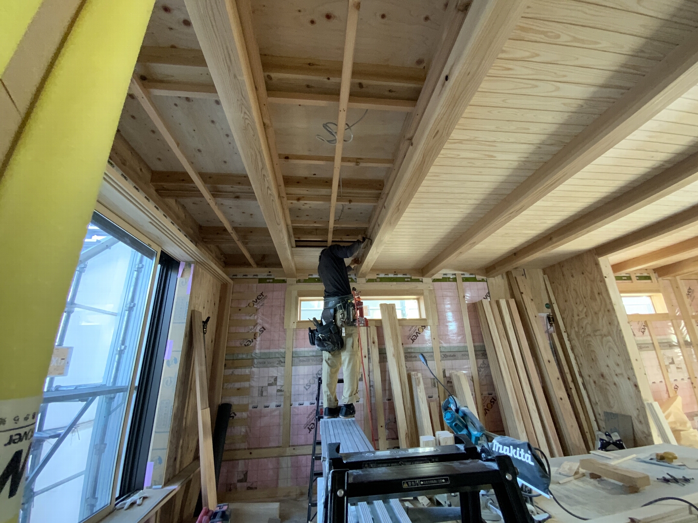 小屋組みは上棟と同時に半分でき上っているようなもので、今回は高度地区の北側斜線制限目いっぱい建てたため、3階の北側の天井の一番低い部分は筆者(身長175㎝)が歩くとかなりぎりぎりの高さとなります。3階は子供室(eriちゃんの部屋)となるため向こう10年は頭を打つ恐れはないと思いますが・・。