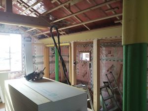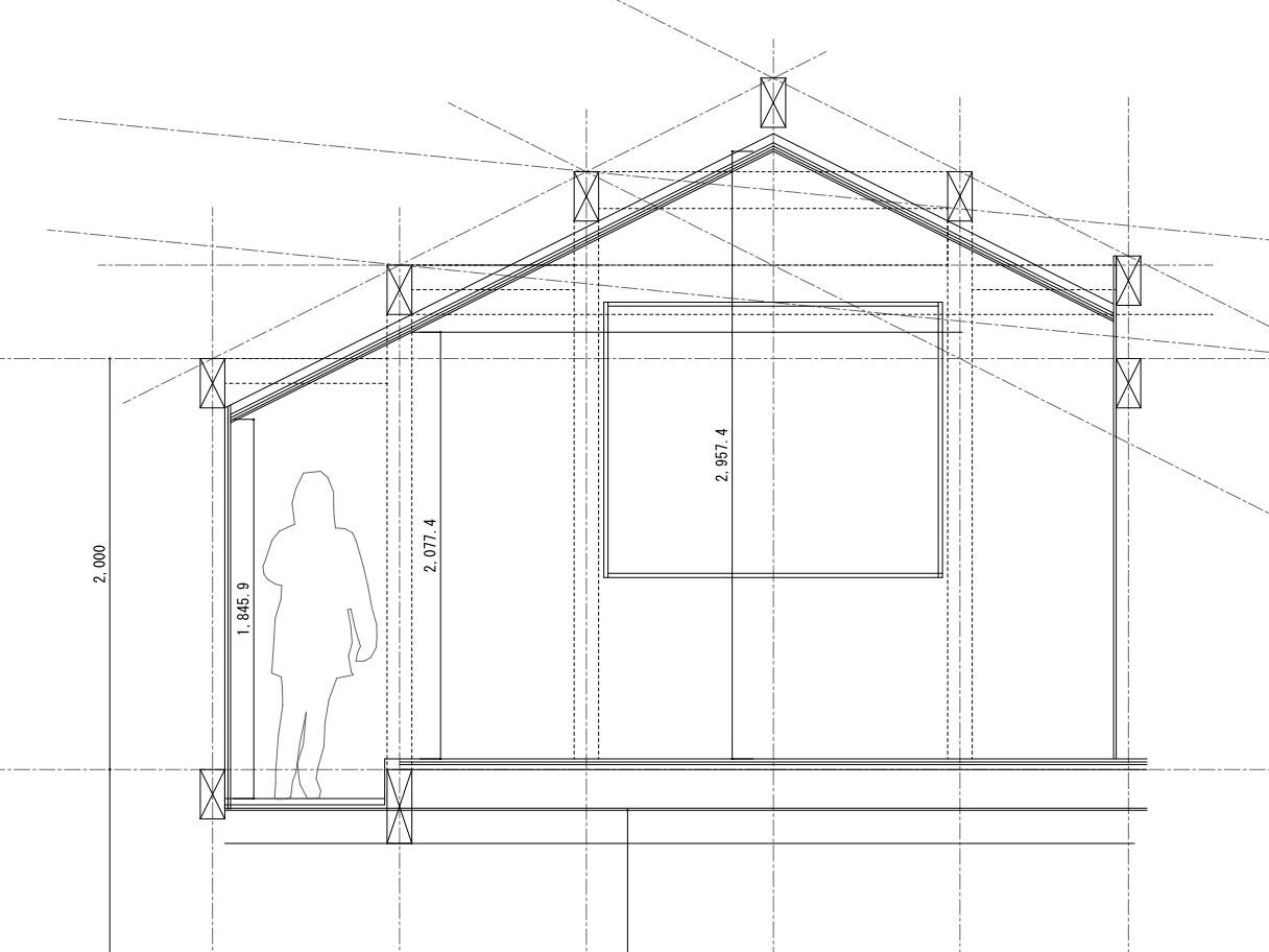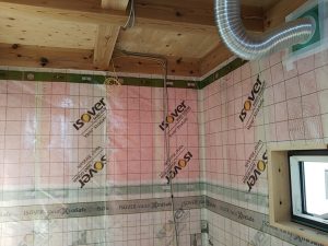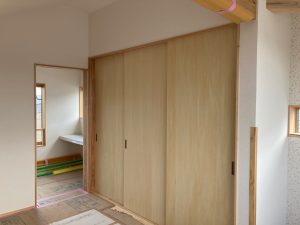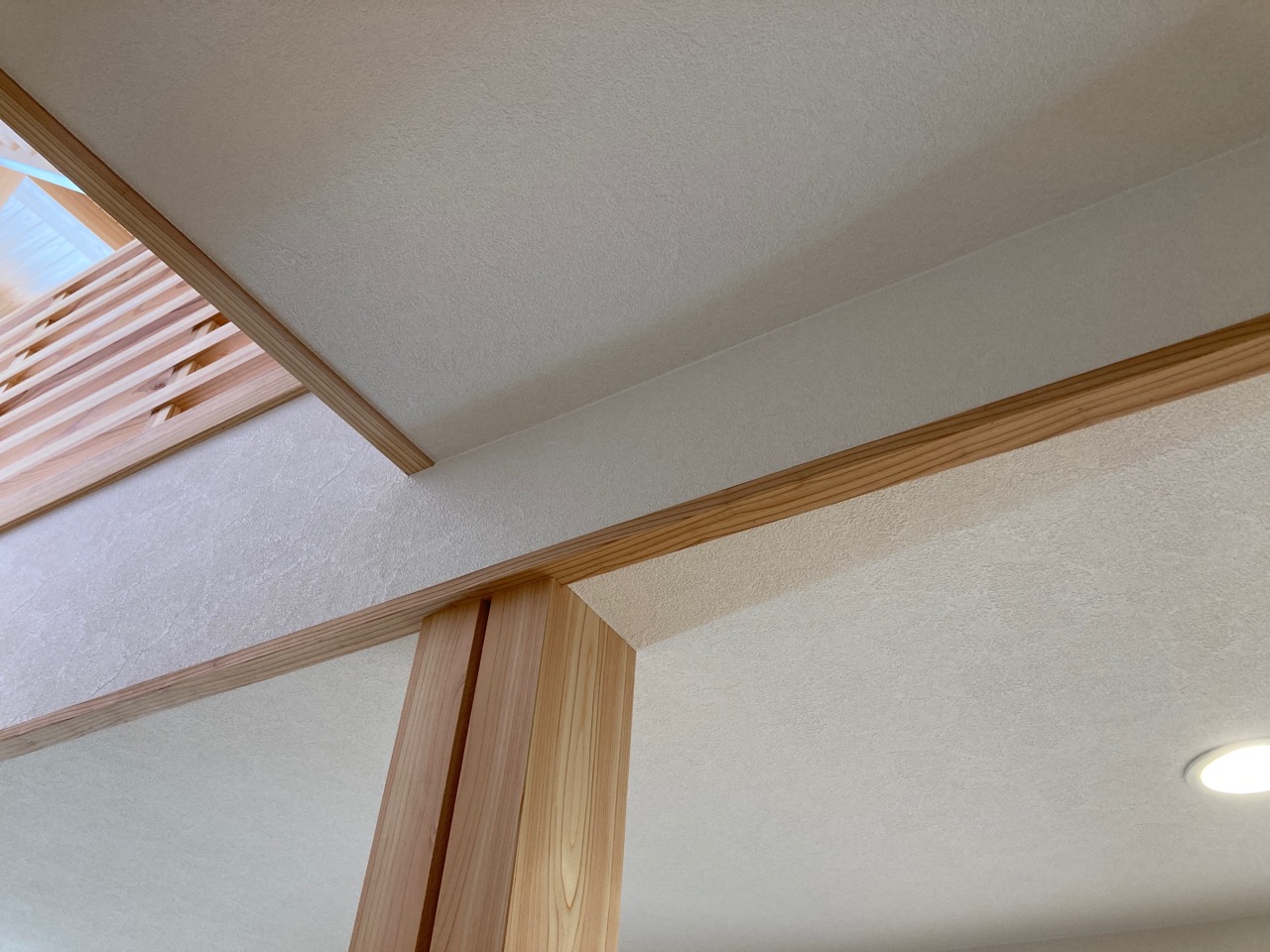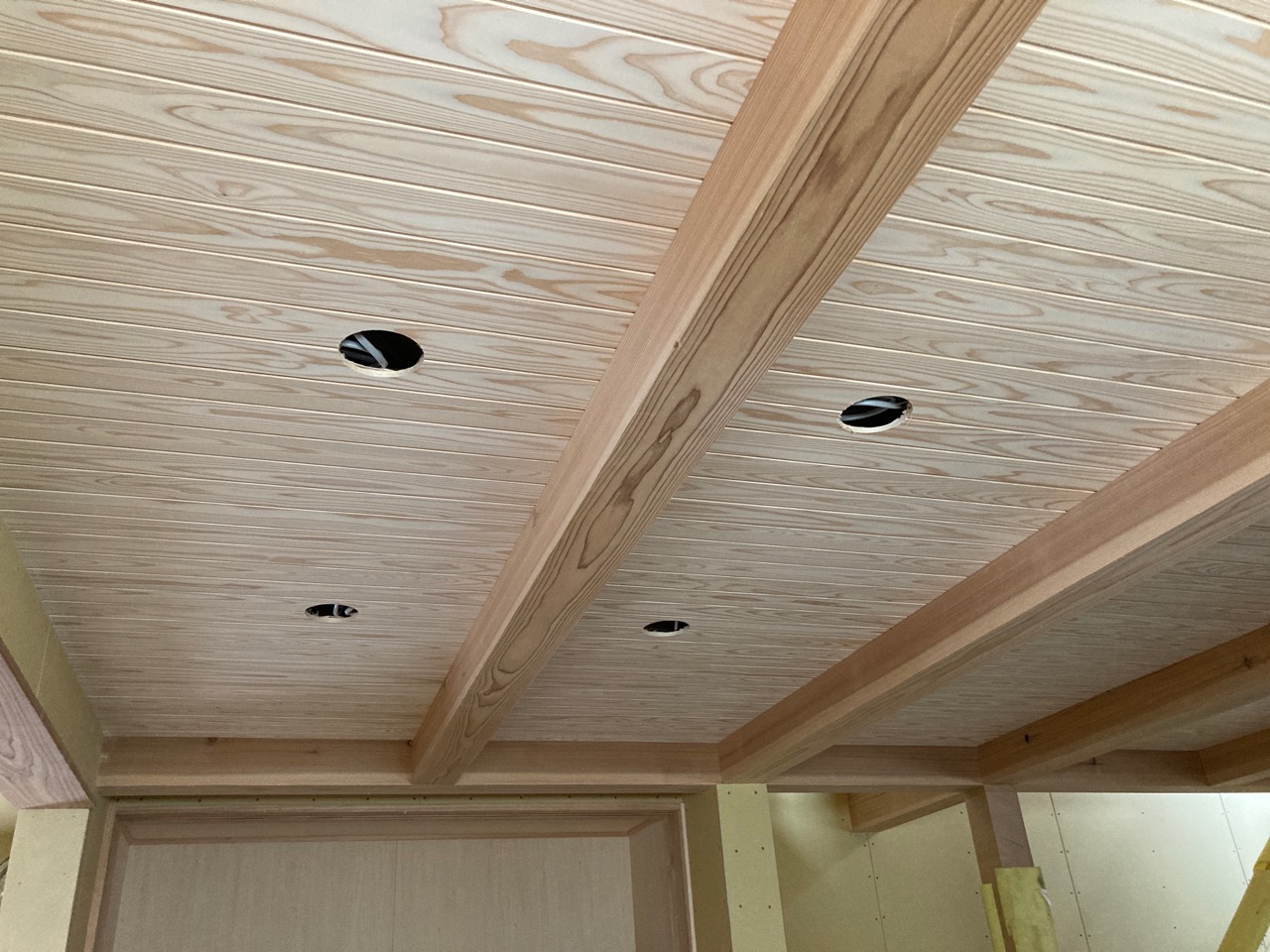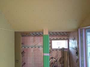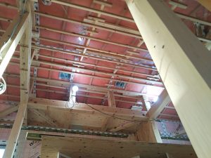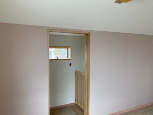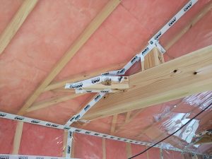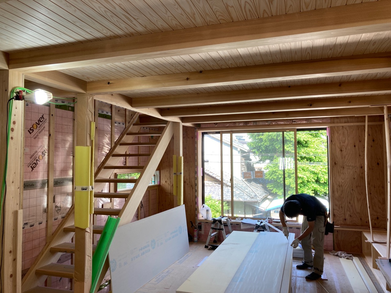 小屋組みは上棟と同時に半分でき上っているようなもので、今回は高度地区の北側斜線制限目いっぱい建てたため、3階の北側の天井の一番低い部分は筆者(身長175㎝)が歩くとかなりぎりぎりの高さとなります。3階は子供室(eriちゃんの部屋)となるため向こう10年は頭を打つ恐れはないと思いますが・・。