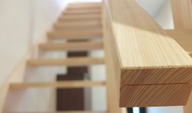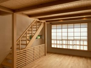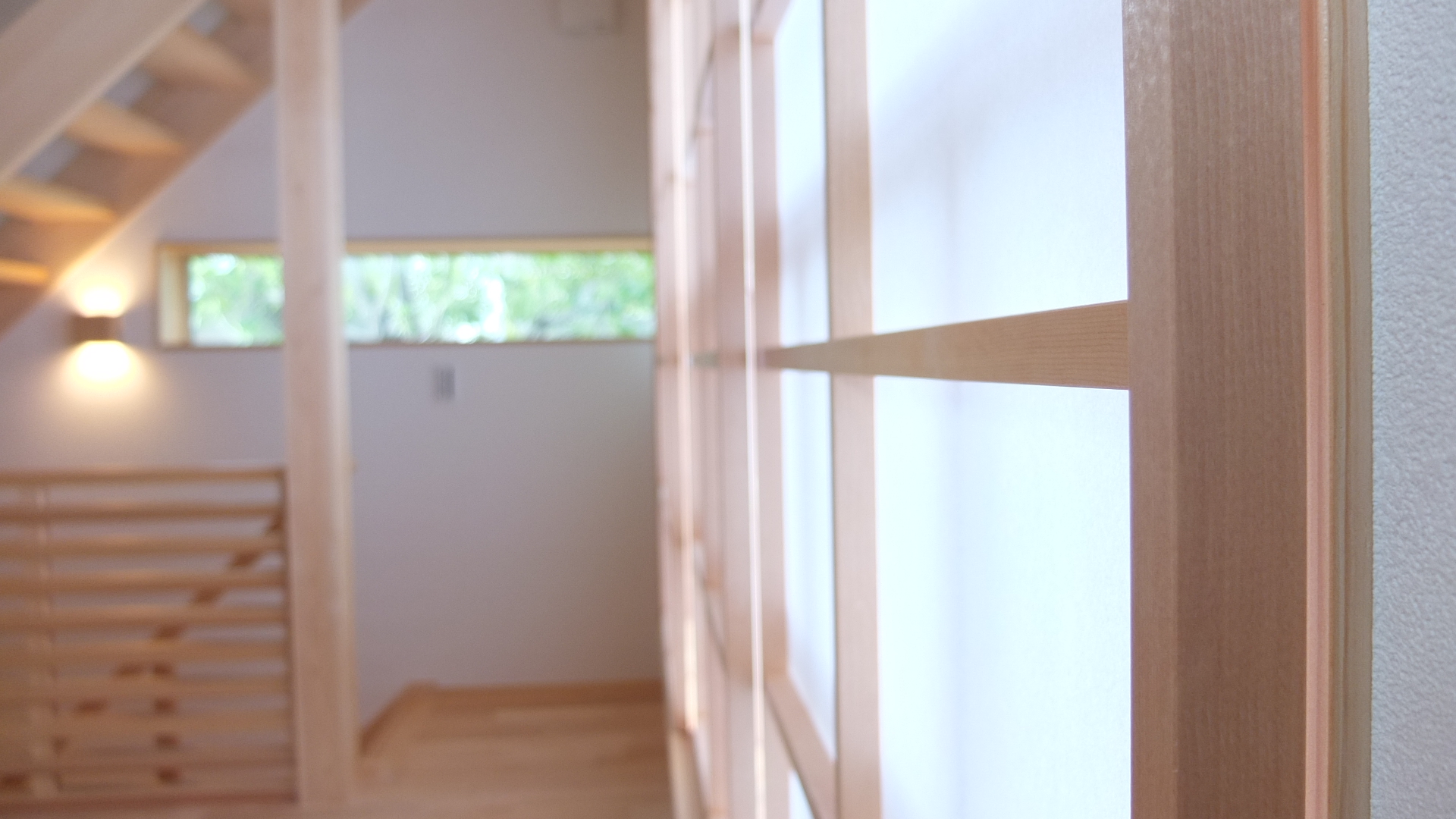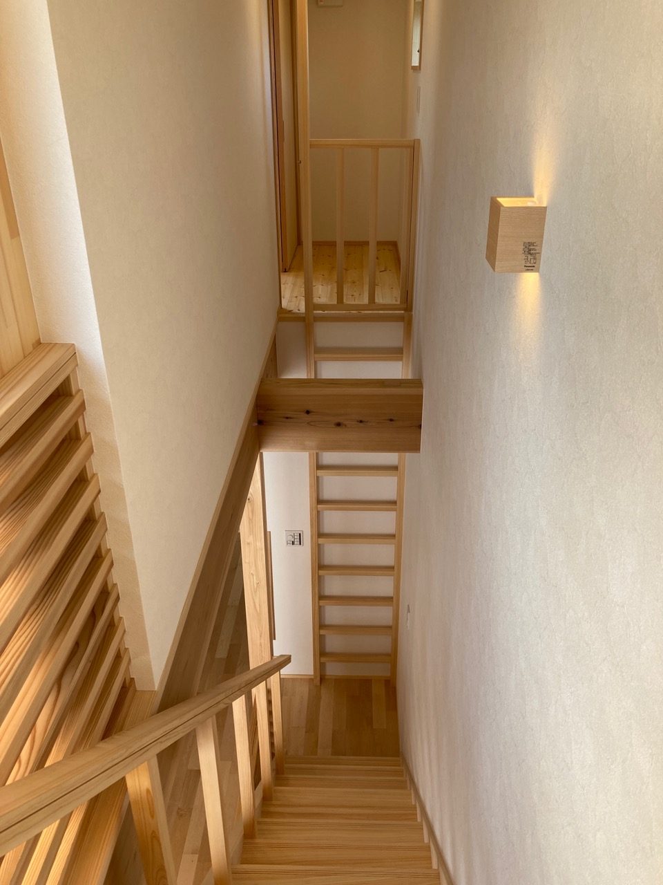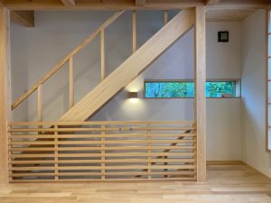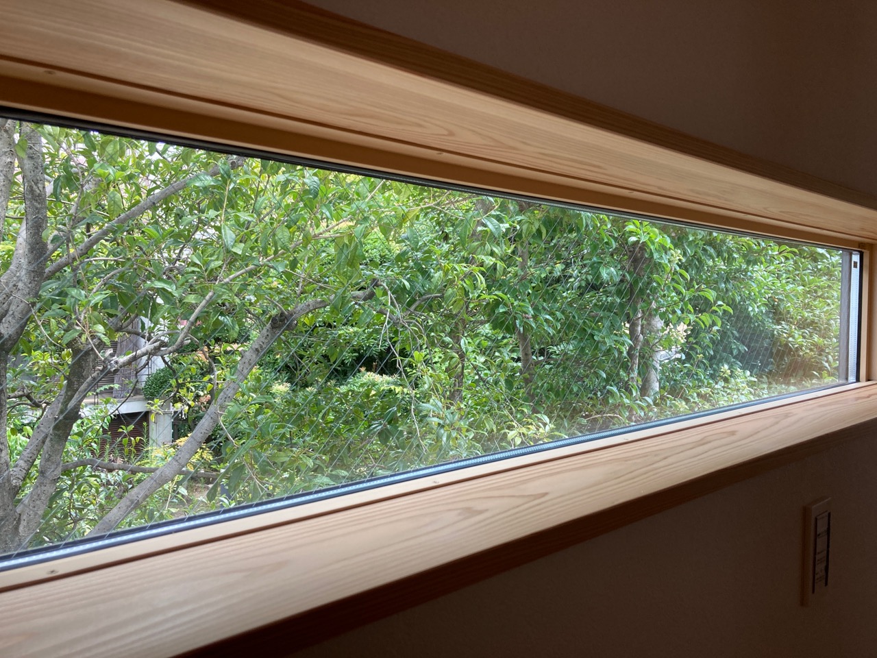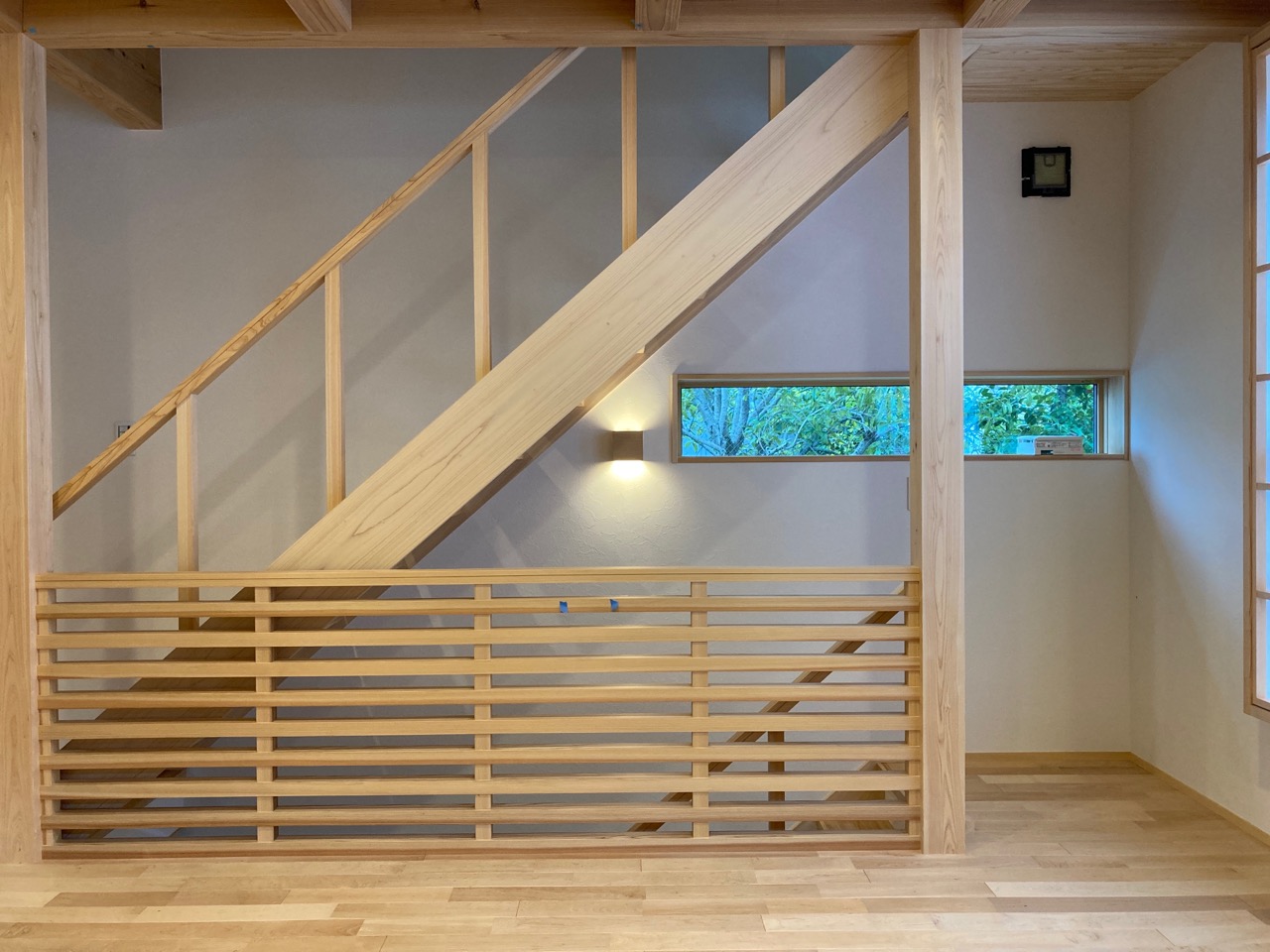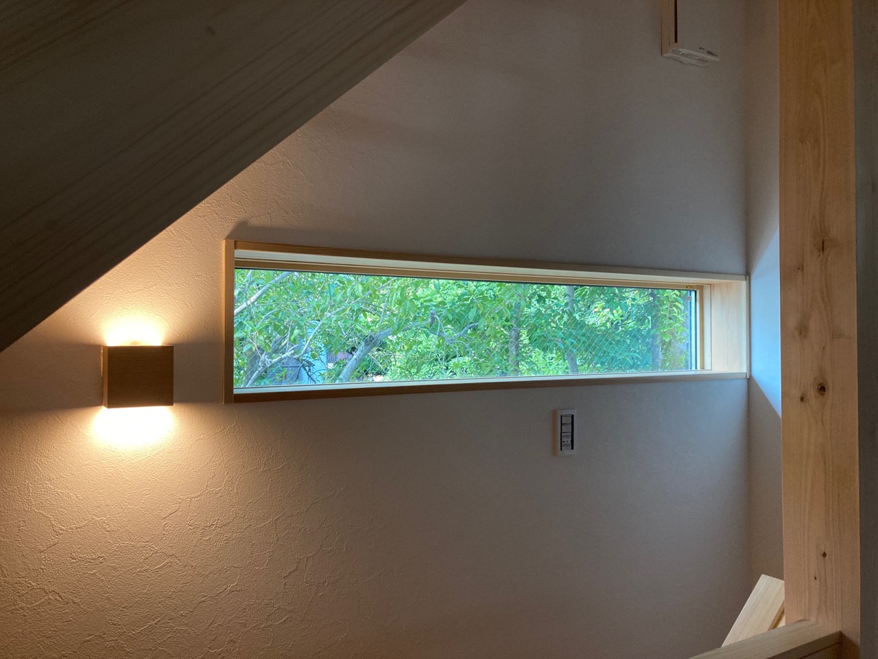 1階から上がってくる階段の脇には横長スリットの窓が取り付けられています。図らずもお隣様の緑が借景となり、木質インテリアの一部アクセントとしてピクチャーウインドウの役割を果たしています。