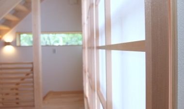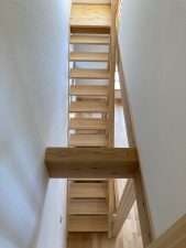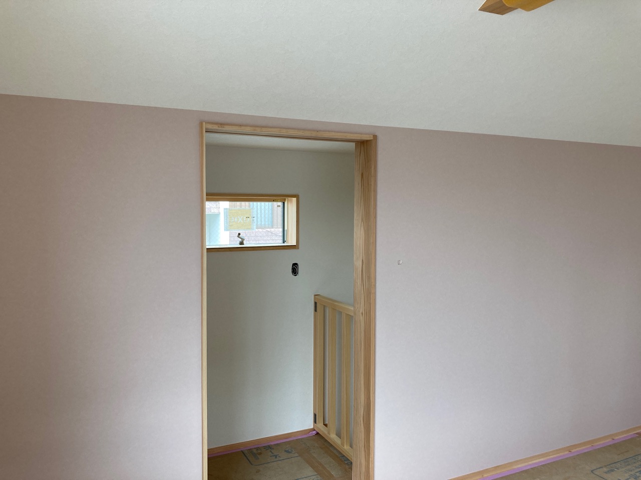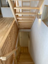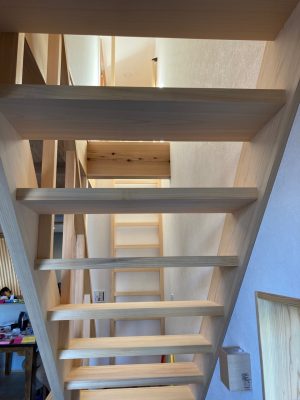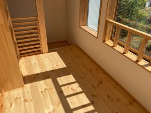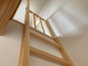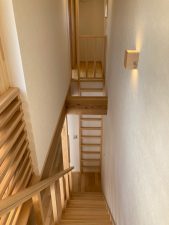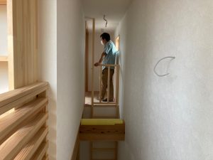 12月18日15時現在、梯子の向こうのヒミツの通路の引戸を開けておくと3階からの光が北側の壁にまで届き、梯子のある吹抜を通じて2階LDKにも降りてきます。施工中には全く気付かなかった採光の経路ですが、住宅密集地ながらo様としては『生活していてあまり暗さを感じない』という状況のようです。こんなところでも意外な活躍を見せる『ERI’s Ladder』でした。
