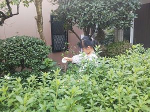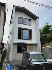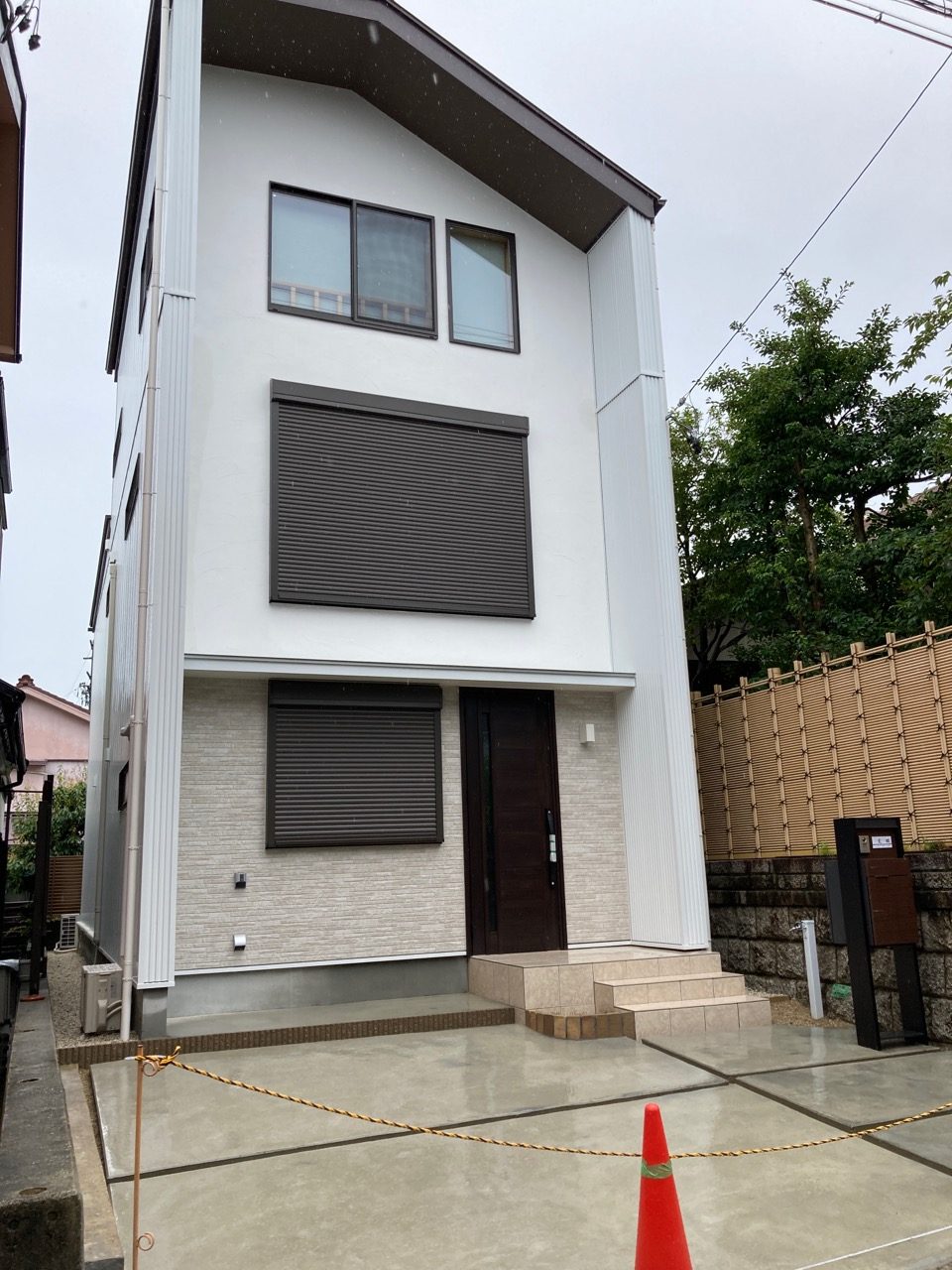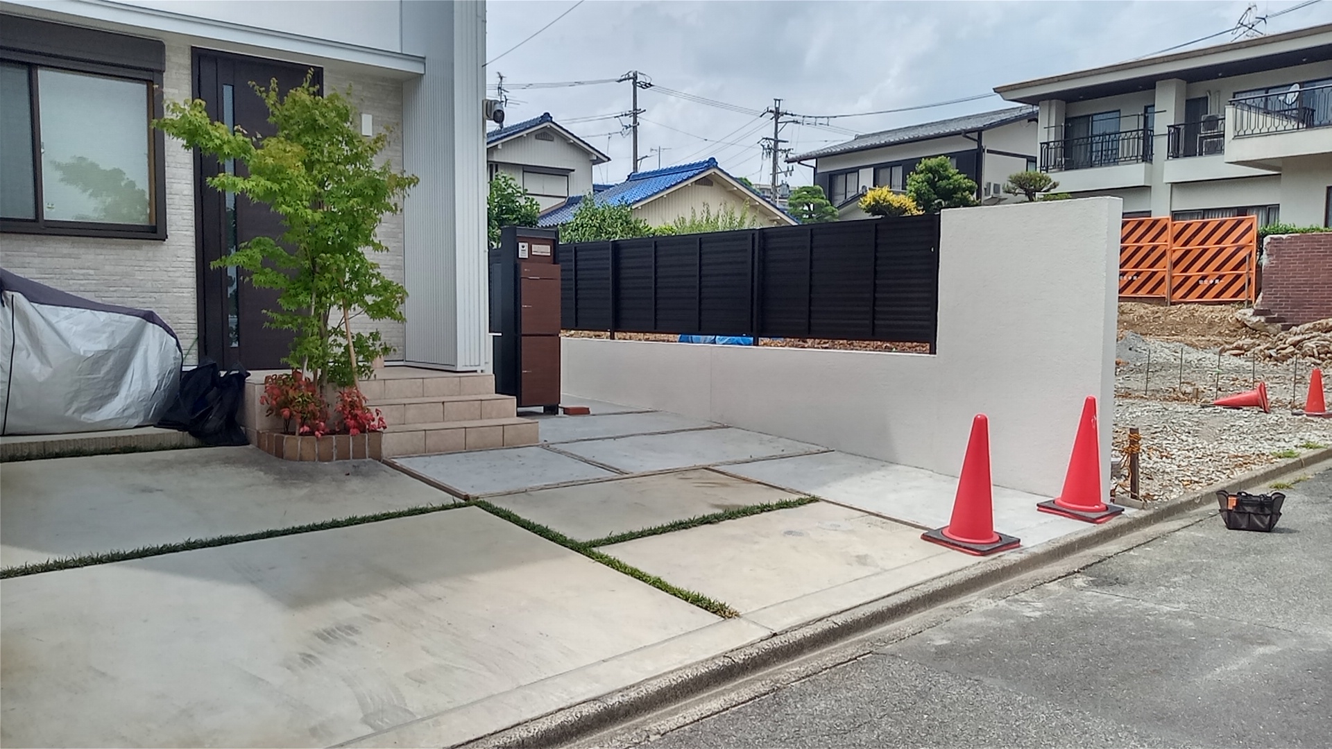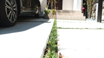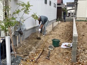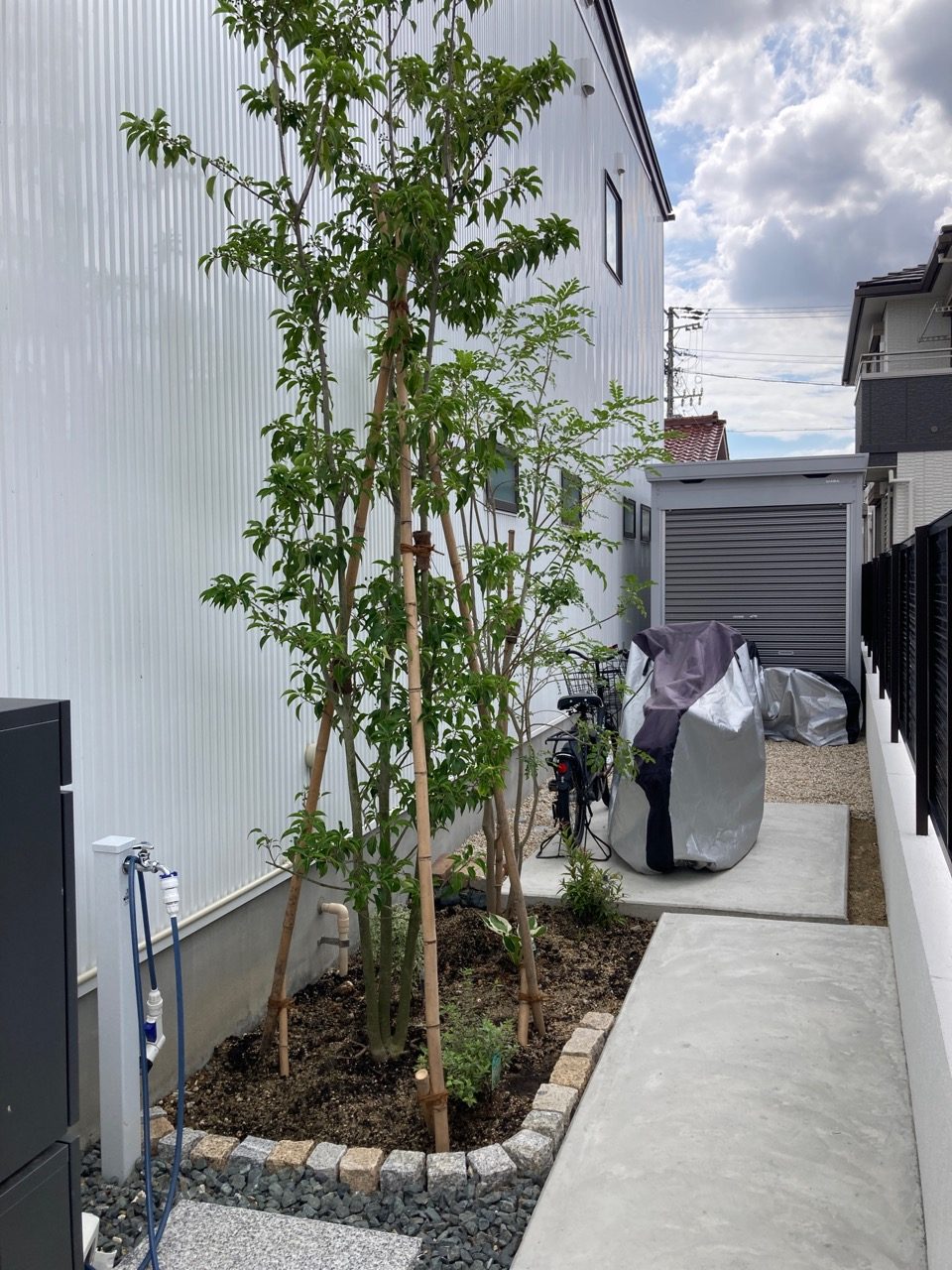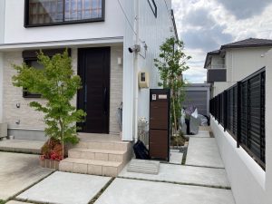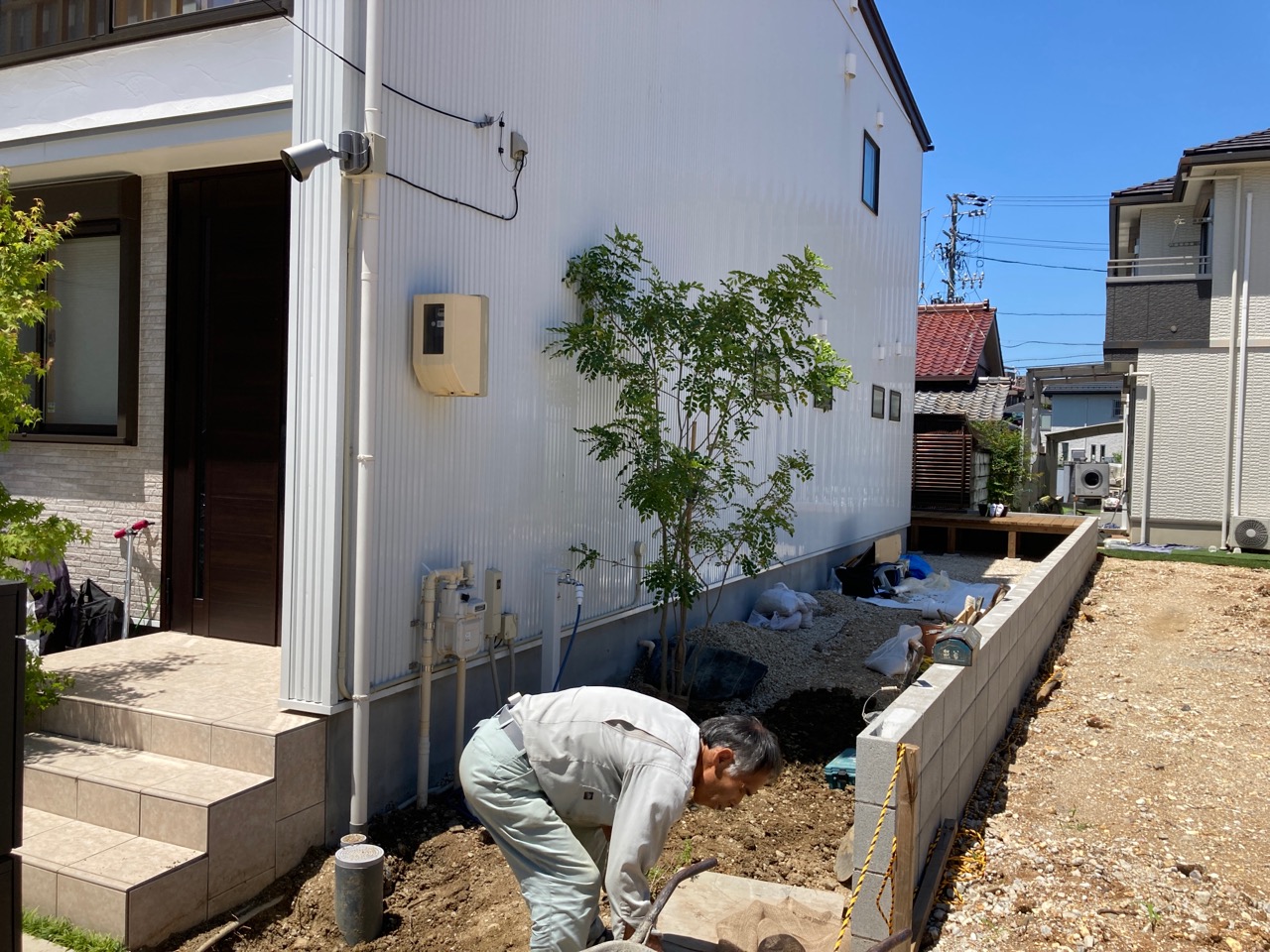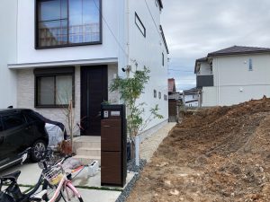 お引っ越し作業も終わりましたので、最後に駐車場アプローチ部分の外構植栽工事を行います。周辺の住民の組合で『地区計画』が定められ、植栽を植える事が求められる地区にあたり、要件を満たすために工事をしますが、こうして見るとホワイトの外観にワンポイントの緑がマッチしています。
