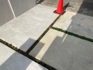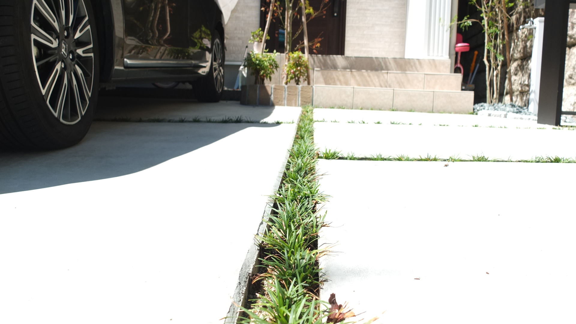新たに打設した土間コンクリートの型枠を外し、土間のスリット間に土を入れてタマリュウの苗を植えました。植えたばかりはまだまだまばらな間隔ですが、繁ってくると隙間を埋め尽くさんばかりの容量になります。