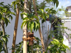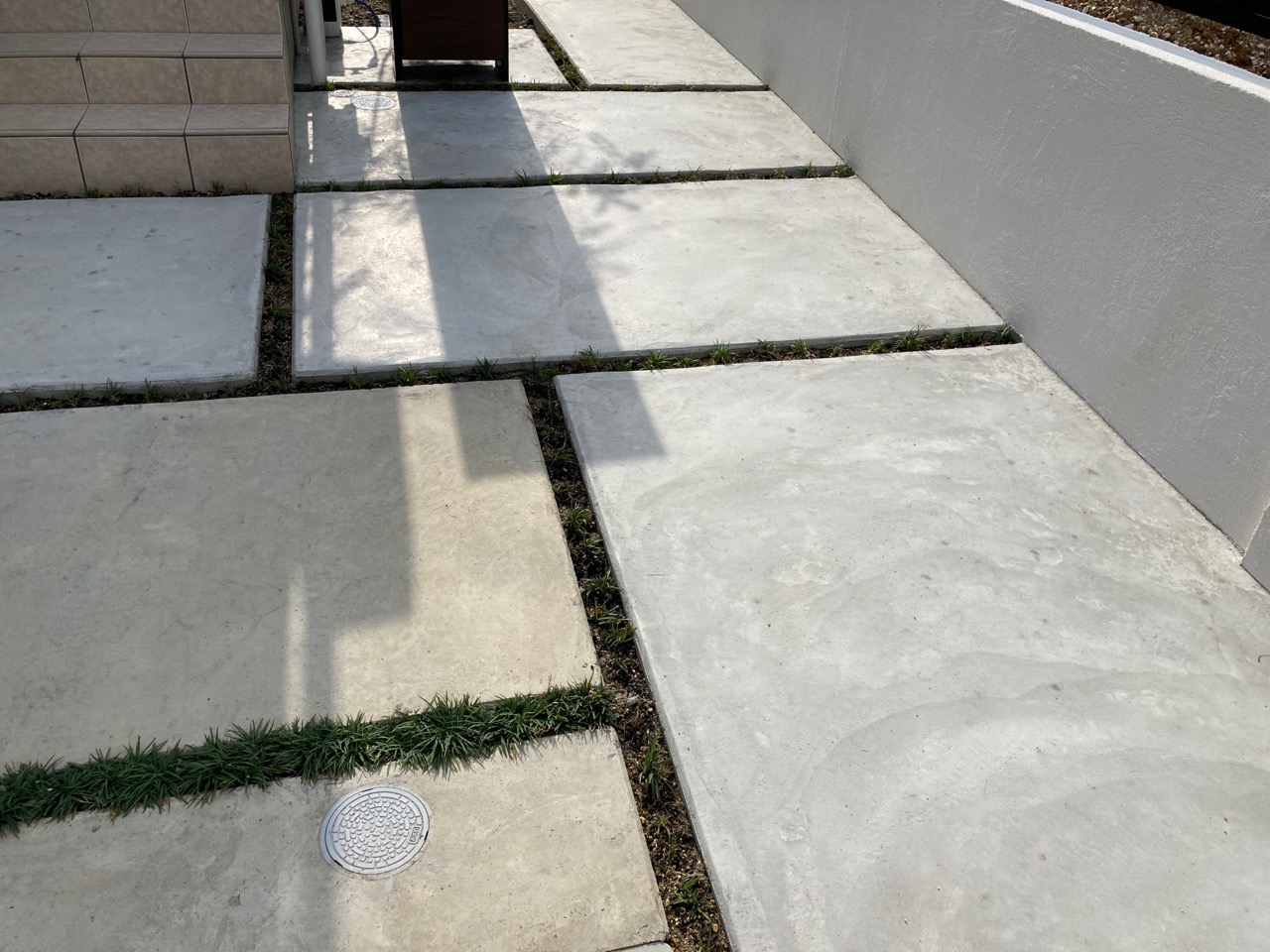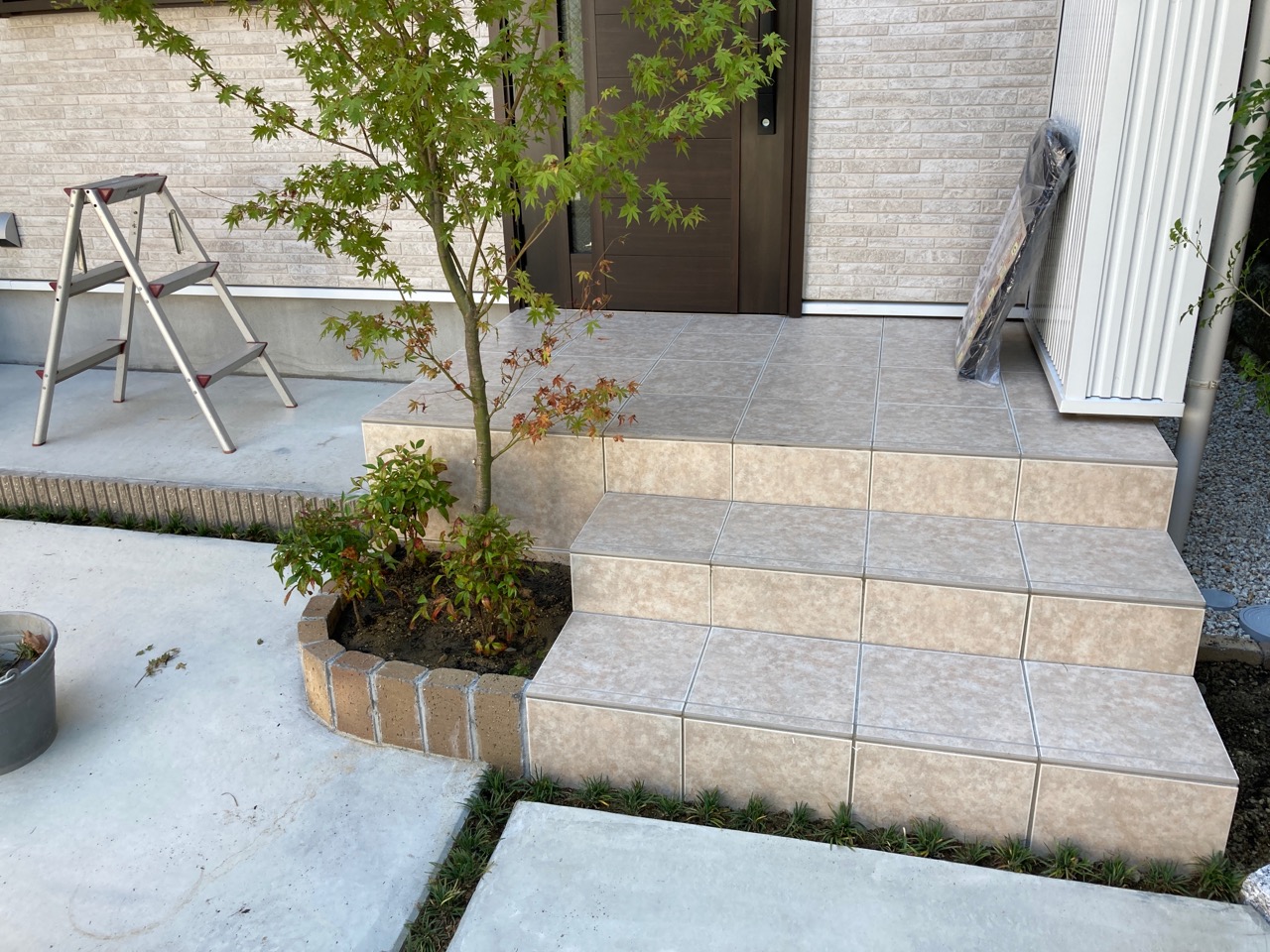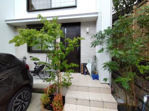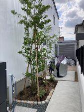 奥へつながる通路の脇に植栽を移設、追加でもう一本植えられました。元々は玄関ポーチ階段脇に積まれていたピンコロ石も敷かれ、追加外構工事もほぼ完了です。
