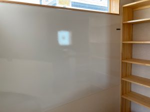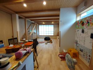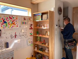 お引渡しから1年が経ち、1年目の点検にうかがいました。外構工事終了時には『うまい事根がついていないのか』と心配していた植栽も青々と茂っています。 室内でもいかにもERIちゃんらしい飾りや小物がいっぱいで生活感にあふれています。ダイニングのホーロー板にもお絵描きの後が・・。 点検中に近所のお友達が遊びにみえ、『3階の部屋に遊びに行こう』と、階段ではなくハシゴを使って上がっていきました。『近所の子に評判なんですよ』とO様。喜んで使ってもらえているようで何よりです。