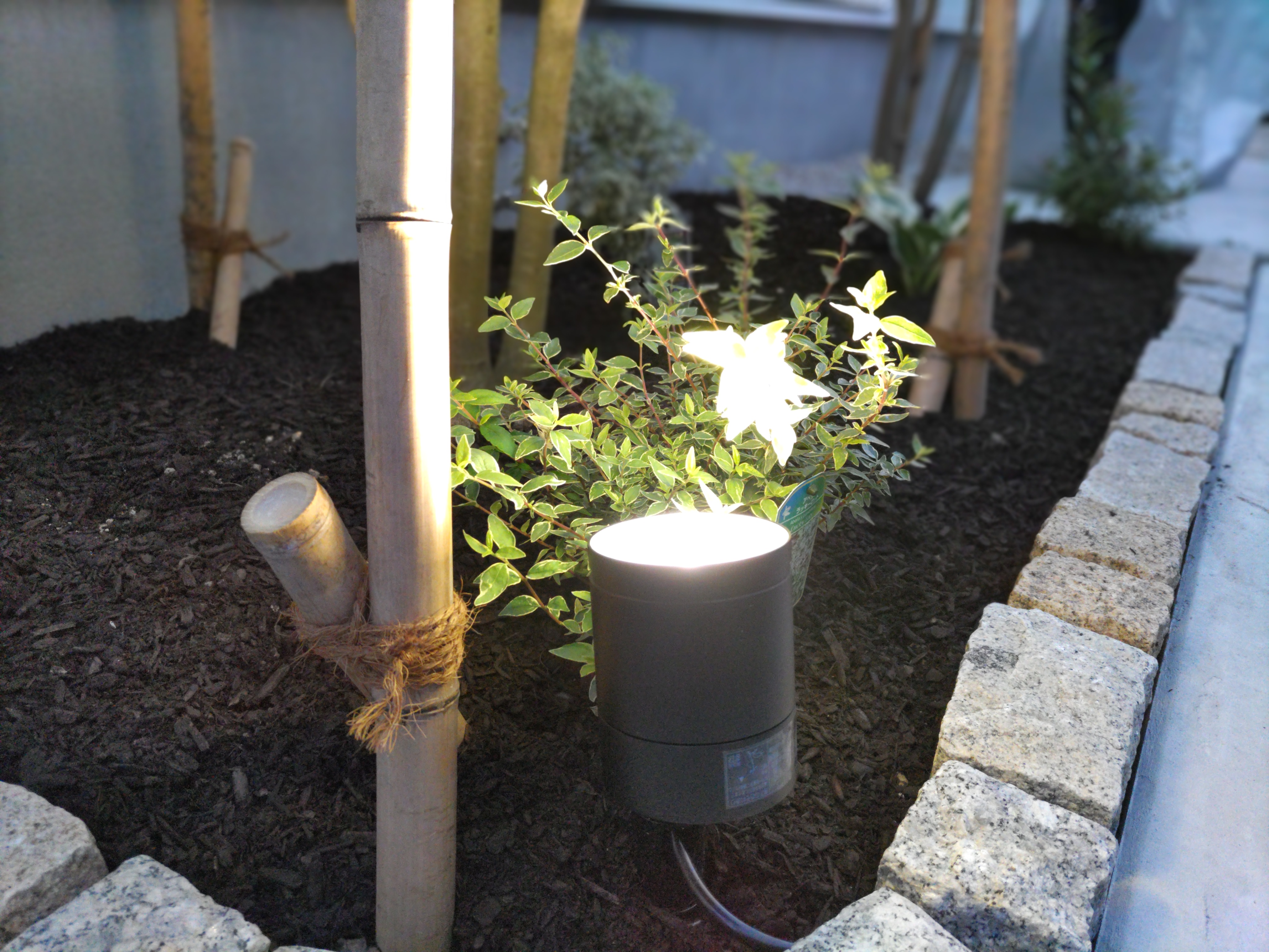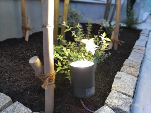 植樹した高木をアッパーライトでライトアップするための照明器具を据え付けます。外部にはライト用の電源が無いので近くの機器から電源を増設します。植樹はジューンベリーでしたでしょうか、小さい実がついています。