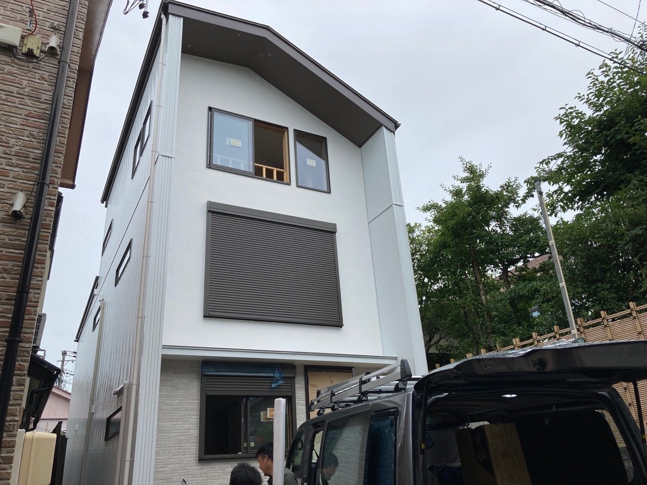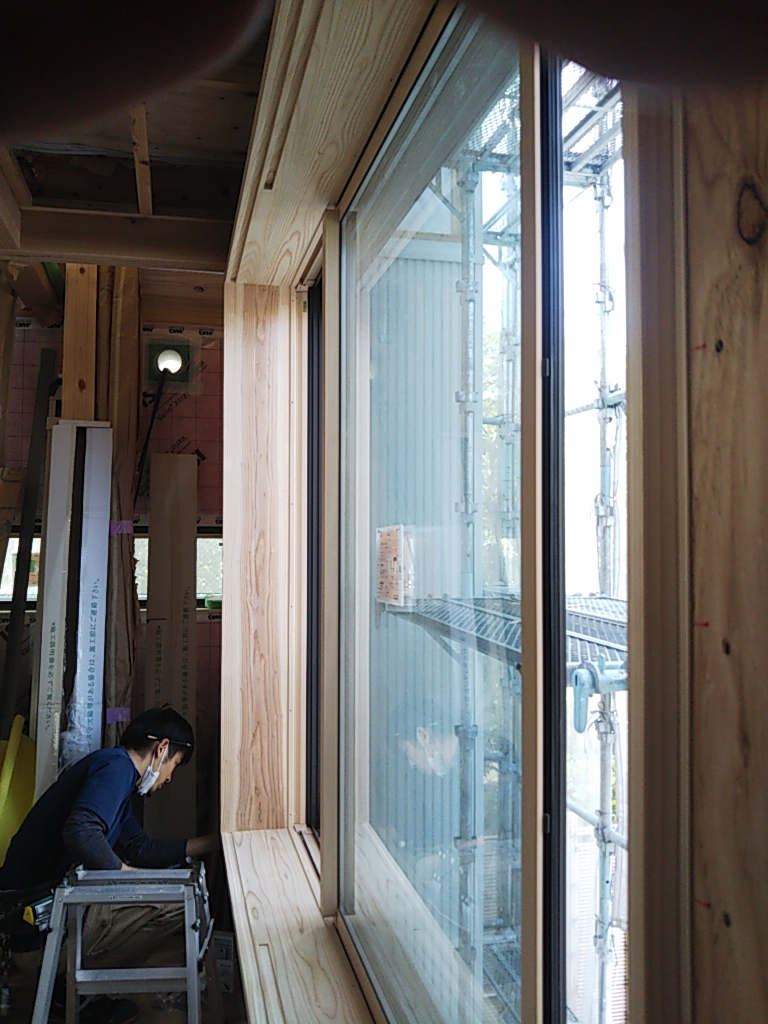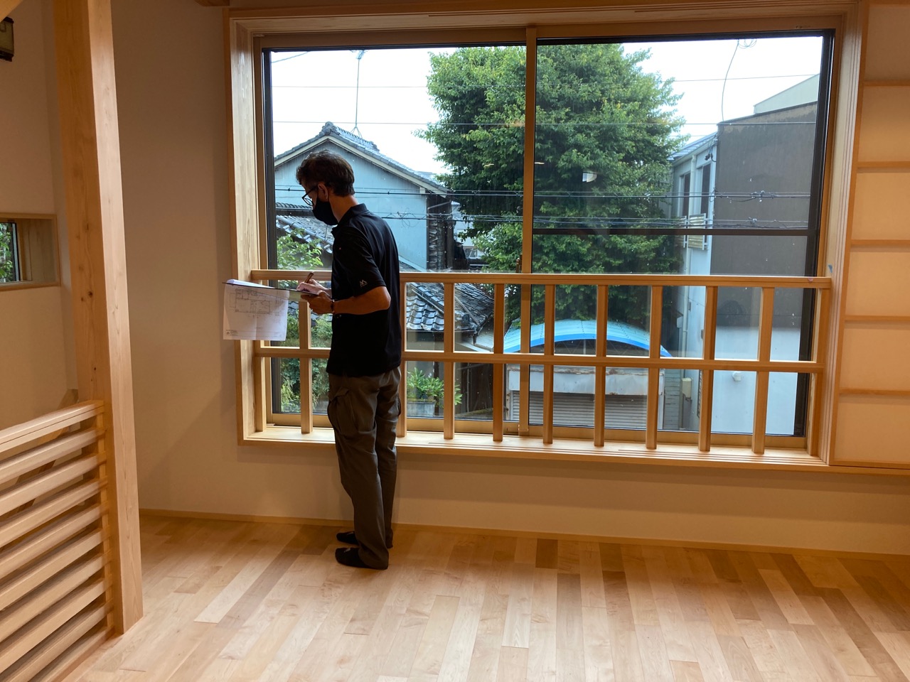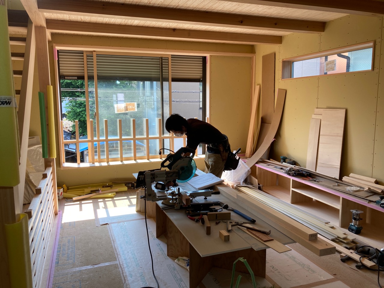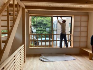 サッシの網戸の建込や、建具の建て合せの微調整。フットワークの軽さが自慢のs浦サッシ親子に来てもらいました。付近は都心を少し外れた住宅街で緑も豊かに残っています。イコールこの季節は蚊が多いので、網戸を入れてもらいこれで一安心です。