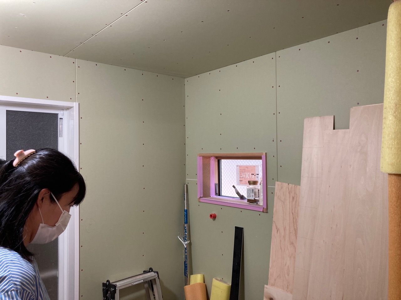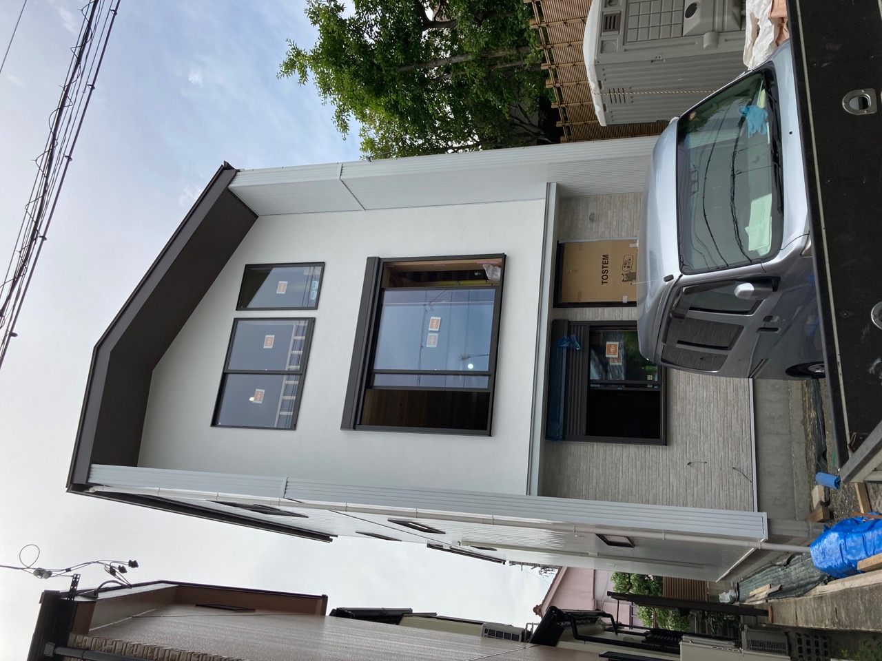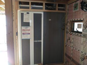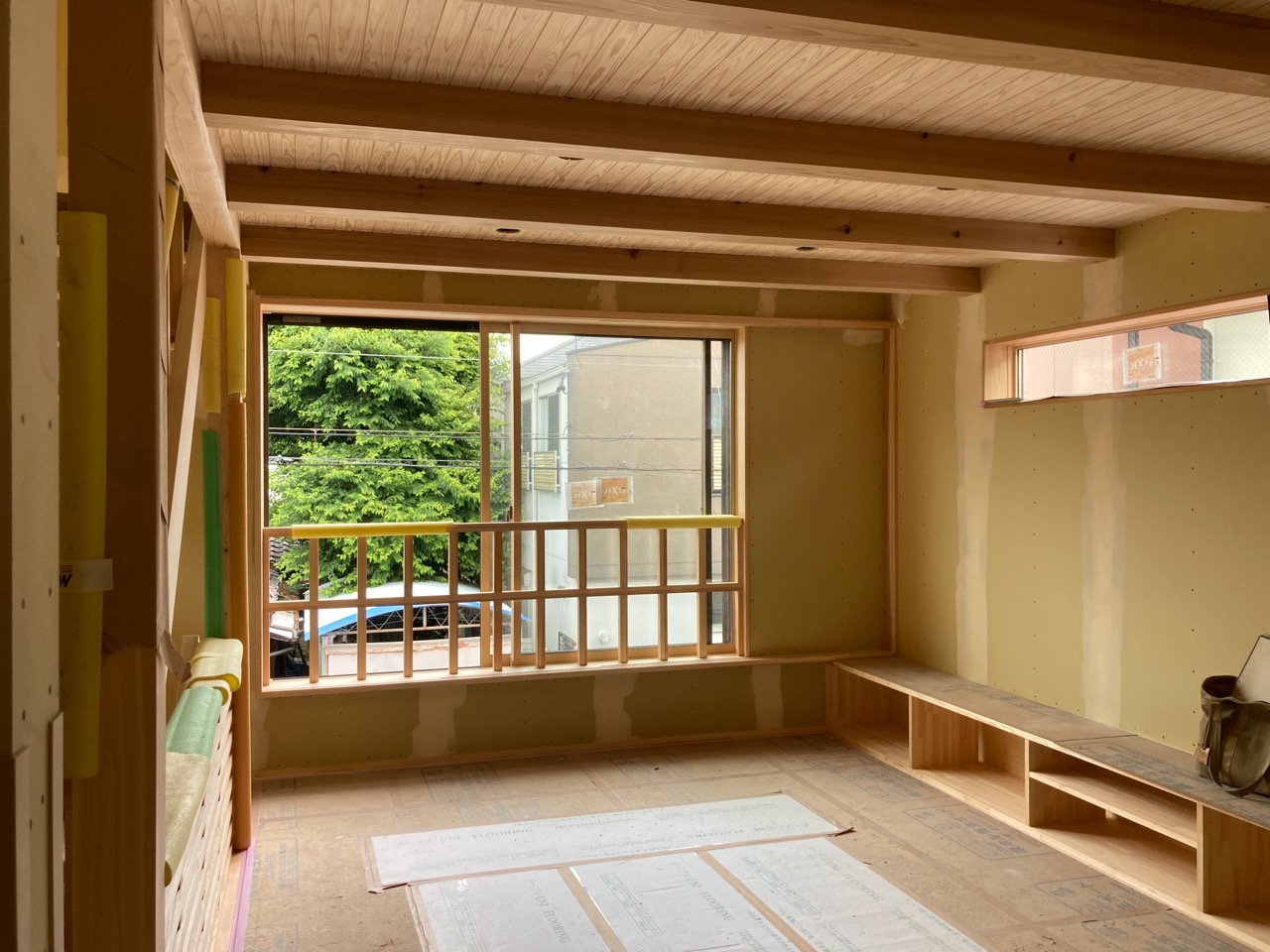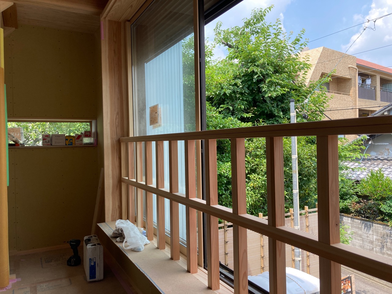 サッシの網戸の建込や、建具の建て合せの微調整。フットワークの軽さが自慢のs浦サッシ親子に来てもらいました。付近は都心を少し外れた住宅街で緑も豊かに残っています。イコールこの季節は蚊が多いので、網戸を入れてもらいこれで一安心です。