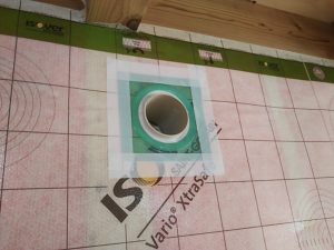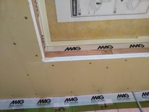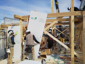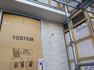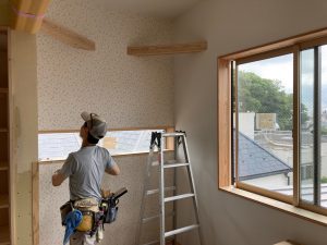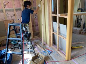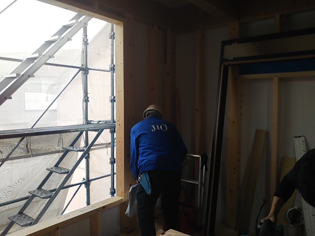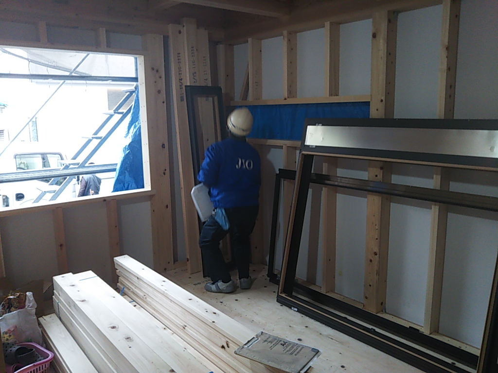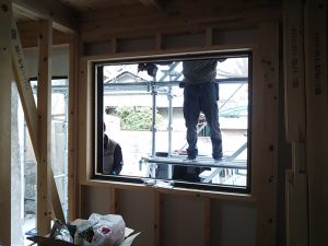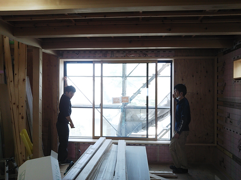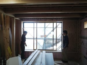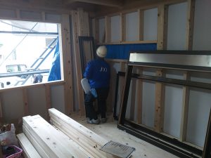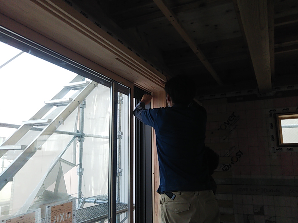 外壁面に防水シートが張られるのと並行してサッシの取付作業です。作業も二人いると非常にやり易いですね。