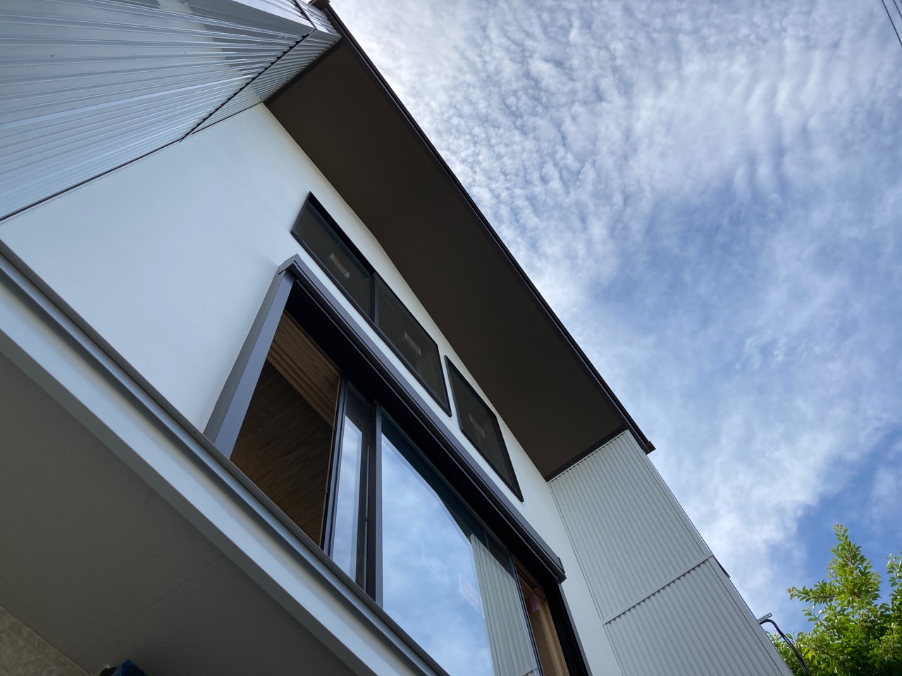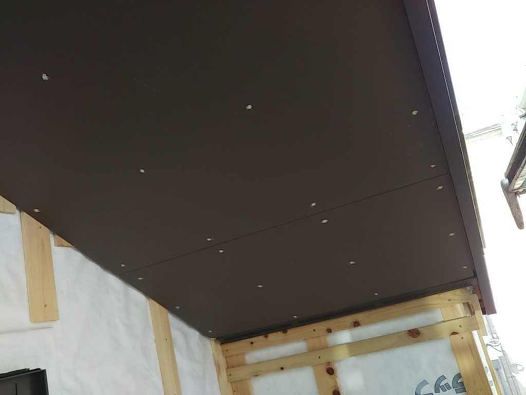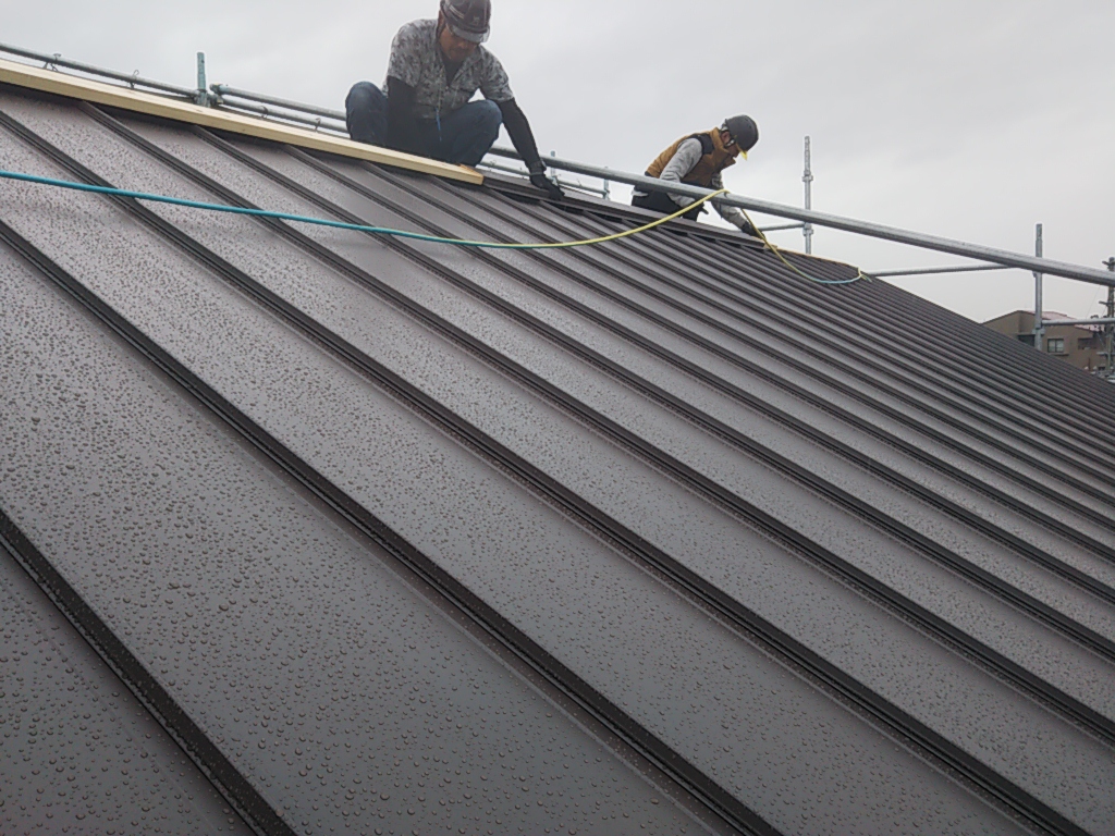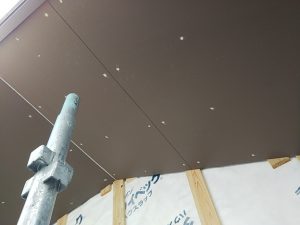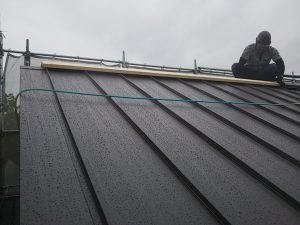 朝から屋根のガルバリウム鋼板を葺いてもらっていましたが、昼から天候がアヤシくなり雨が降ってきたので本日の作業はここまでです。降る前に勾配のきつい方が葺けていたので、後はやり易い方が残りました。