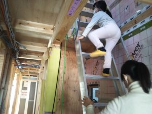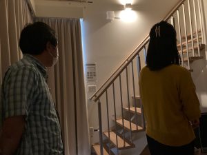 現場監督による各部の簡単な説明を行います。お住まいになった後も定期点検などでちょくちょくうかがいますので、ご不明な点は適宜お話しできるかと思います。それにしてもERIちゃんは早く引越ししてきたくて待ちきれなさそう、早くハシゴで遊びたいですね。