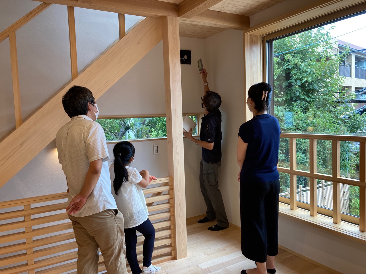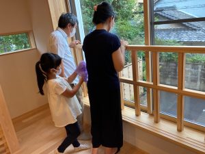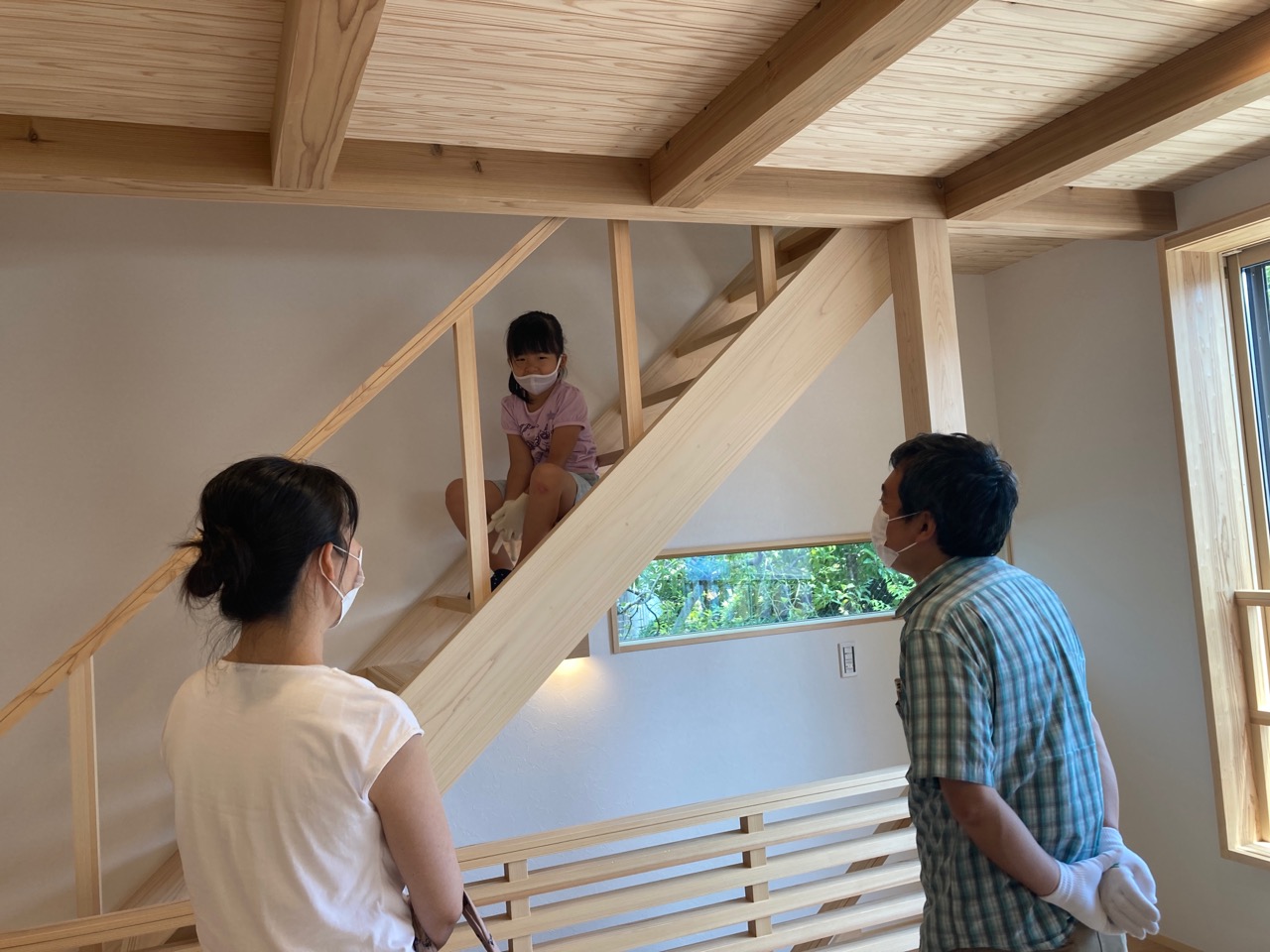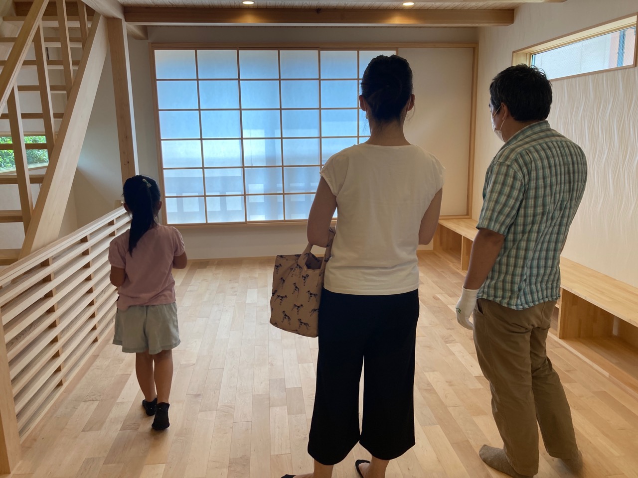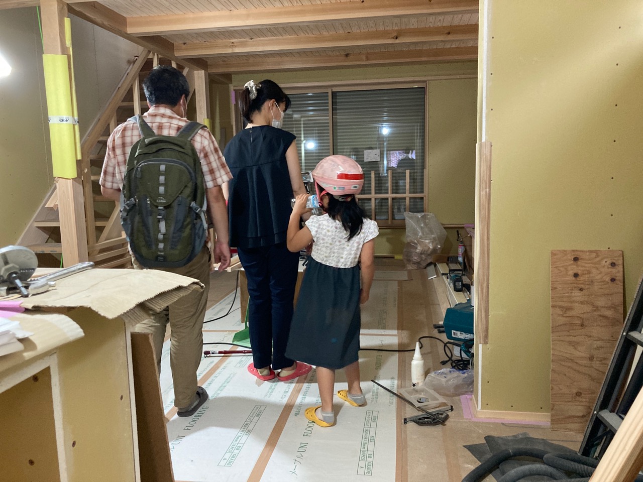 完成見学会初日にO様ご家族がご来場。完成クリーニング後は初めて現場をご覧になります。今まで道具や材料などで雑多としていた現場がキレイに清掃され『住宅』としてお目見えしました。初めて目の当たりにする生活空間としての我が家の現場に期待も膨らみます。