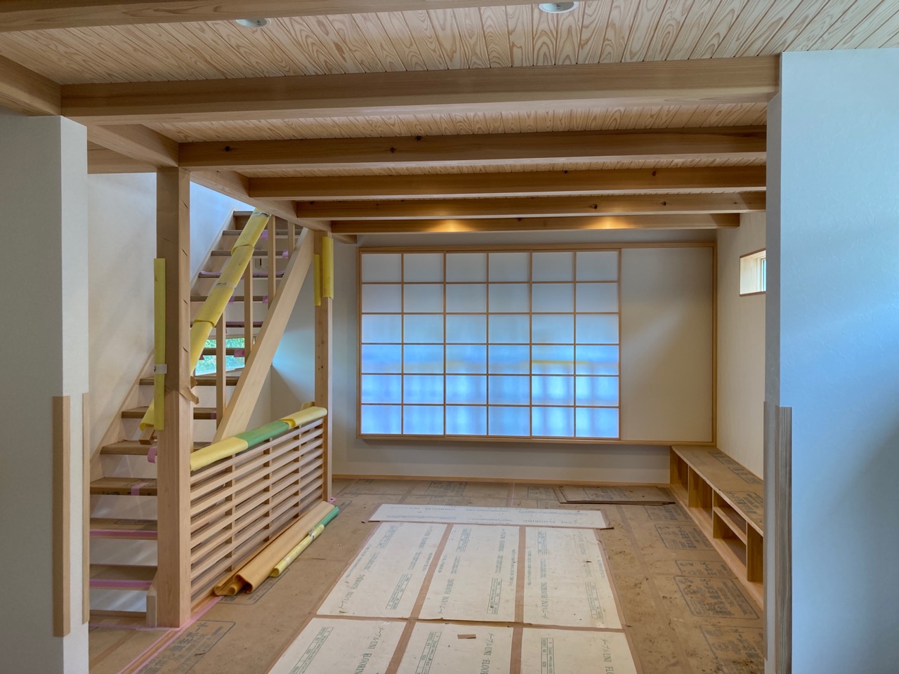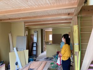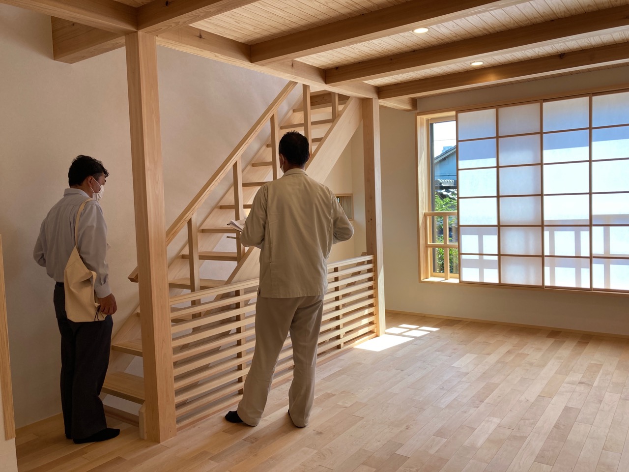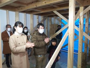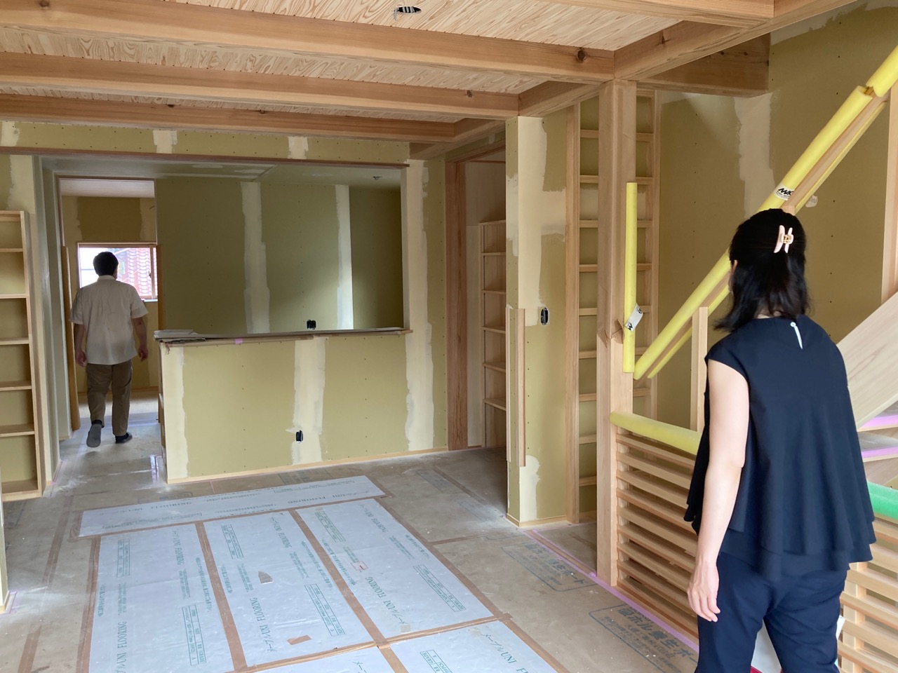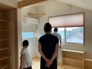 完成見学会初日にO様ご家族がご来場。完成クリーニング後は初めて現場をご覧になります。今まで道具や材料などで雑多としていた現場がキレイに清掃され『住宅』としてお目見えしました。初めて目の当たりにする生活空間としての我が家の現場に期待も膨らみます。