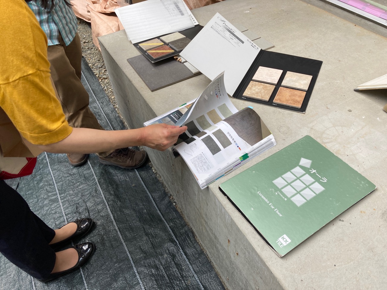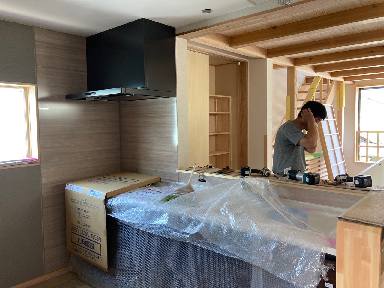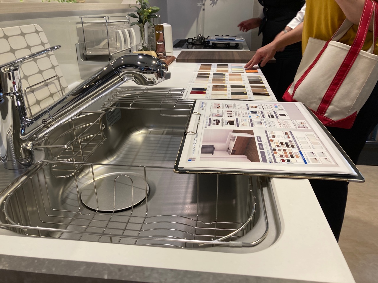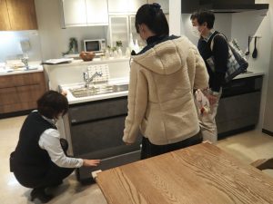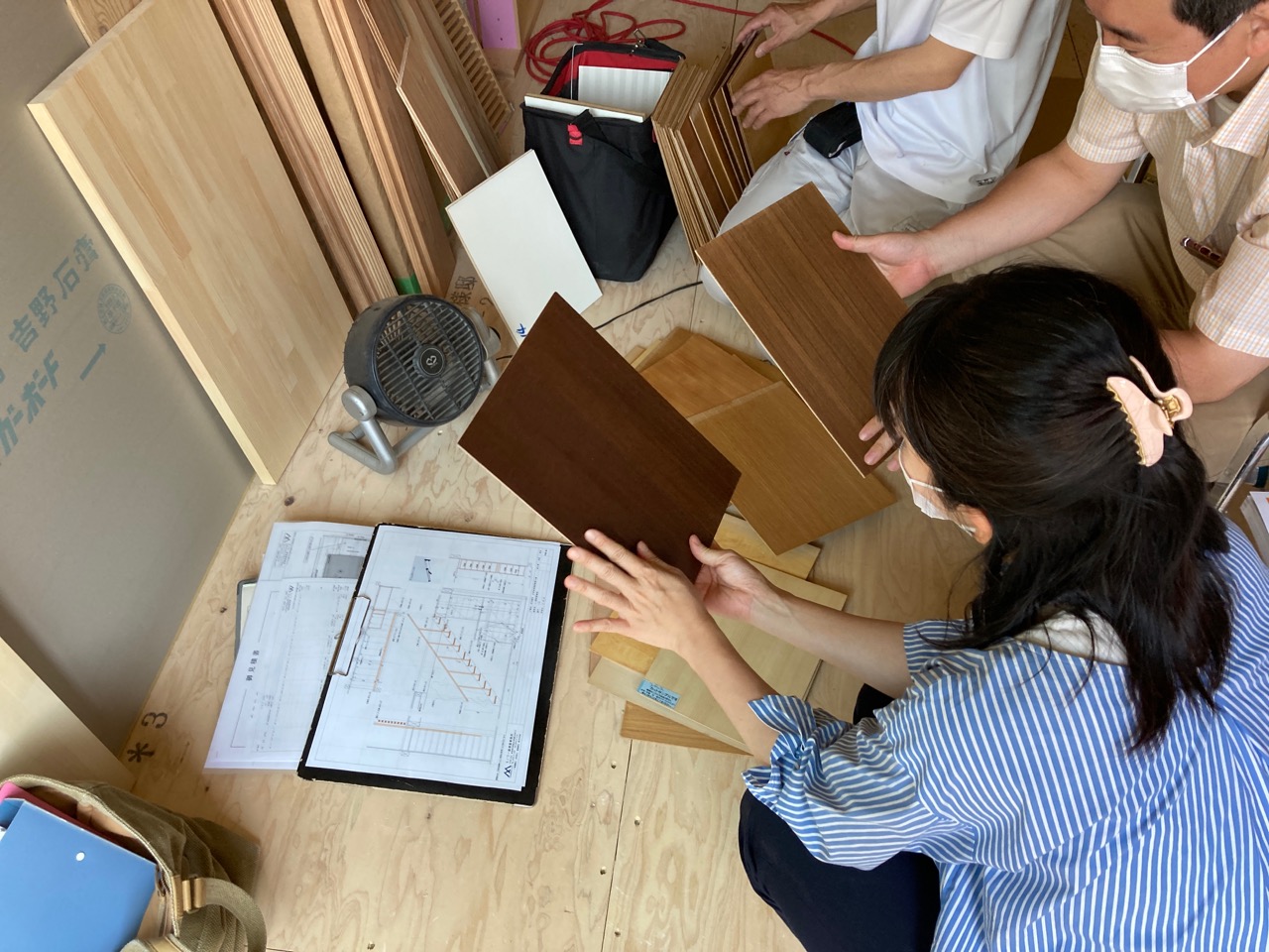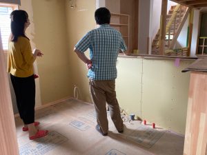 キッチン設備も見学。奥様としては扉や天板の色味の組み合わせが大変気になるところです。キッチンは工程の中では比較的最後の方に設置しますので、これから検討を重ねていきます。