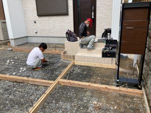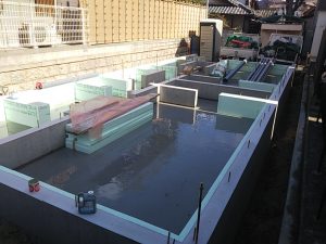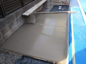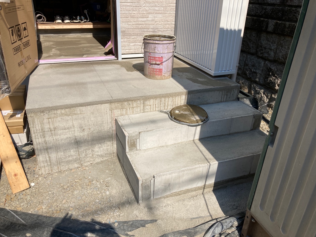 最終的に外部ウッドデッキになる部分と玄関ポーチになる部分の土間コンクリートを打設しました。建物が建ってからでは裏手側にあるデッキ用コンクリートは打設が困難になるため先に施工しておきます。
