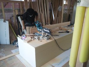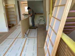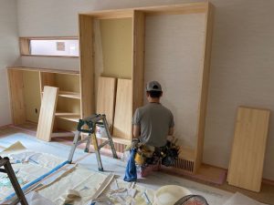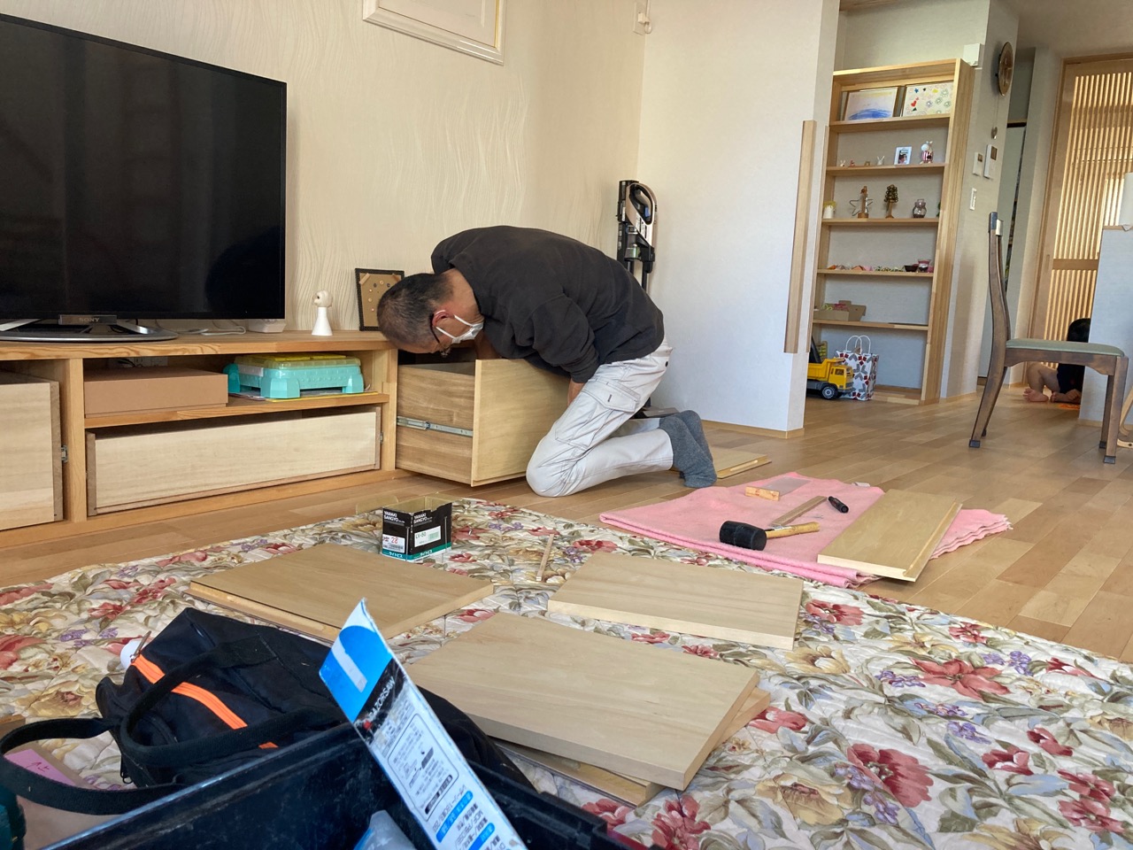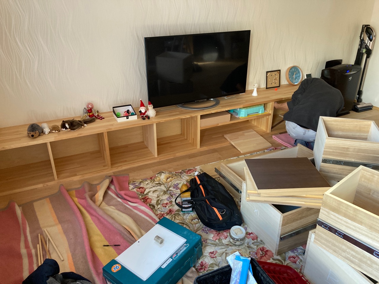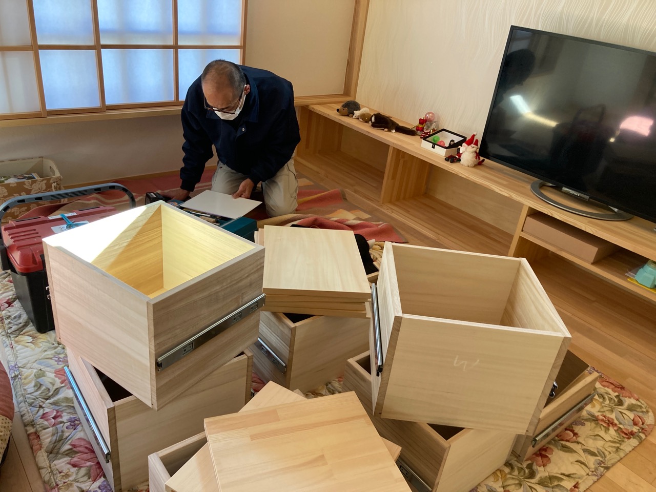 先日採寸しておいたTV棚の引き出しを製作し、取付にやってきました。家具工事をお願いしたf木工さんと材料、道具を2階リビングまで搬入していざ取付開始です。