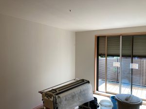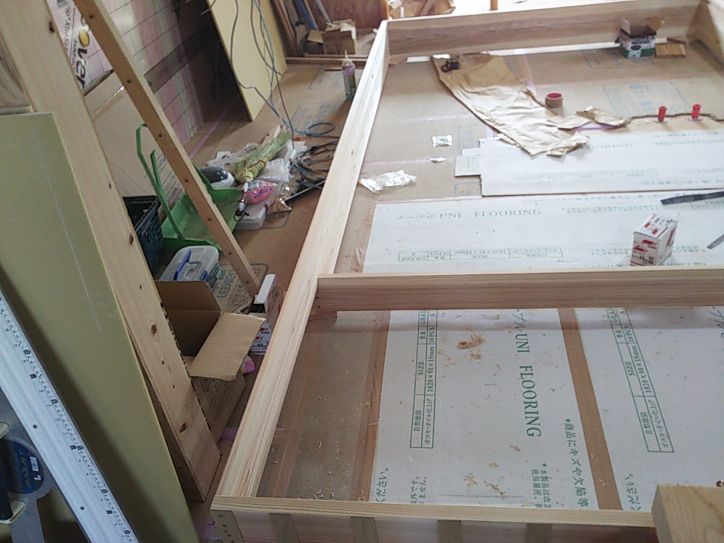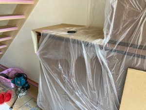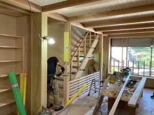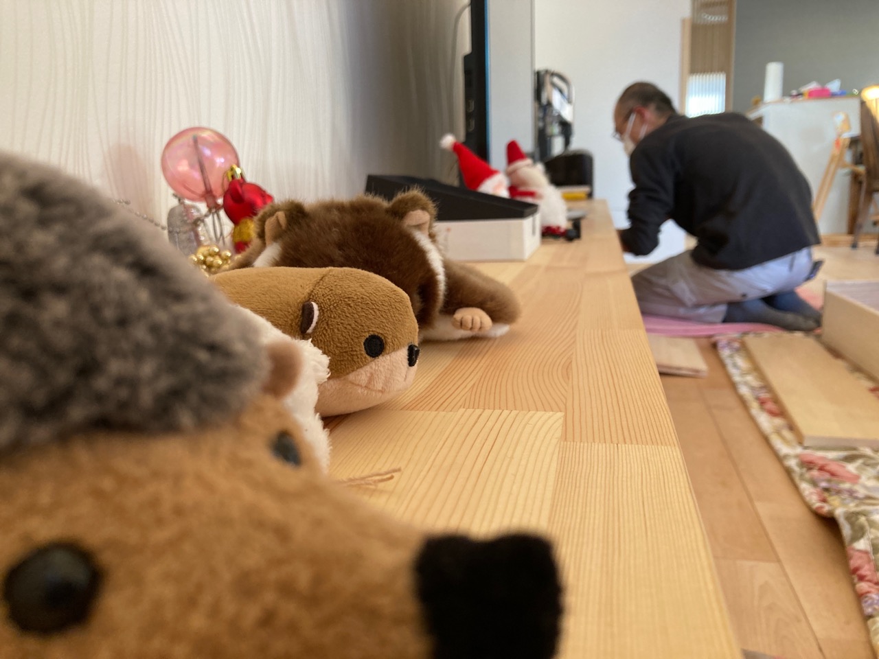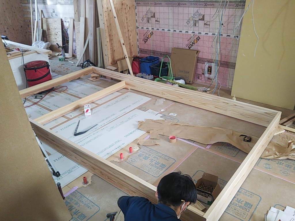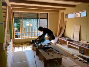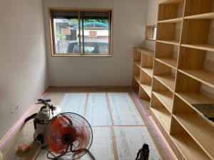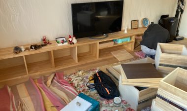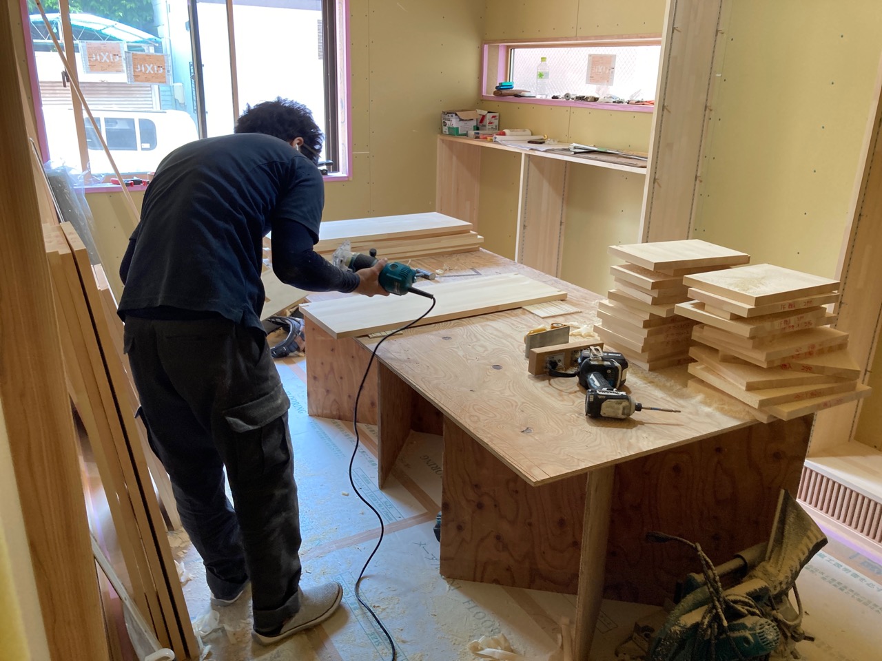 先日採寸しておいたTV棚の引き出しを製作し、取付にやってきました。家具工事をお願いしたf木工さんと材料、道具を2階リビングまで搬入していざ取付開始です。