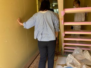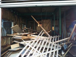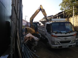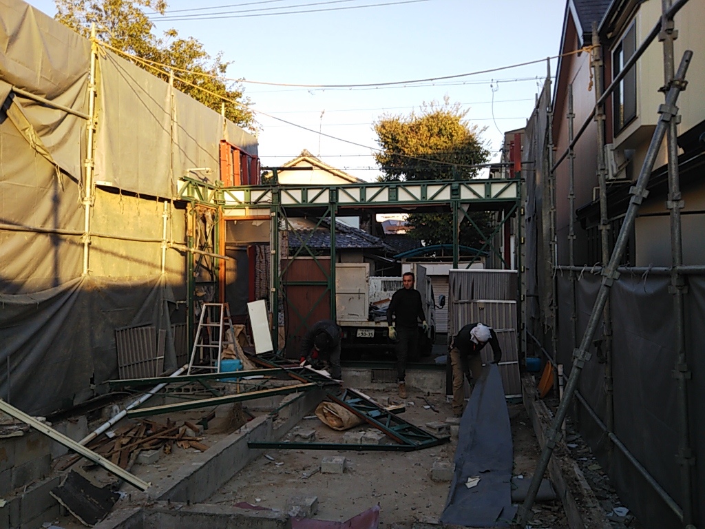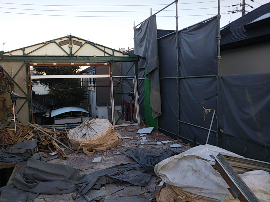 内装の解体から進んでいます。近隣住宅が迫っているので、おいそれと重機を使う事ができず、内部は人力で解体しています。