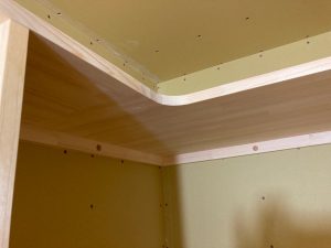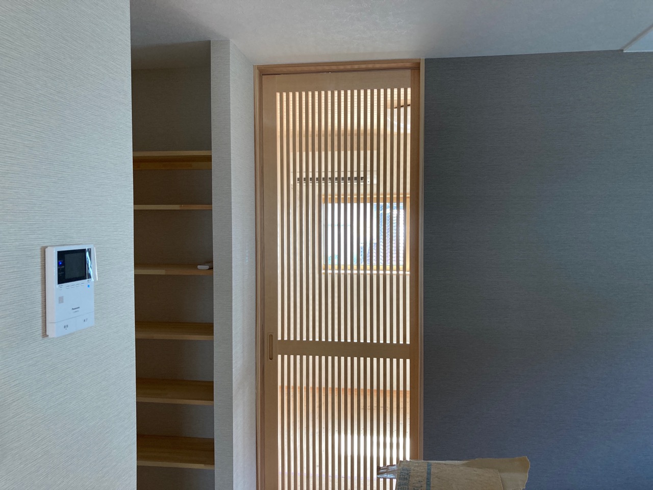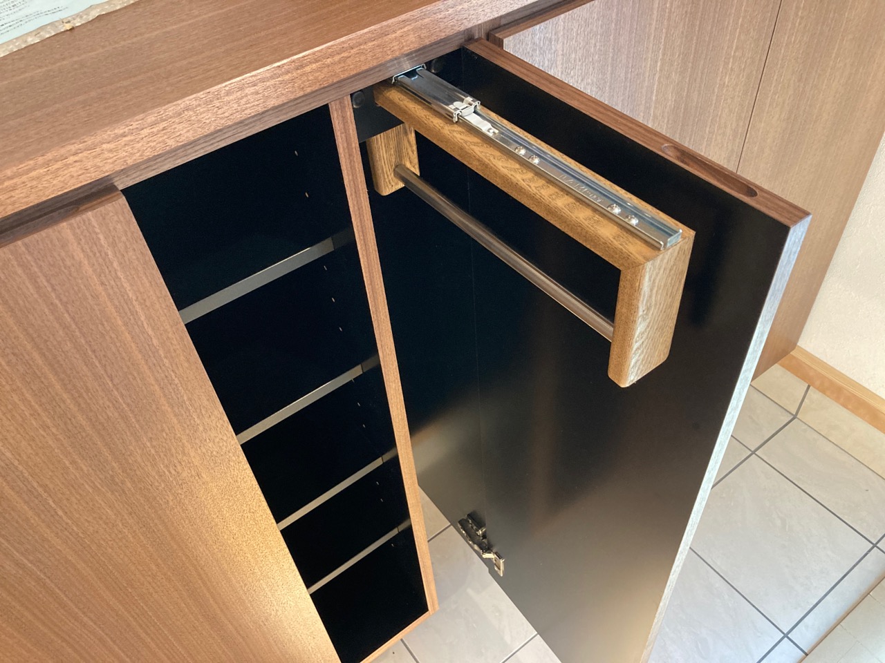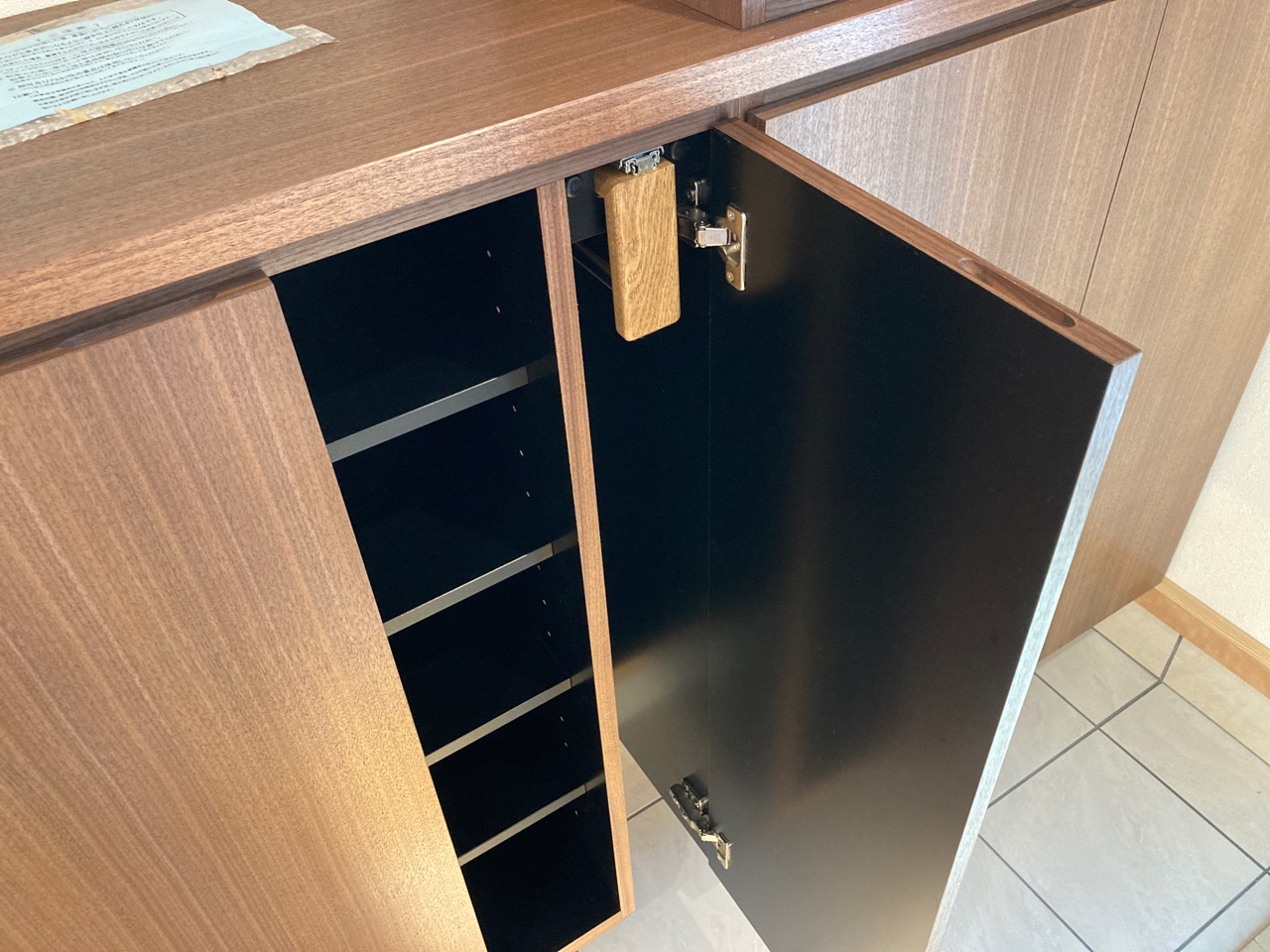大工さんで造作した棚に家具工事で引き出しを取付けるという収まり方ははしばしば採用しますが、こういう状況でも微調整が効くというのがオーダー家具の利点です。
