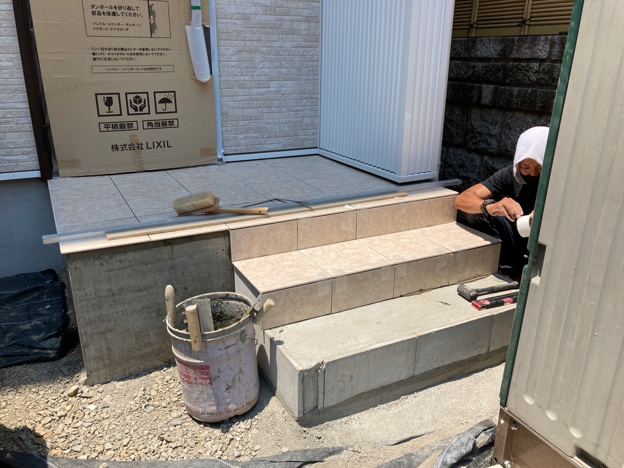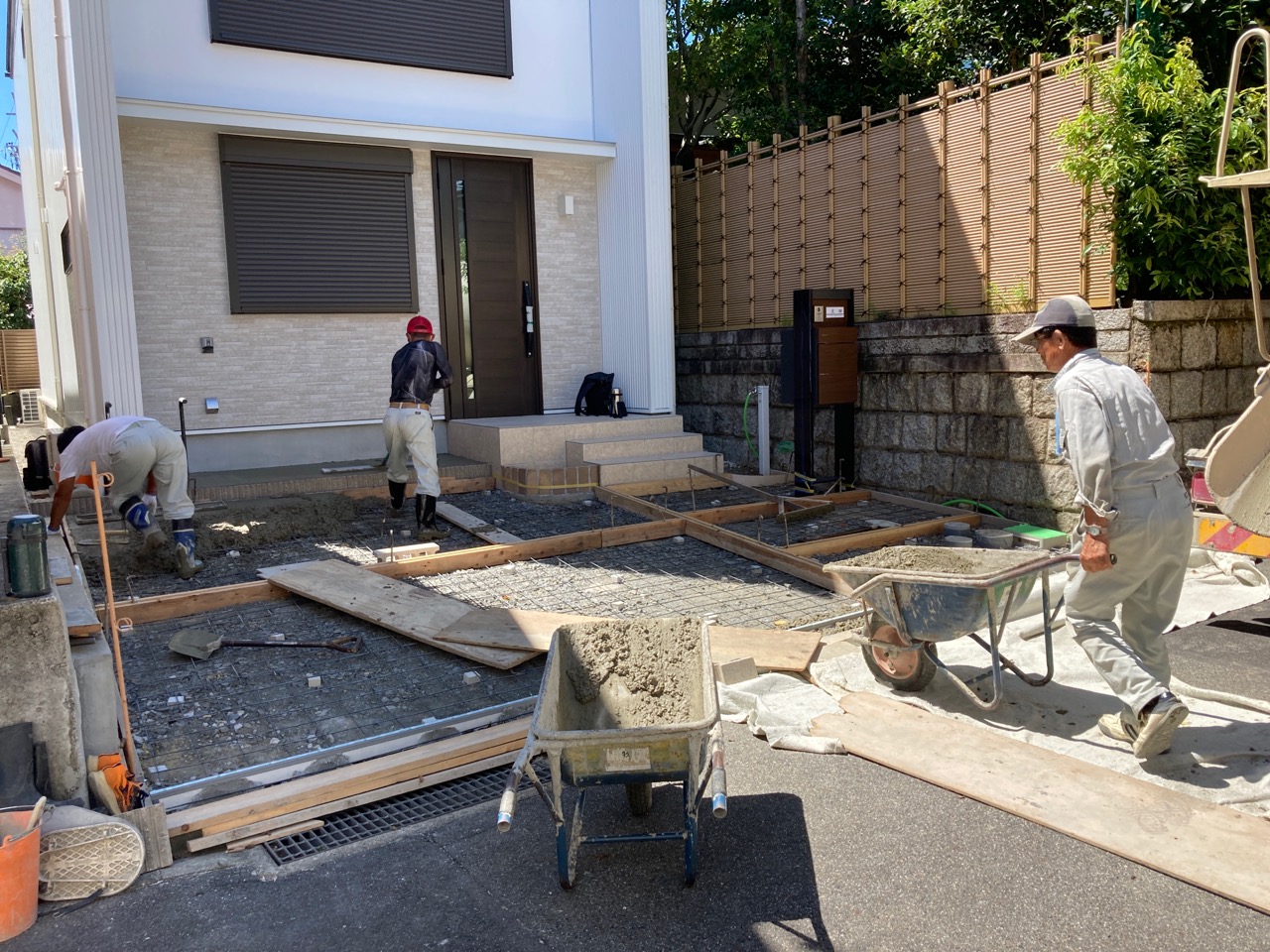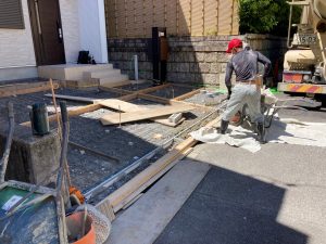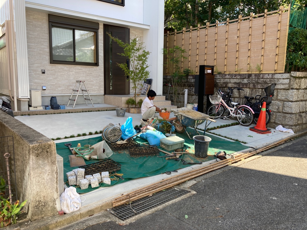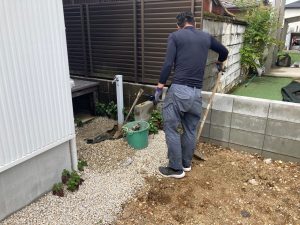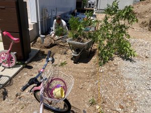 間口が広がった分、軽自動車の駐車できるスペースが欲しい、という計画ですので、軽自動車が止まれるだけの奥行き寸法を確保する必要があります。従来は自転車を置いていた背後に、門柱や植栽がありましたのでそれらも奥に移動します。まずは植栽の移植から進めます。6月半ばとは言え予報では7月下旬の真夏日。職人さんもいつもの事とはいえ、人力での移植です。熱中症にはお気を付けください。