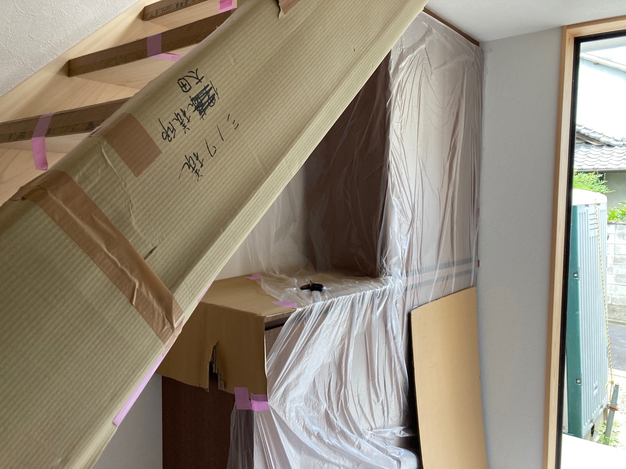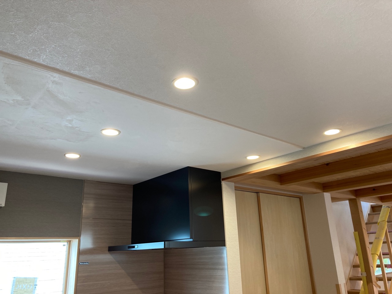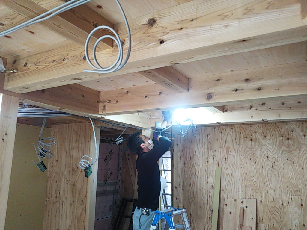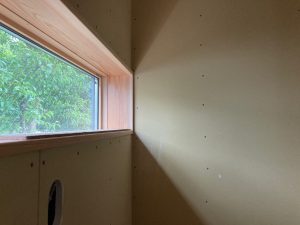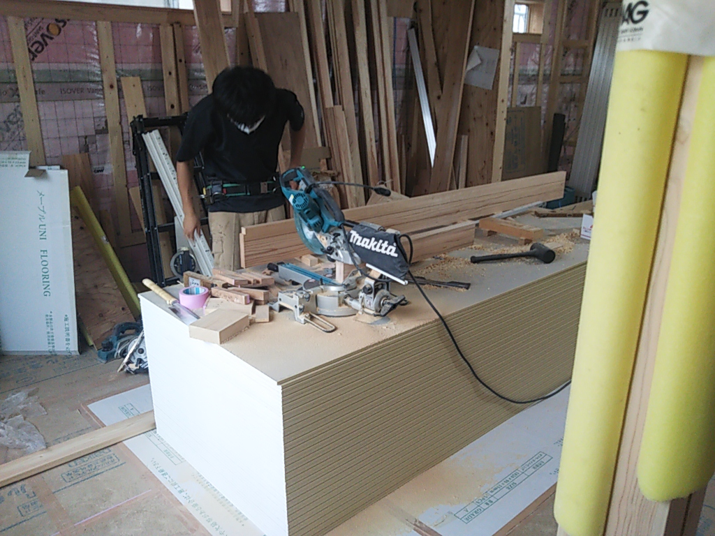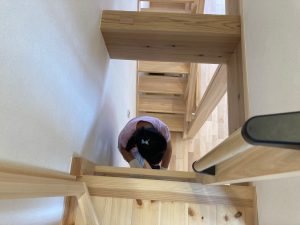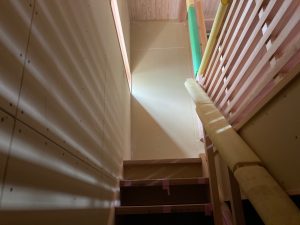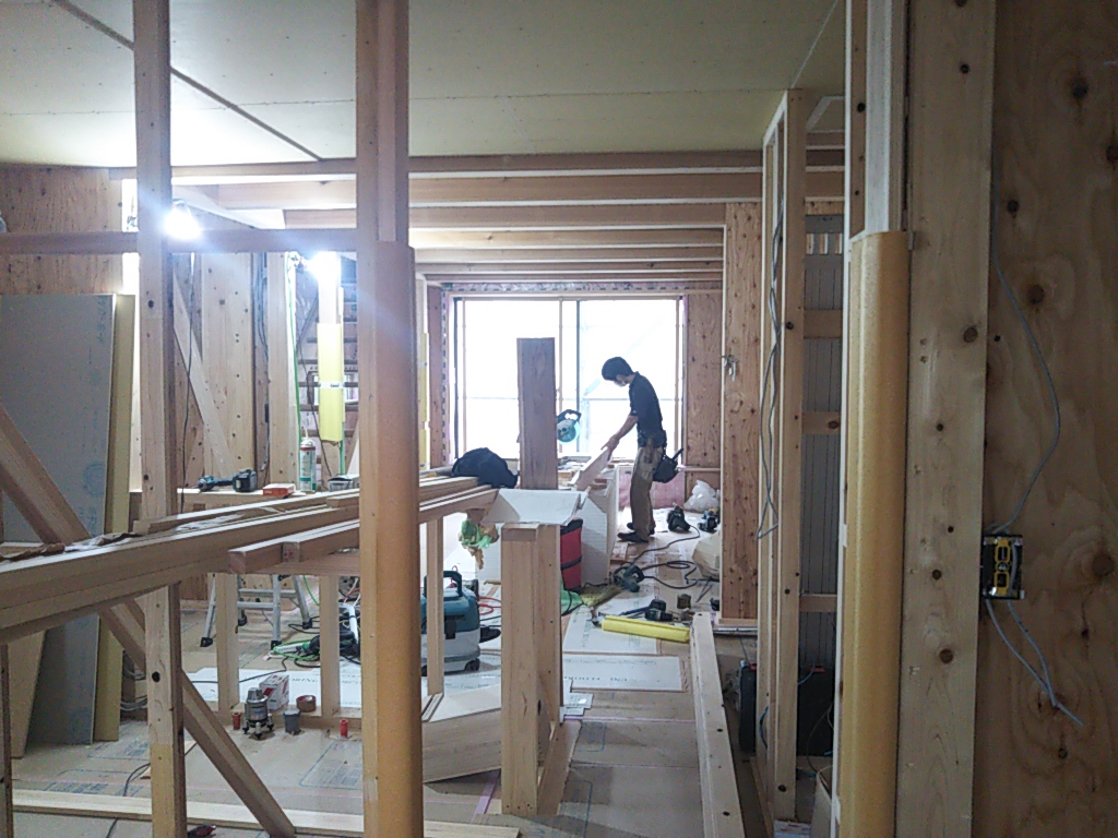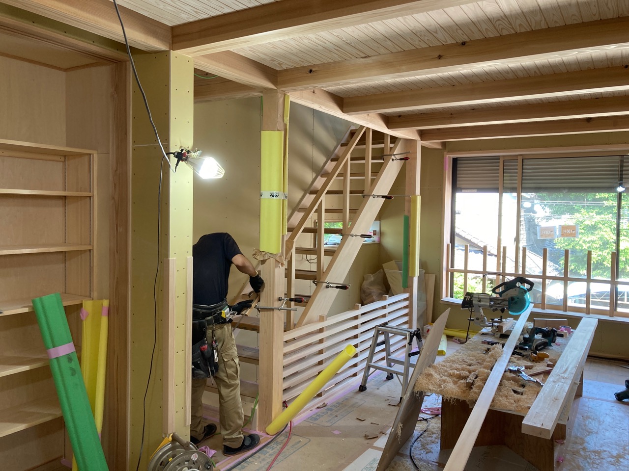 週末の完成見学会に先駆けて社内検査が行われました。限られた空間の中で造作工事を行ってもらいましたので長い材料を持ち上げたりした時に『不慮の事故』の跡がちらほら・・・この後はリペアの職人の出番です。キズのあった個所を知っている者でさえ後で分からなくなるような補修の達人に入ってもらいます。
