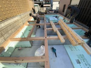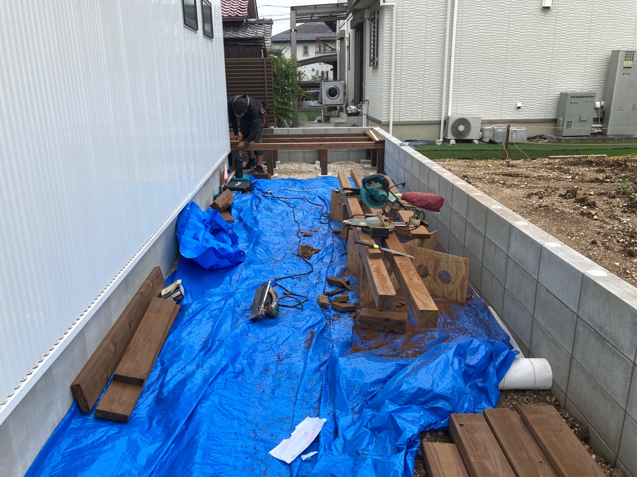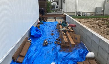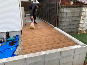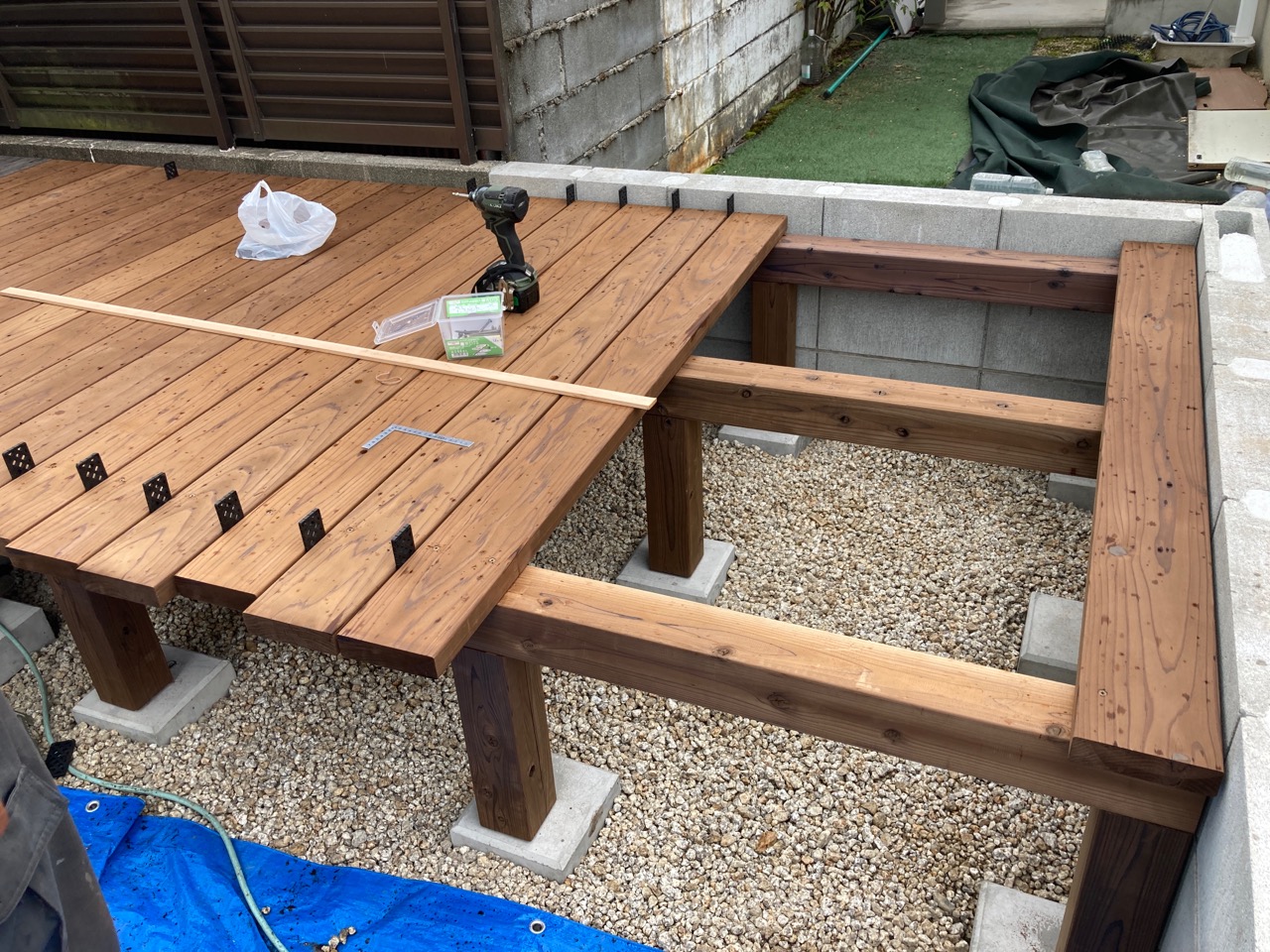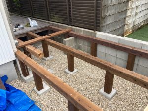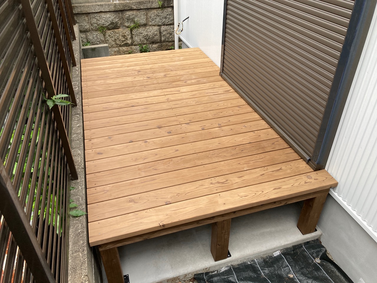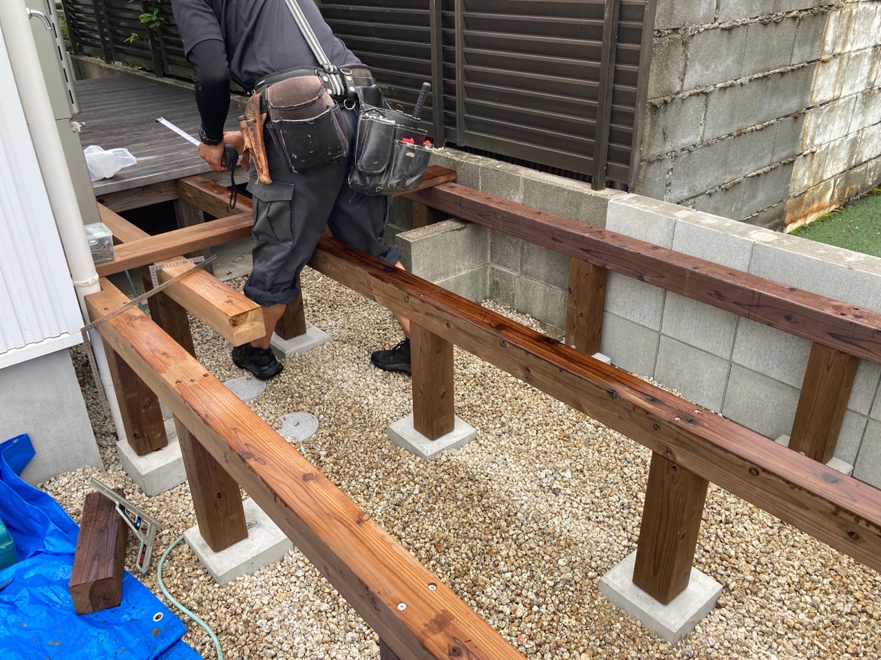 ウッドデッキの延長工事。奥行きの長い敷地の短辺方向が広がった分、スペースを有効に活用するため、約3.5mほどウッドデッキを伸ばす事にしました。
