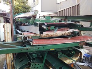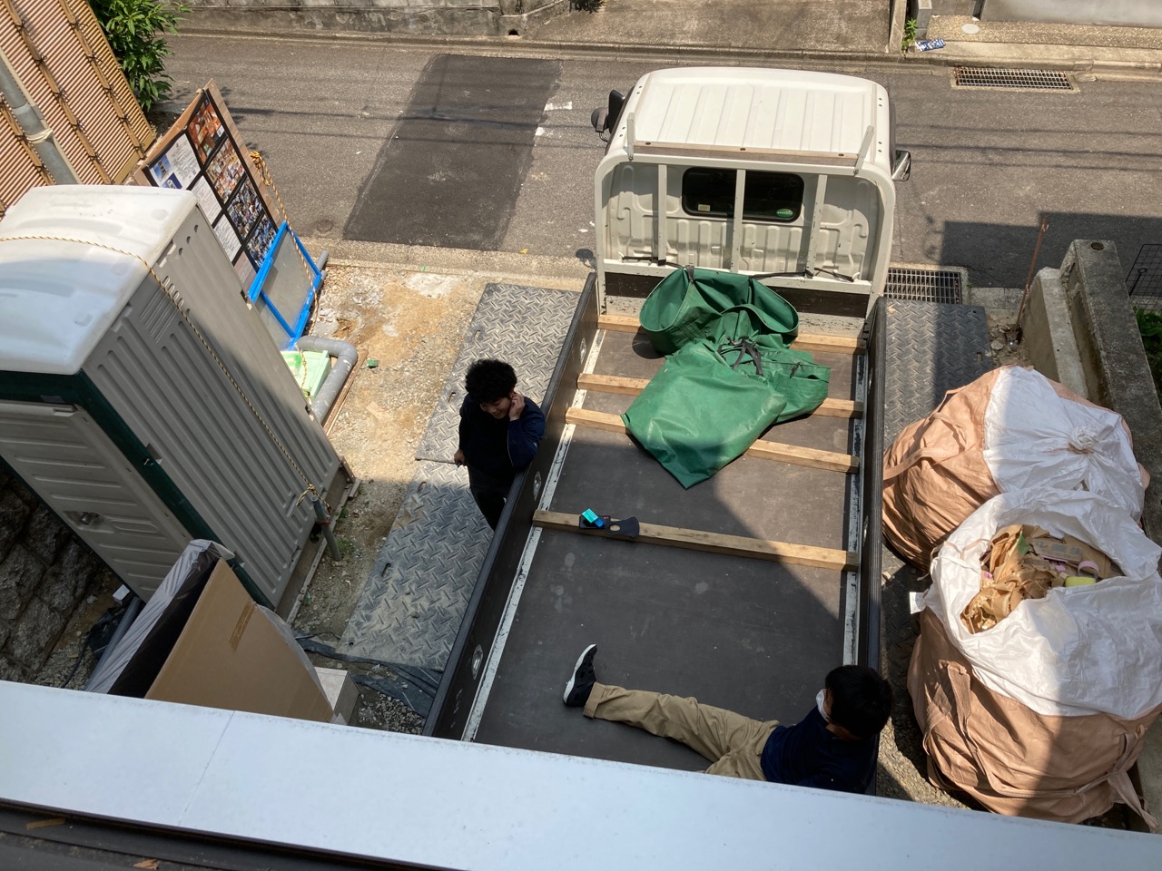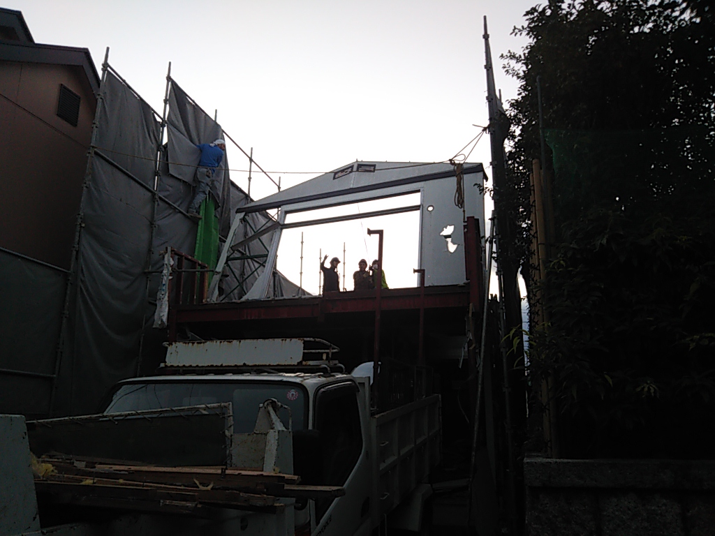 1階の構造もほぼ解体されました。トラックに積まれた軽量鉄骨の量がその構造躯体の合理性を物語る。明日からは重機を投入して基礎コンクリートの解体にかかる予定です。