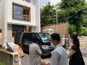 お隣様もすっかりと解体作業が終わってしまいました。実際にどれくらいの大きさの倉庫が設置できるか現場調査に入りました。限られたスペースを有効に使い、都心で不足しがちな外部収納(一部屋内の物も収納しておく)を確保する狙いです。
