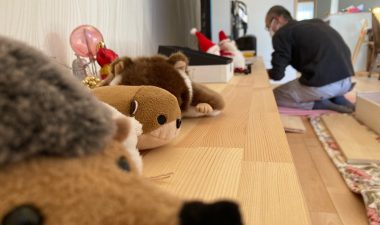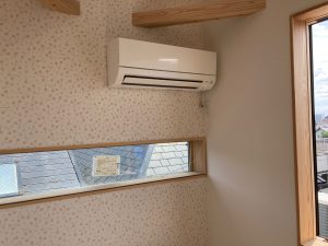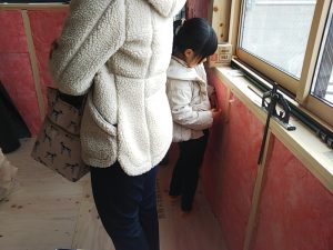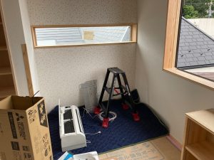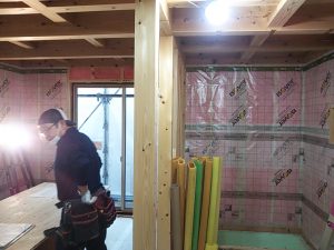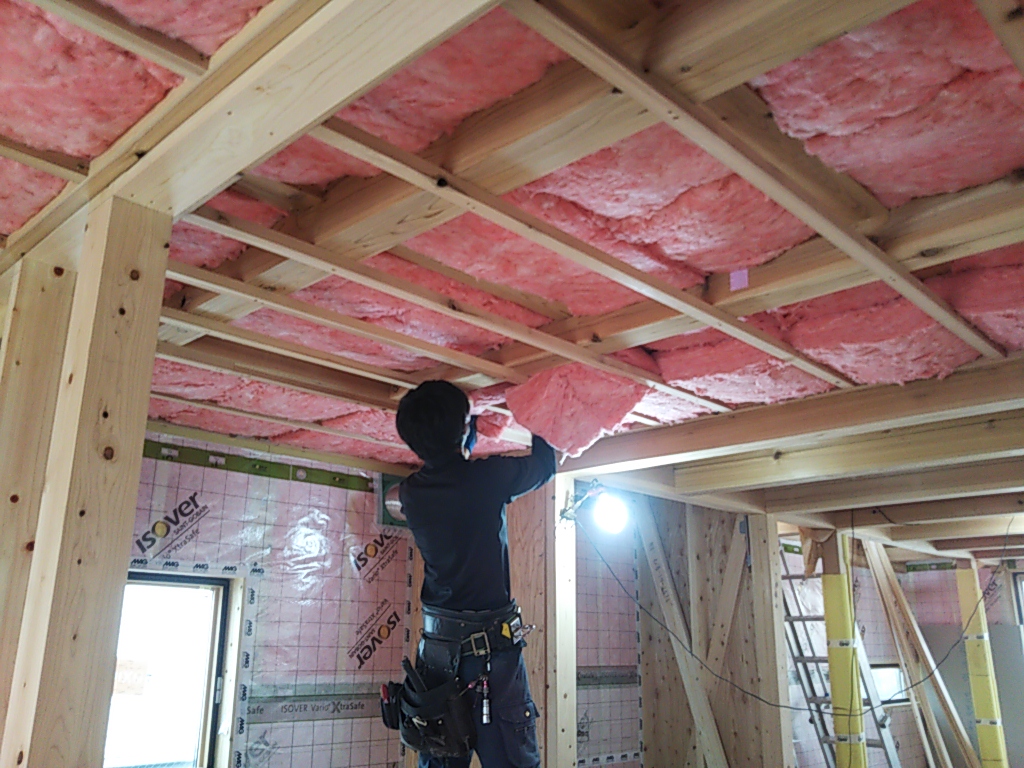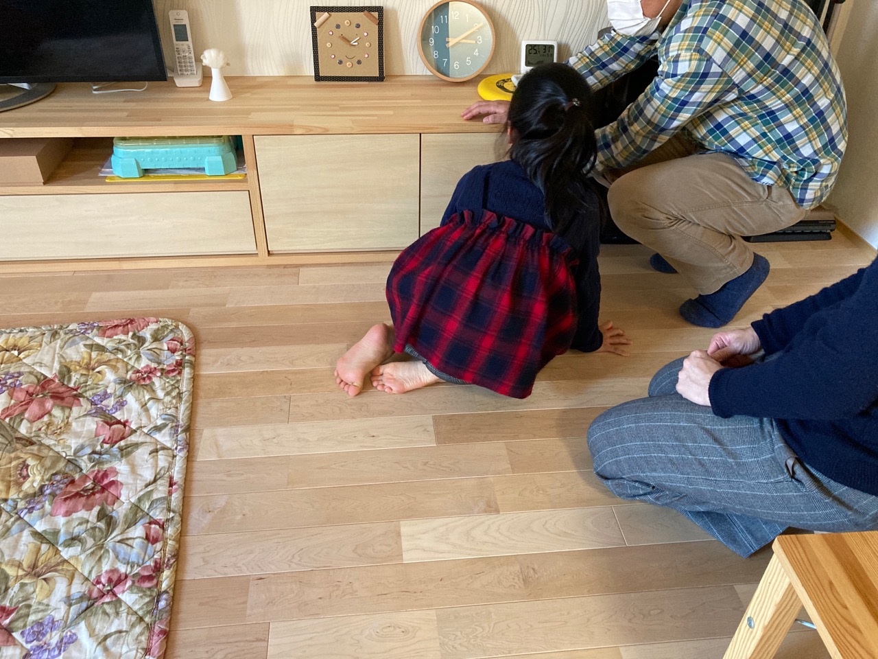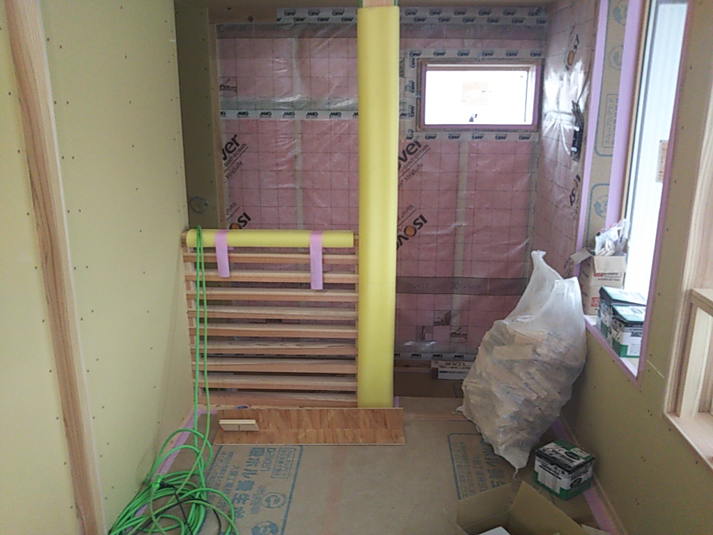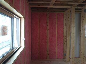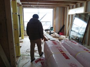本日は営業所を出る際にチラッとだけ雪が降ったという非常に寒い日でしたが、o様邸に入ると上着を着ていると暑いくらいでした。エアコンの設定温度をたずねると『20℃よりは下げていますよ。』とo様。それはすでに夏季の冷房の設定では・・?というくらいの断熱材の威力を感じた瞬間です。高気密高断熱住宅の温熱環境がもたらす室内の気持ち良さにEriちゃんも部屋では裸足で過ごそうというものです。
