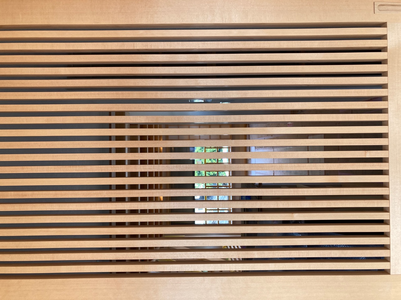 建具の面材に使用したのと同じシナベニヤを引出の前板材としました。うっすらと見える木目を隣の前板同士で揃えるあたりさすがは家具職人さんです。シナベニヤは面材の中では比較的安価であり、あまり木目を主張しすぎず、柔らかい印象を受ける材料ですので、筆者は好んでよく採用しています。