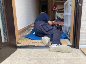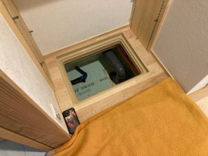 塹壕に身を潜める旧陸軍兵ではありません。 t電気さんに框下間接照明の微調整をお願いしました。床近くに取付ける物で目視できる寸法はわずか。大変な部分ですがキッチリと仕上げてくれました。