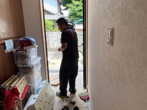 後付けの工事ですので、カメラ用の電源をどこから配線するか、事前に検討しておきます。たまたま近くに電源をとれそうなコンセントがありましたのでそこから外部配管、配線を行います。内部でもインターホン親機を取り換えてカメラに対応できるように施工します。