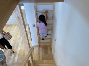 リビングの一角に設置された3階のERIちゃんの部屋へ通じるヒミツの通路にかかるハシゴ。早速上ってみます。他のご来場者の方もみえる度にデモンストレーションをしてくれました。気に入ってもらえたなら何よりです。