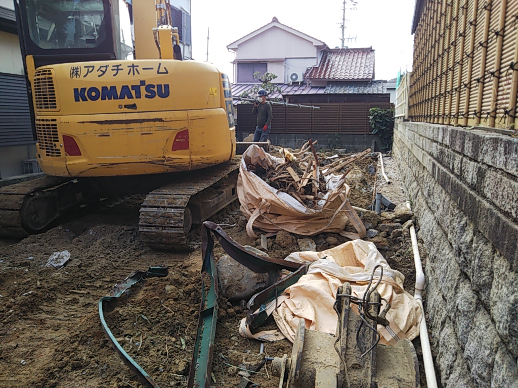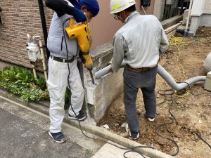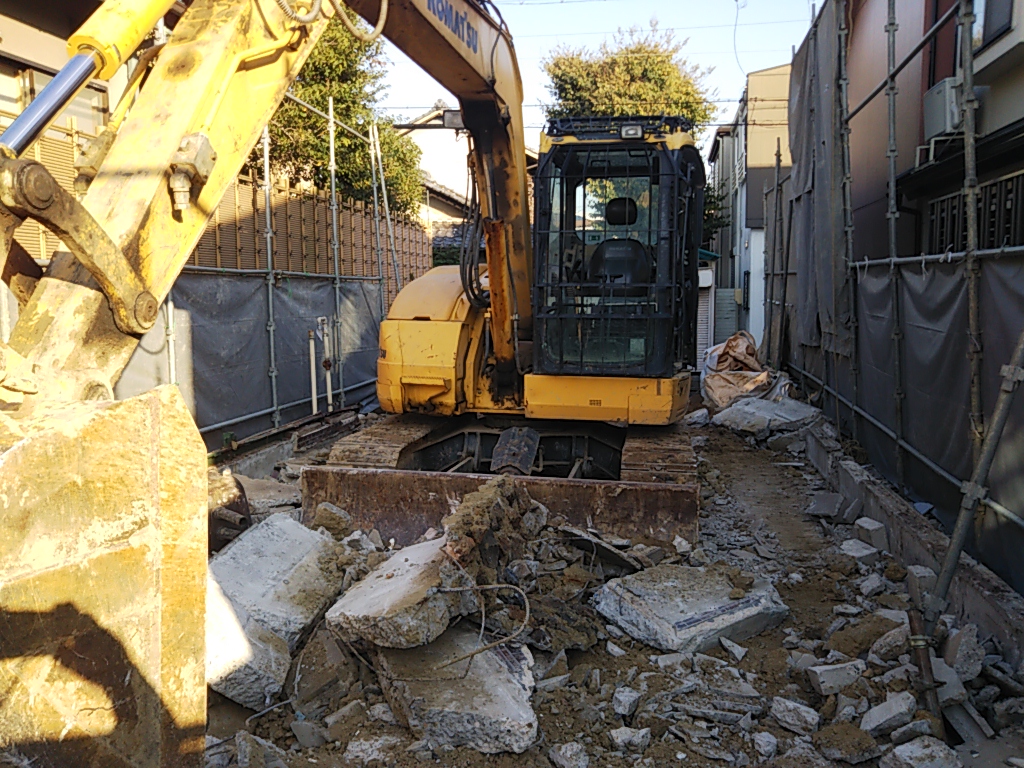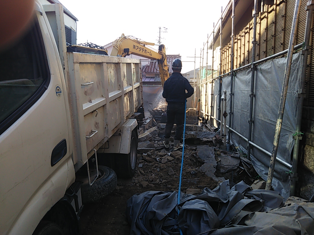 既存のコンクリート塀を解体しています。o様邸の敷地に面する東側の道路は幅3.6mであり建築基準法第42条2項道路、というものに該当します。簡単に言えば4.0m未満の道路です。このような場合、道路の中心からお向いさんとお互いに2.0mずつ控えるように(合計4.0mになるように)指摘を受けます。住宅などの建築物だけでなく、塀などの工作物も出ていてはいけません。今回の場合4.0-3.6=0.4m お向いさんと半分ずつで0.4÷2=0.2m→20㎝飛び出ている、という事になりますので、その分コンクリートを解体して道路に出ていない、という形にして検査を受ける必要があります。