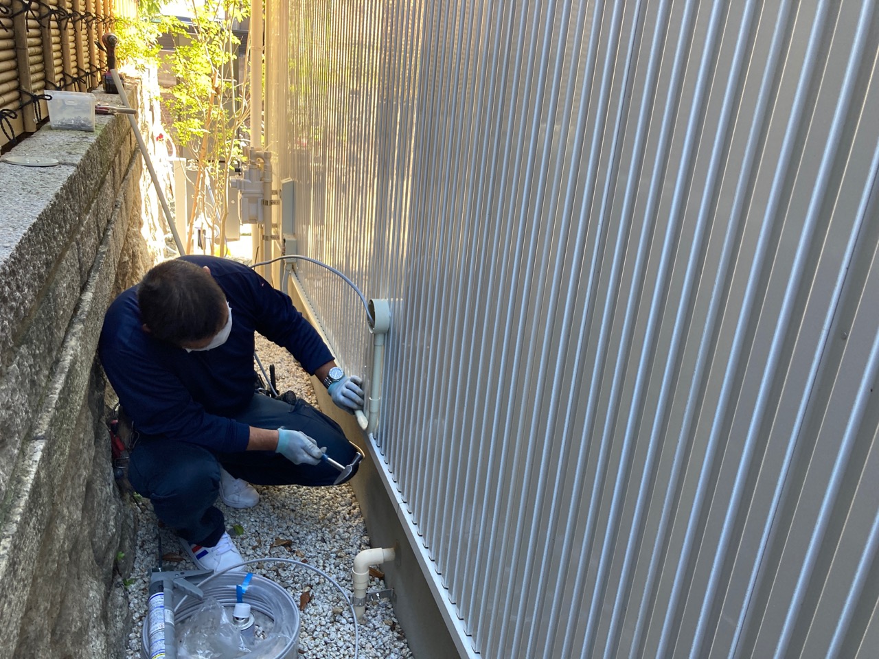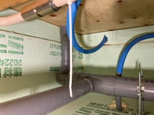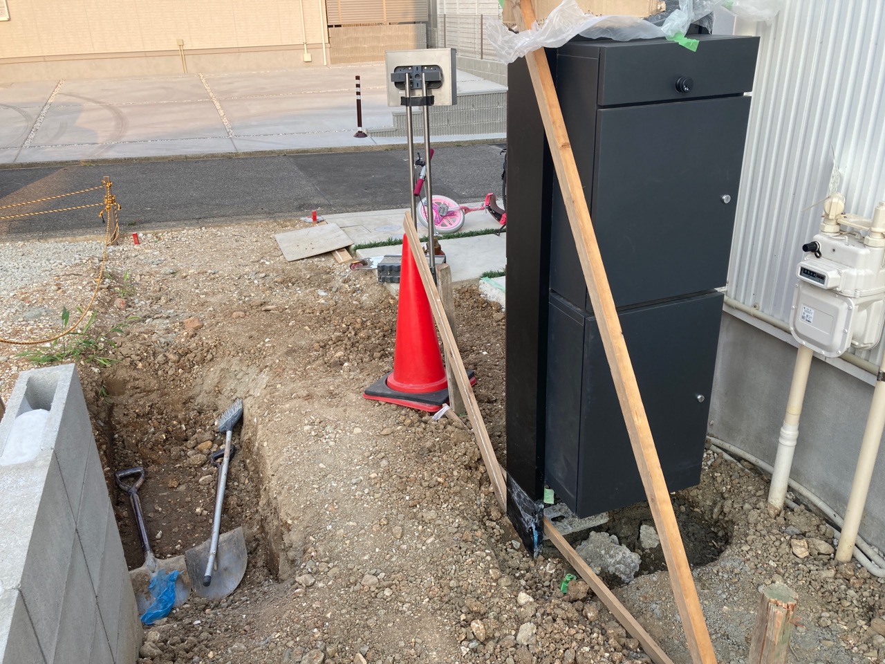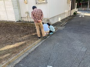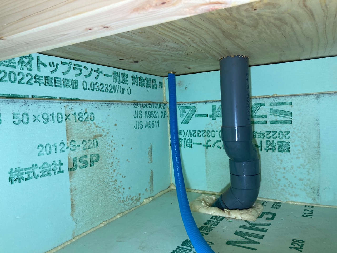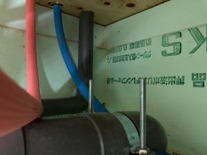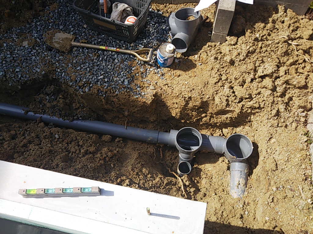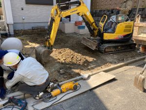 ショールームから現場へ帰ってきたら水道業者さんが現場で作業中。隣地との離隔があまりないため、上棟が行われる前に両サイドの配管を先行して埋設しておきます。
