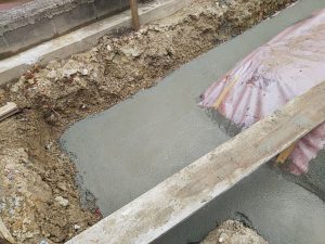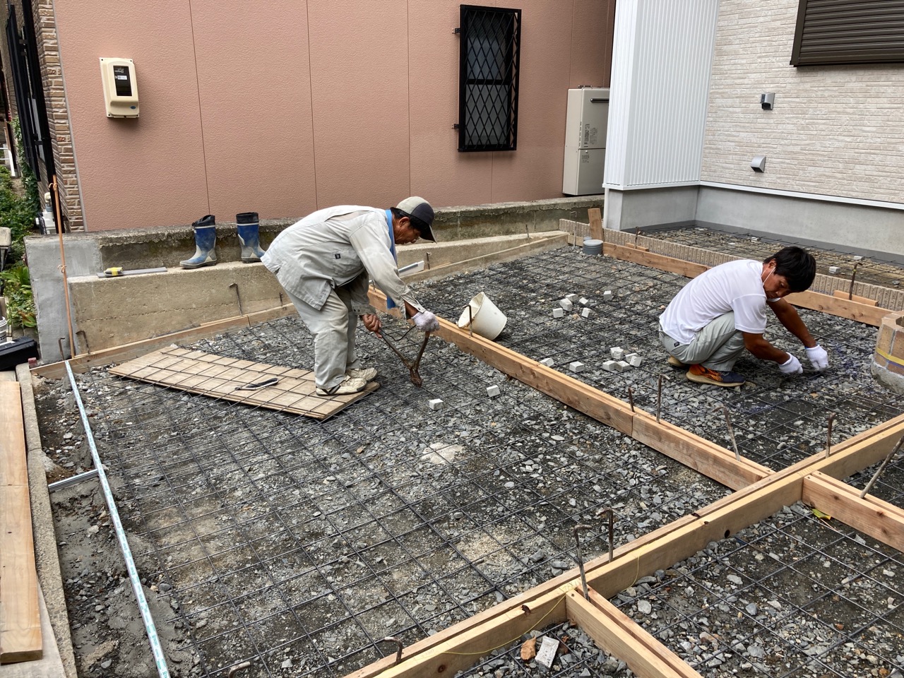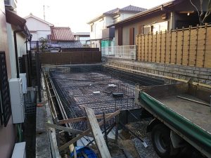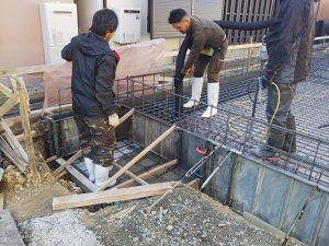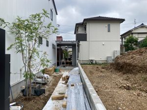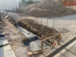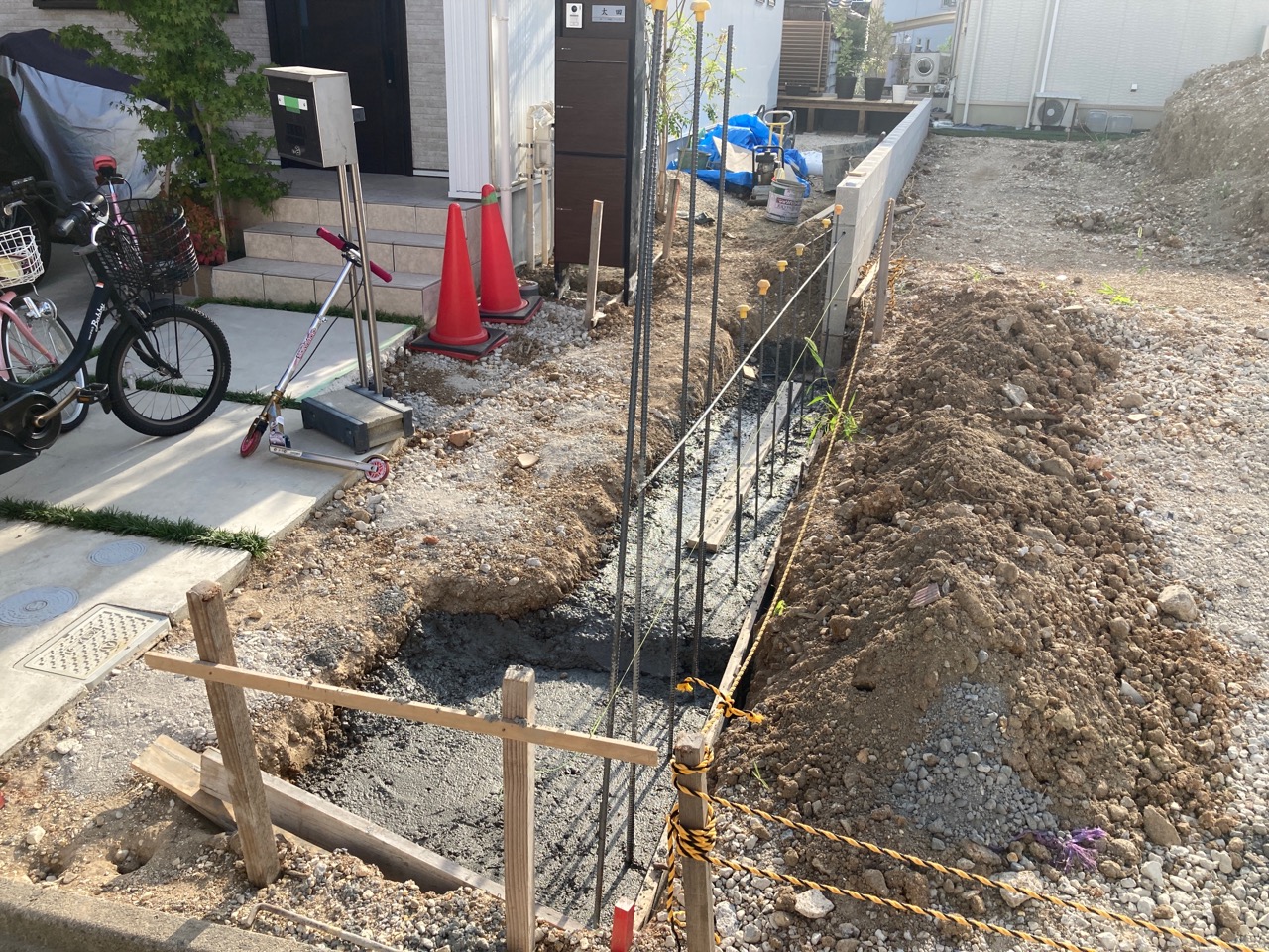 新たに間口が広がった境界線上には視線を隠すための塀を作成します。構造コンクリートブロック組積造で製作するので、まずは堀方、基礎コンクリートを打設し、鉄筋を建ち並べておきます。天候も何とか持っていますので、ブロックを積むまでは降らずにおいてもらうとありがたいです。