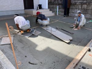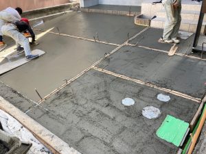 打設後は職人さん3人で金コテ押え。気温の高い時期にスランプ値の小さい硬めのコンクリートを打った後は迅速に押さえなければいけません。