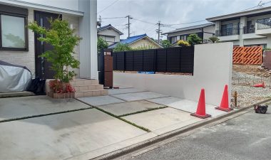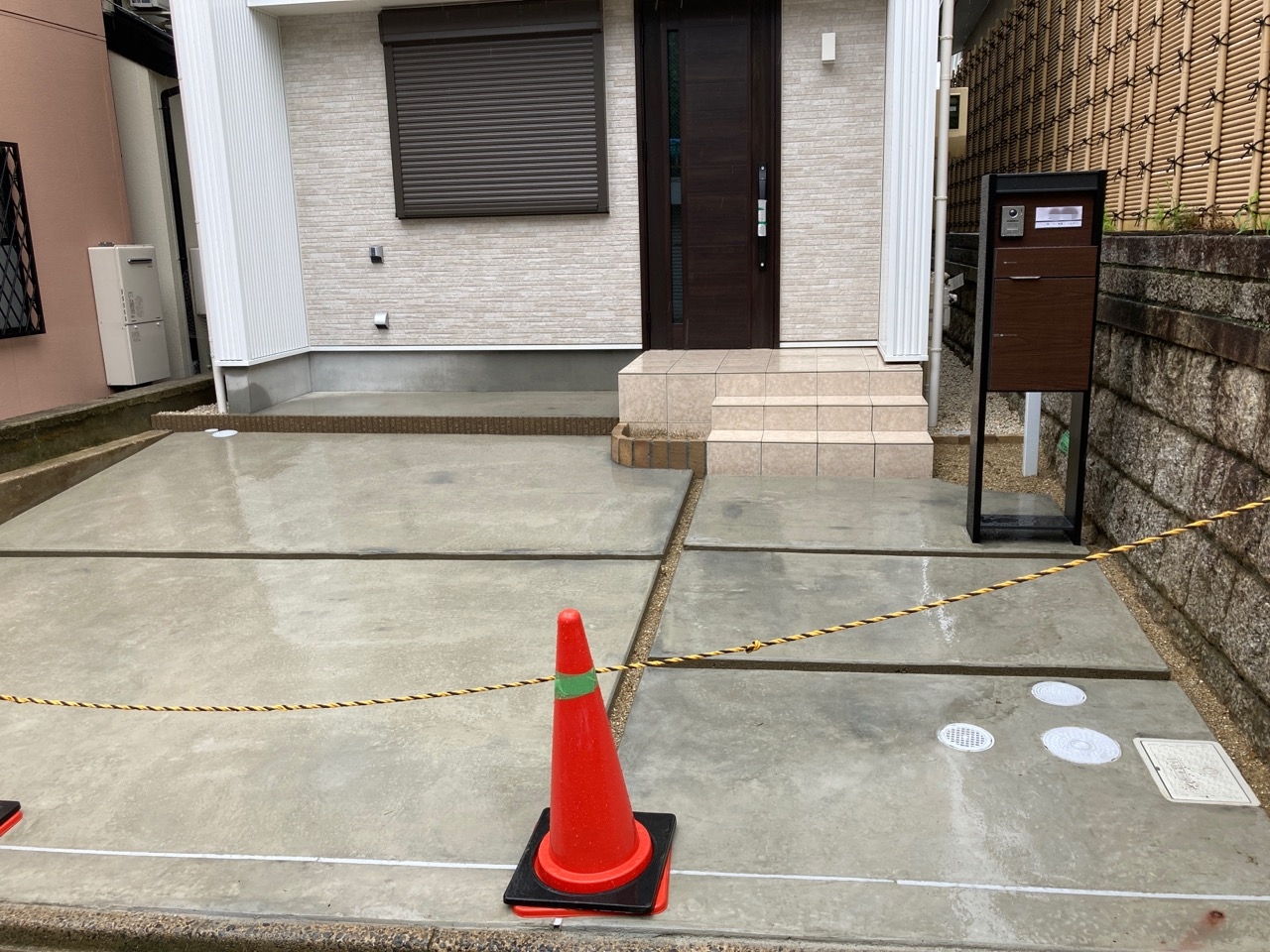 新たな駐車場の土間が敷設されました。天候の安定しないこの時期、コンクリート打設の日程も慎重にならざるを得ませんが、幸運にも雨が降る事なく打設できたようです。