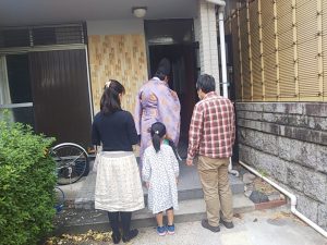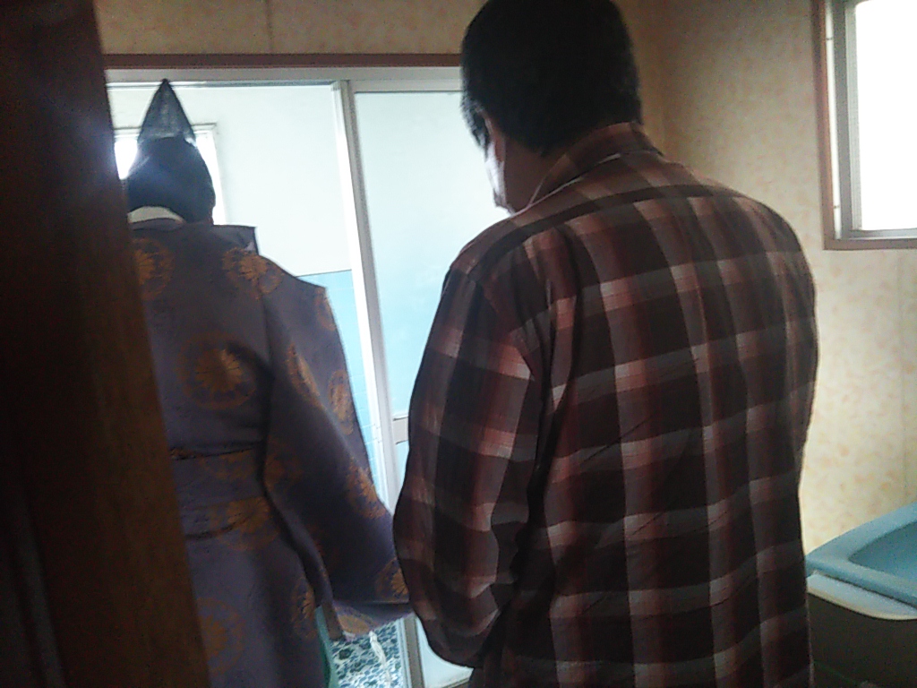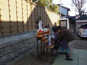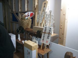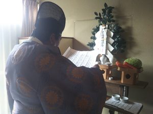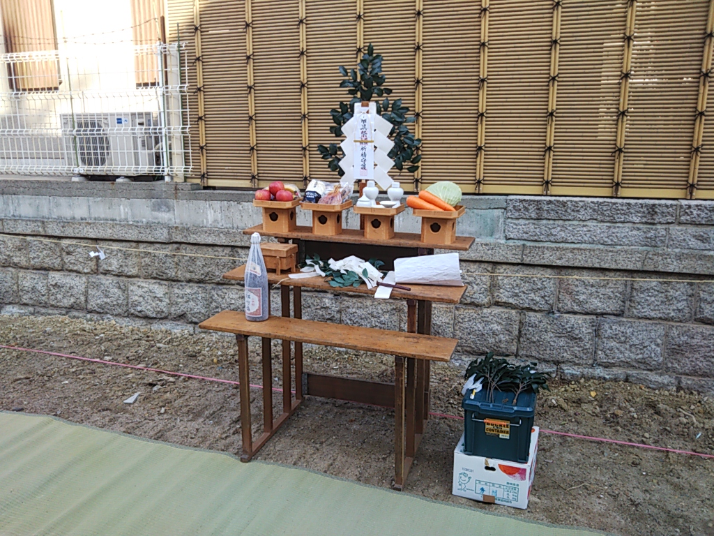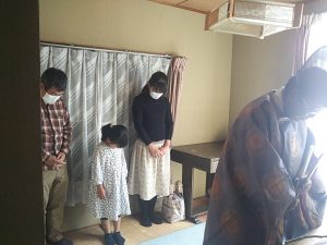 既設住宅の解体前のお祓いを行いました。屋内の一室で行いますのでそこまで広くはありませんが、祭壇やお供え物を設置してお祓いが始まります。